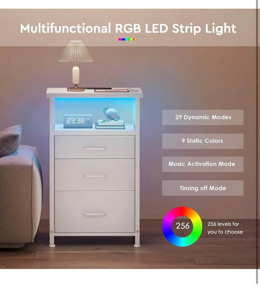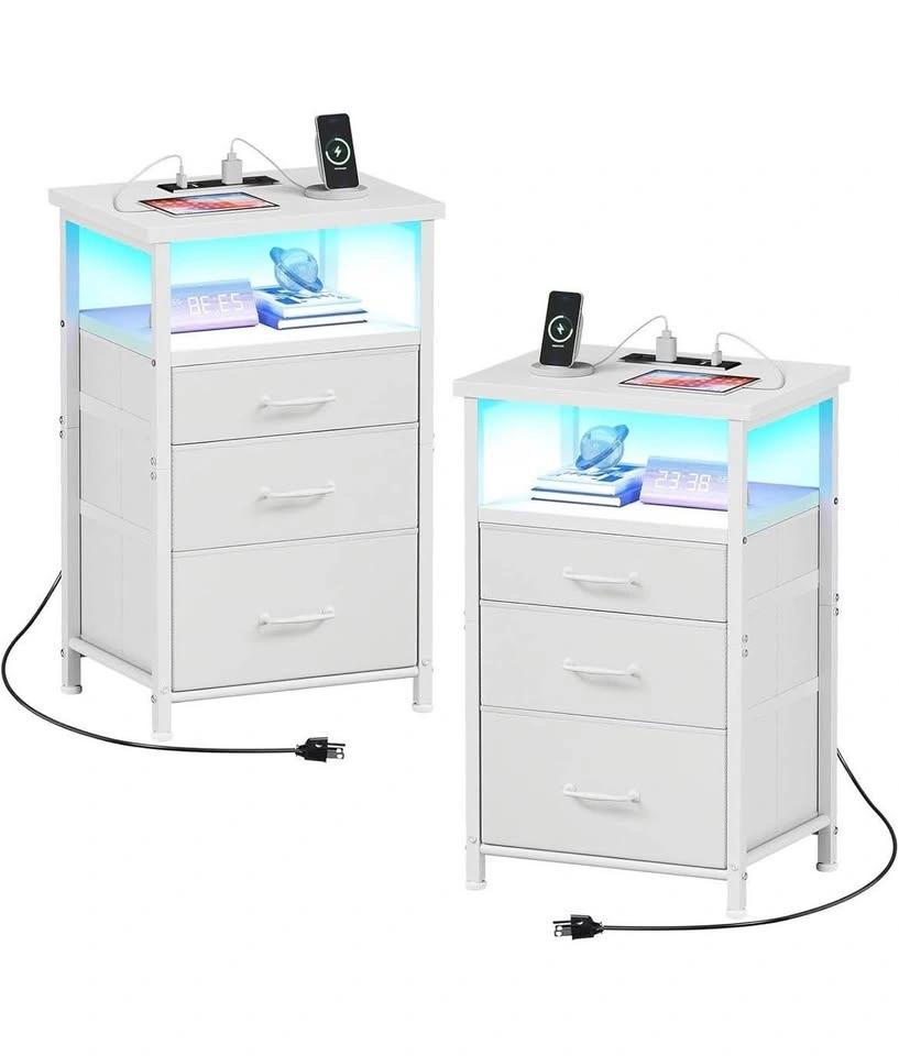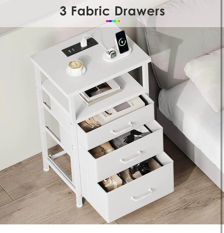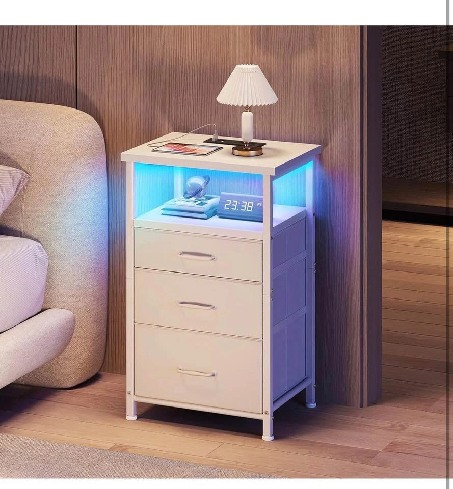Nightstand with Charging Station Set of 2, LED Night Stand with 3 Fabric Drawers, Side Table with Open Shelf, End Table with Steel Frame, 3 Drawer Dresser for Bedroom, White Comes with remote to change lights color. Brand new white color. Pickup Kitchener only.