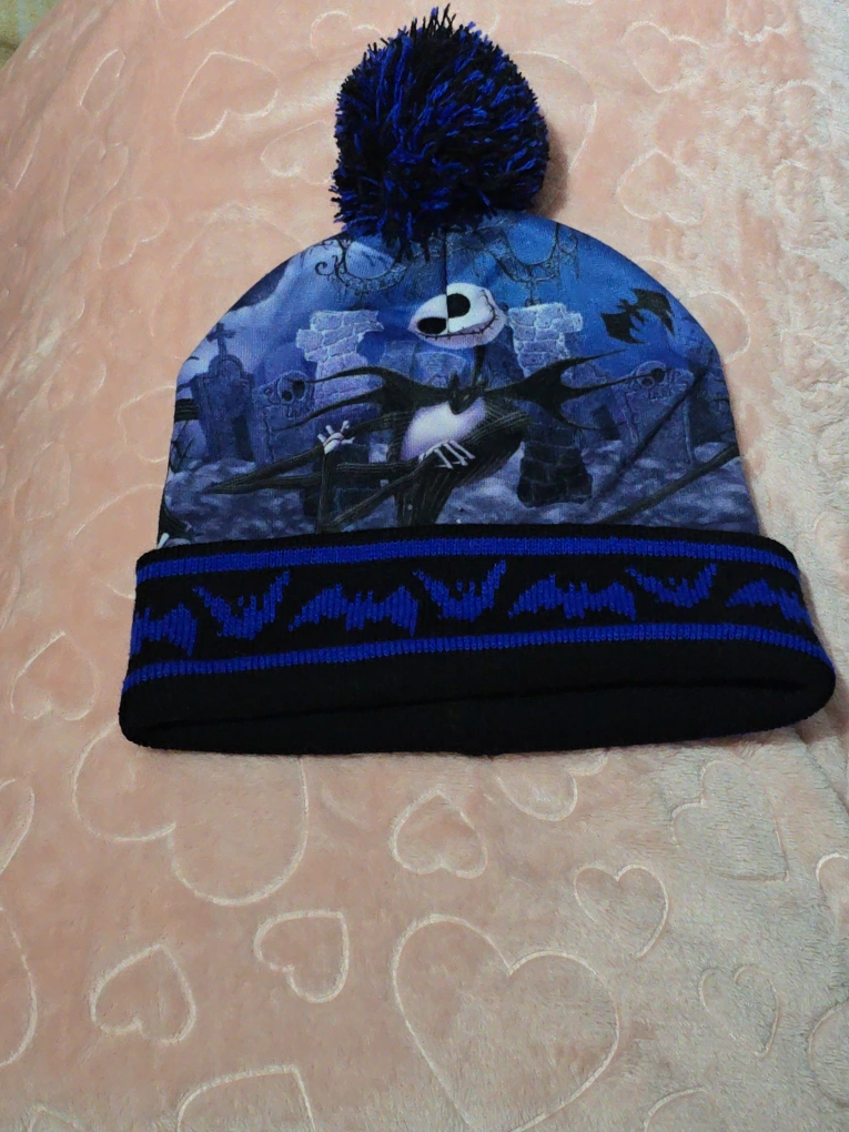 Selling a fun Nightmare Before Christmas beanie! It features Jack Skellington in a graveyard scene with a blue and black brim with bats. The beanie also has a cute blue pompom on top!