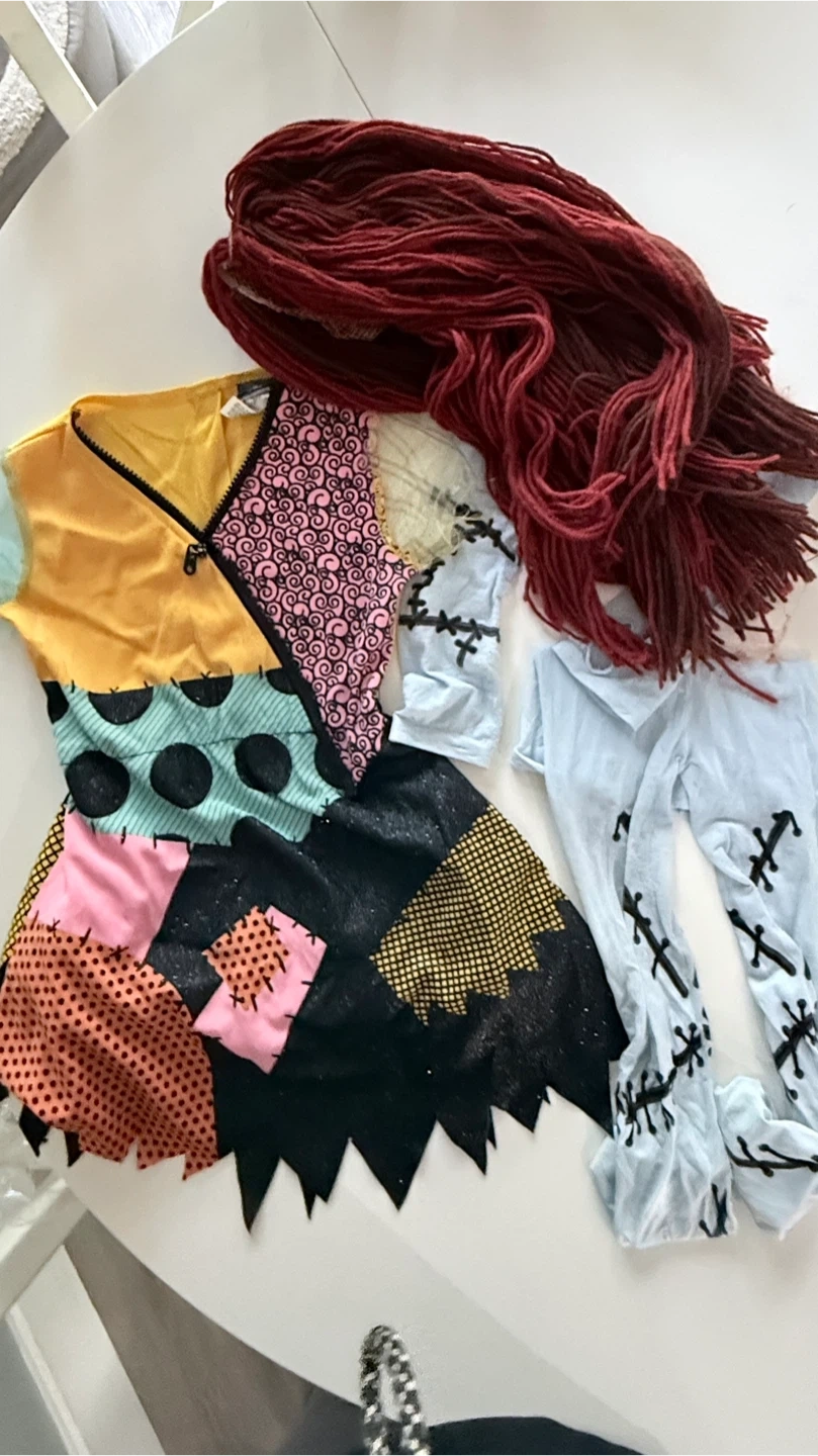 122Selling a Nightmare Before Christmas Sally costume! Includes the dress, wig, and leggings. Perfect for Halloween or cosplay! Size child small 4-6 Selling for 20.00