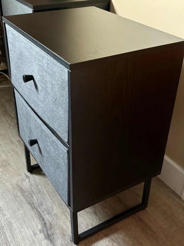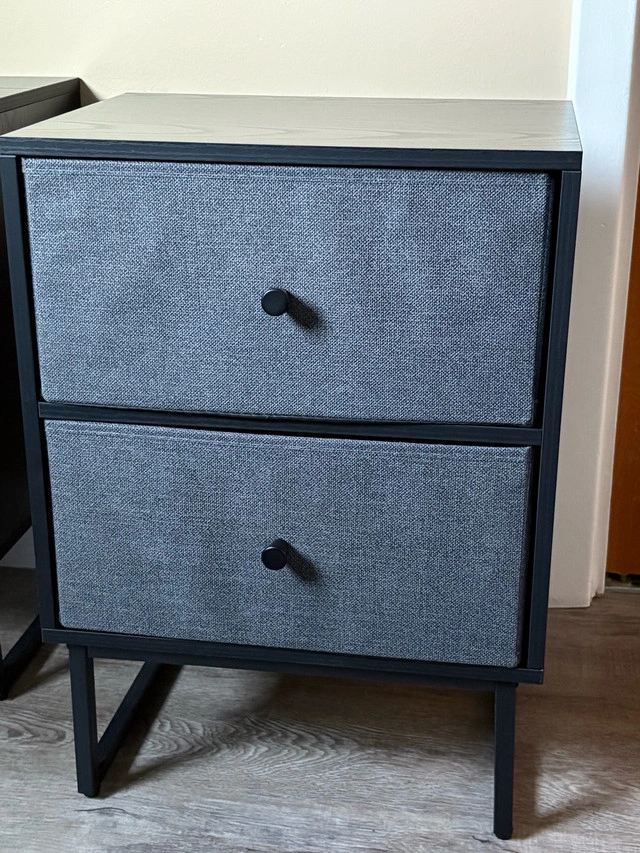 10This nightstand features two fabric drawers, perfect for adding stylish storage to your bedroom. The sleek design and sturdy construction make it a great addition to any space. This is a used item but is in great shape. * Two fabric drawers * Sturdy frame * Compact design Looking to add a touch of charm to your bedroom? This nightstand could be the perfect fit! If the ad is up, it's available! $50 each, or $90 for 2.