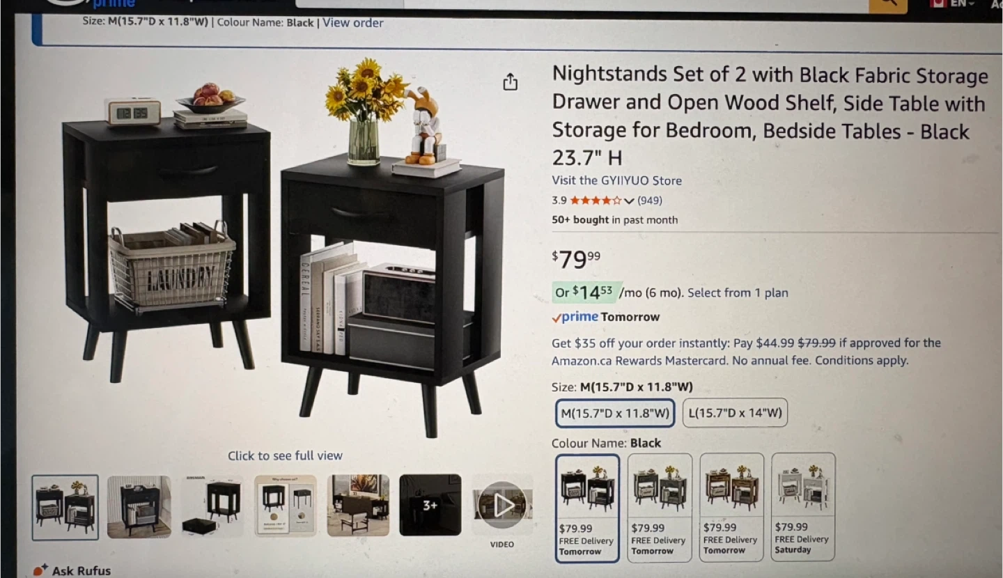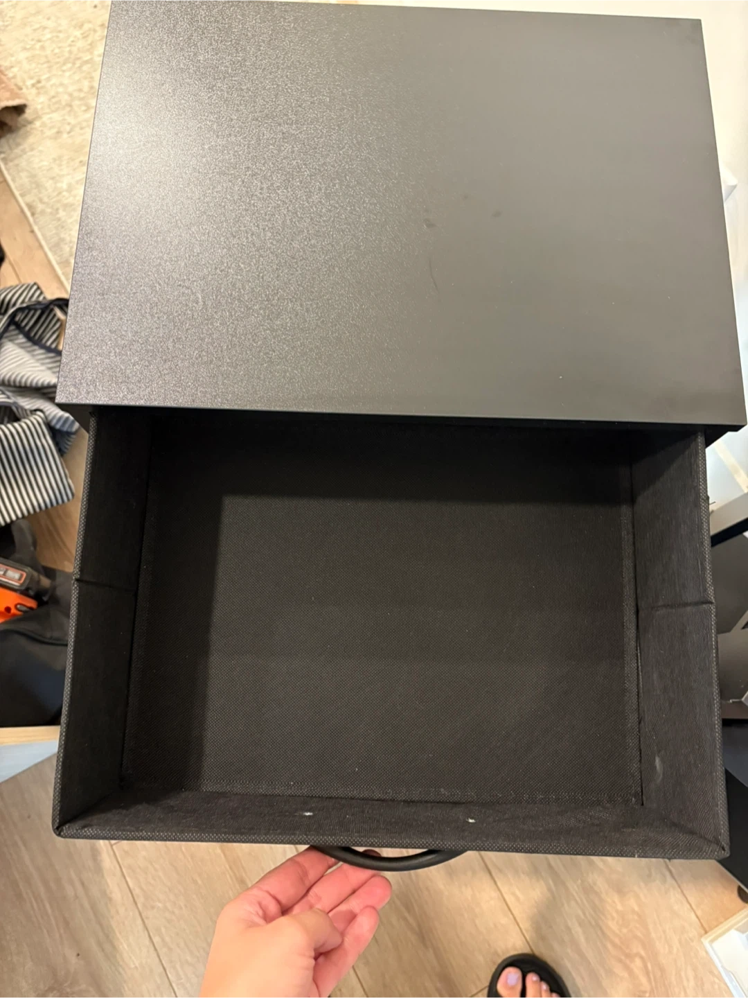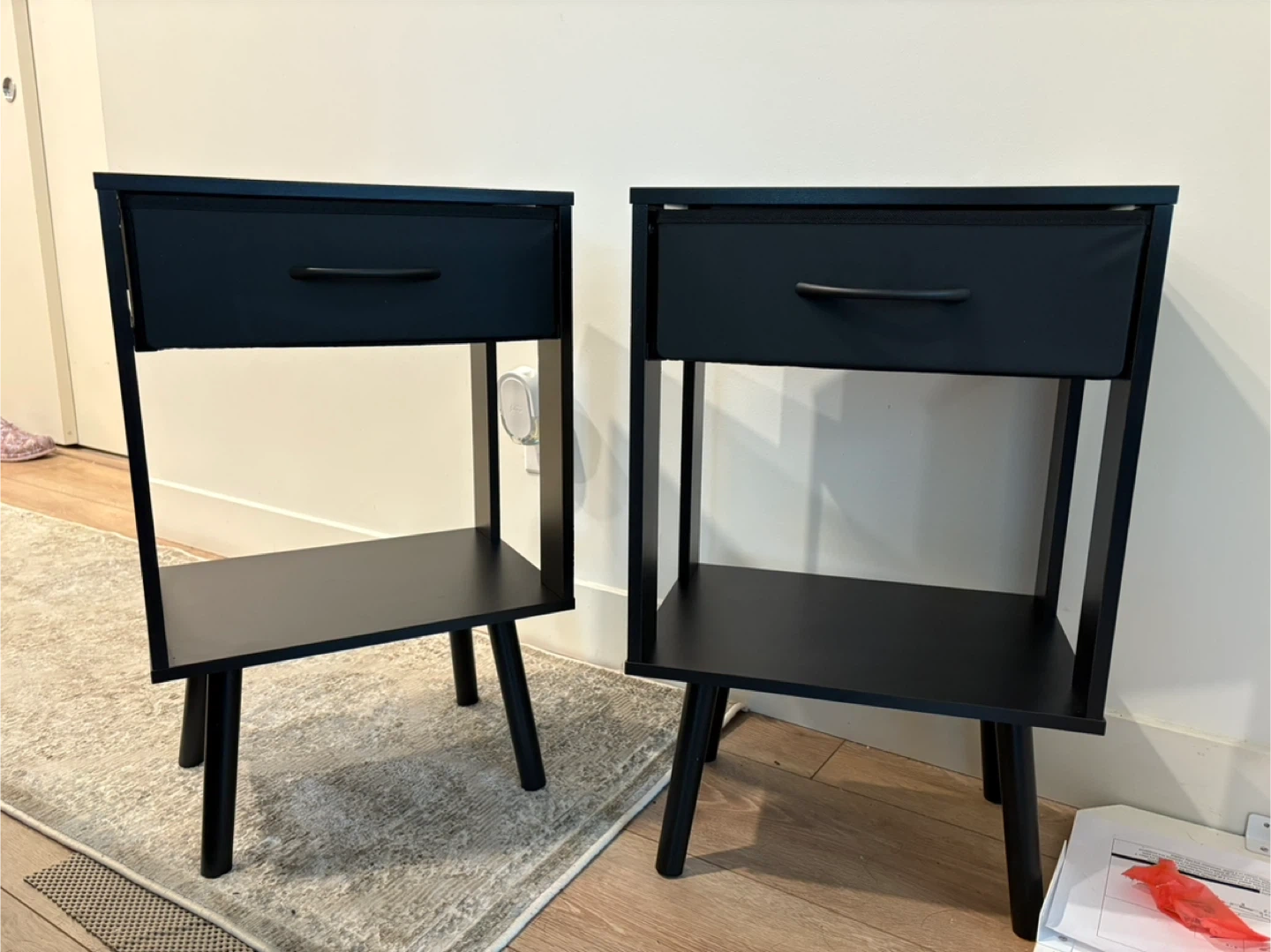 Brand new, only used for 2 weeks but they are too small for me. It’s a set of two nightstands with a black fabric drawer and an open shelf. One of them arrived from Amazon with a small chip, see picture. Dimensions are 15.7"D x 11.8"Wx23.7H