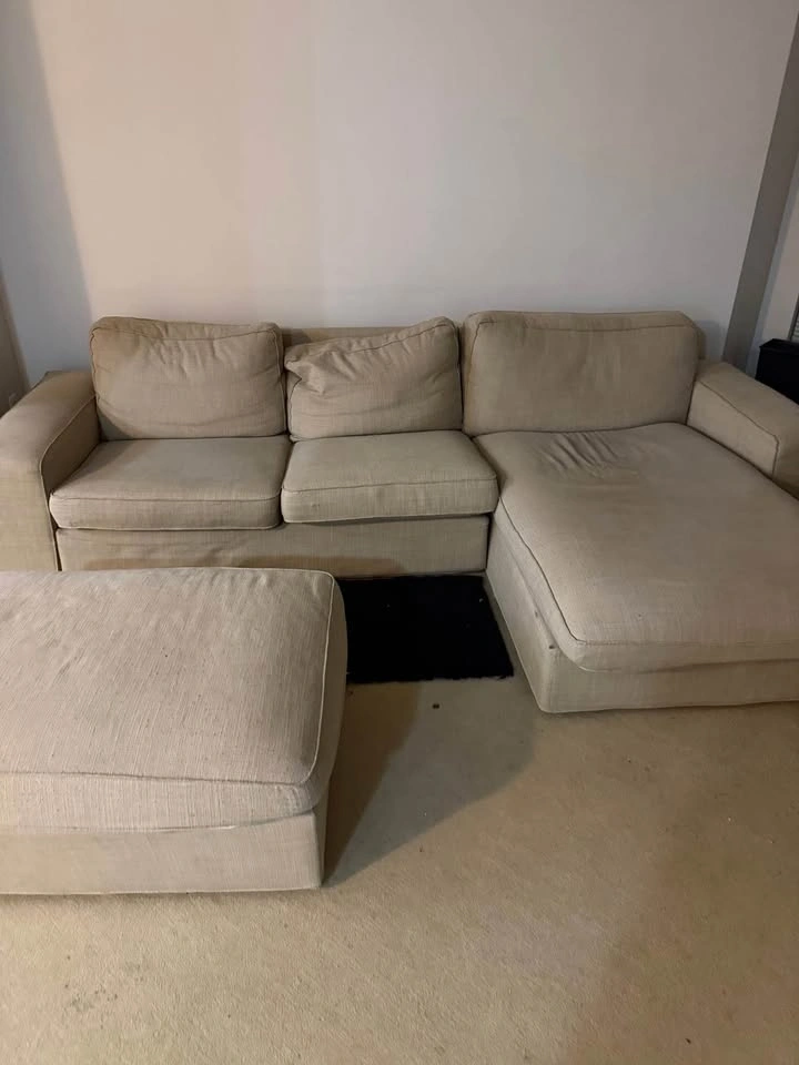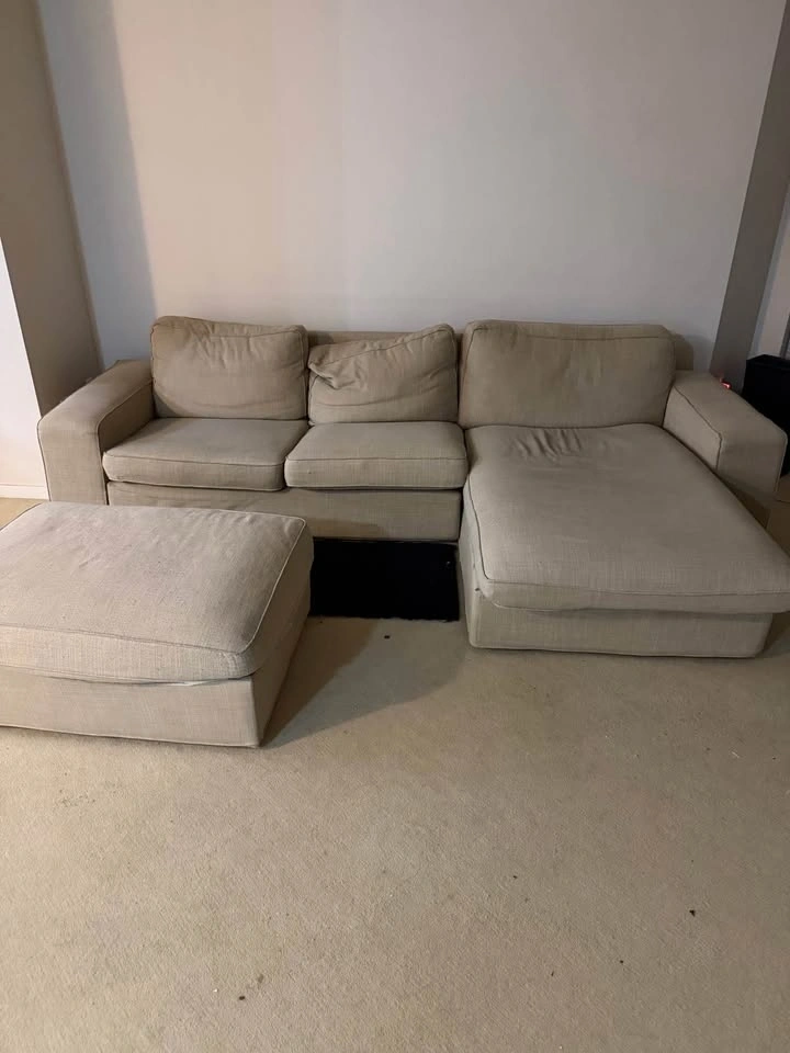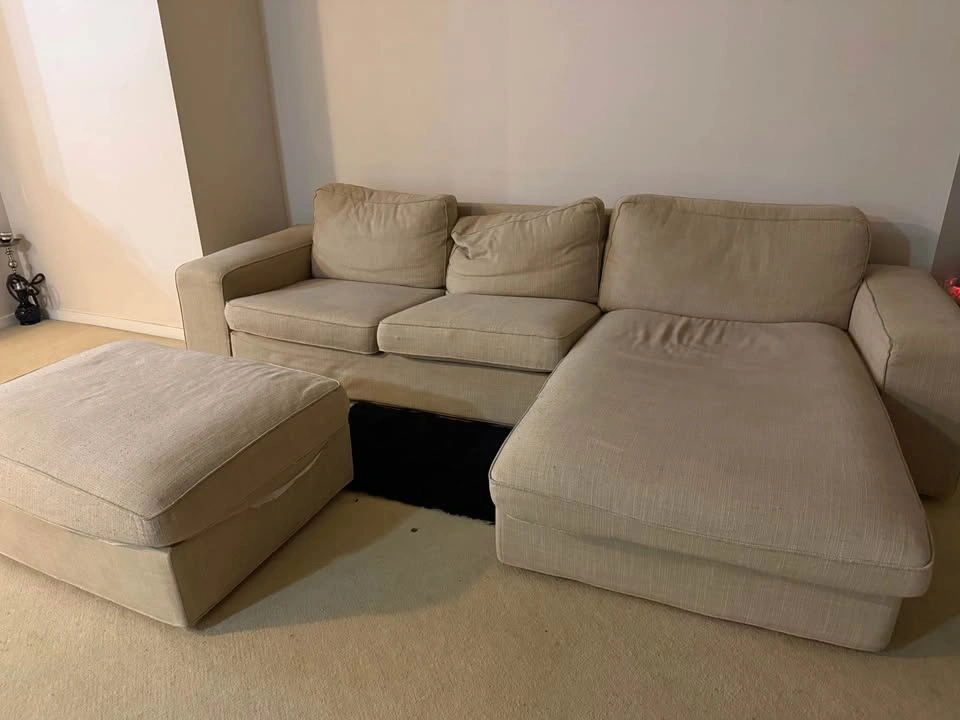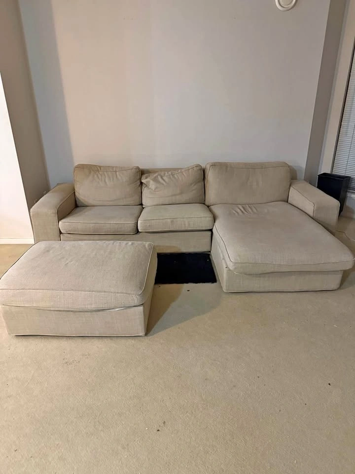 Selling a comfortable beige sectional sofa with chaise and matching ottoman. Perfect for living rooms or apartments. Includes ottoman. Neutral beige color (matches any decor). Very spacious and comfortable.