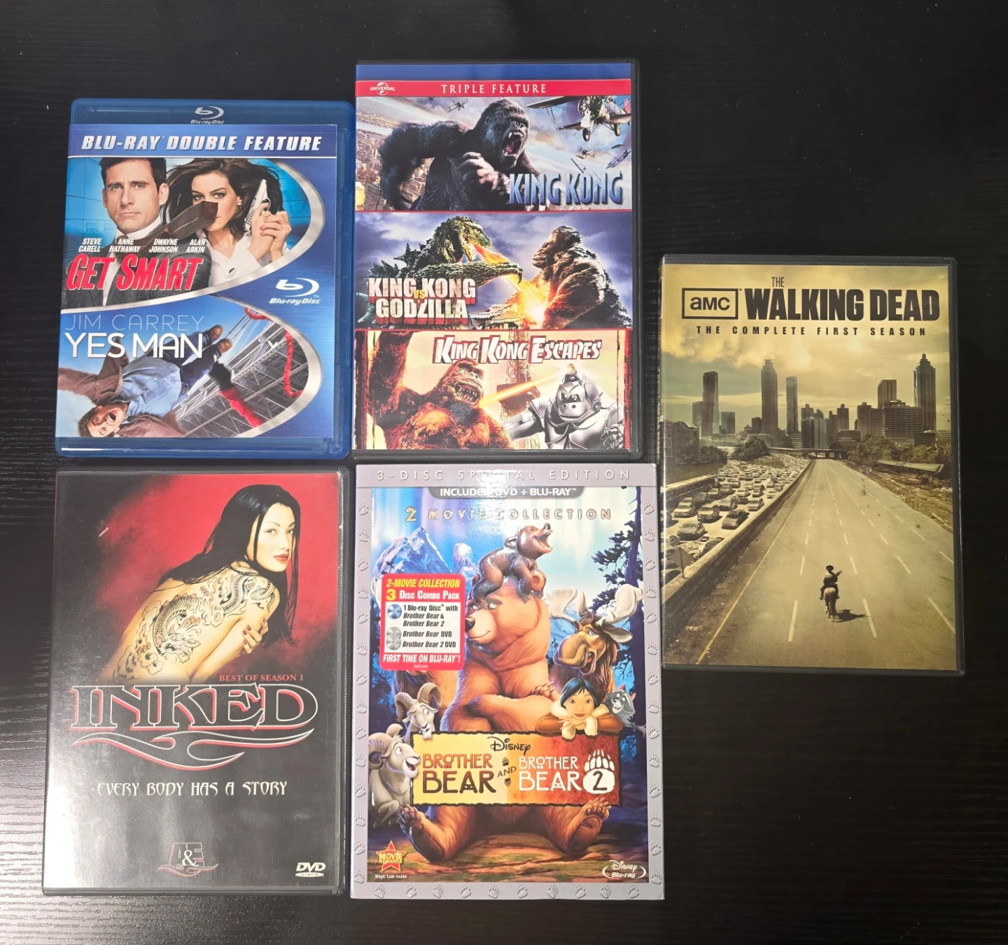 This collection includes 'Get Smart' Blu-Ray Double Feature, 'King Kong' Triple Feature with King Kong vs. Godzilla and King Kong Escapes, 'The Walking Dead' Complete First Season DVD, 'Inked' Best of Season 1 DVD, and a 3-Disc Blu-Ray/DVD combo of Disney's 'Brother Bear' and 'Brother Bear 2'. It's a diverse mix of action, monster movies, drama, and animated features.