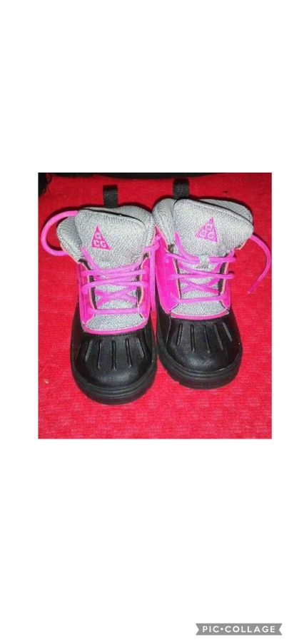 10Cute pair of Nike ACG toddler boots in size 6! They feature a black rubber bottom with pink and grey accents. Perfect for keeping little feet warm and dry New Toddler Nike ACGs no box $25 firm Pick up only. cash only. Size 8C
