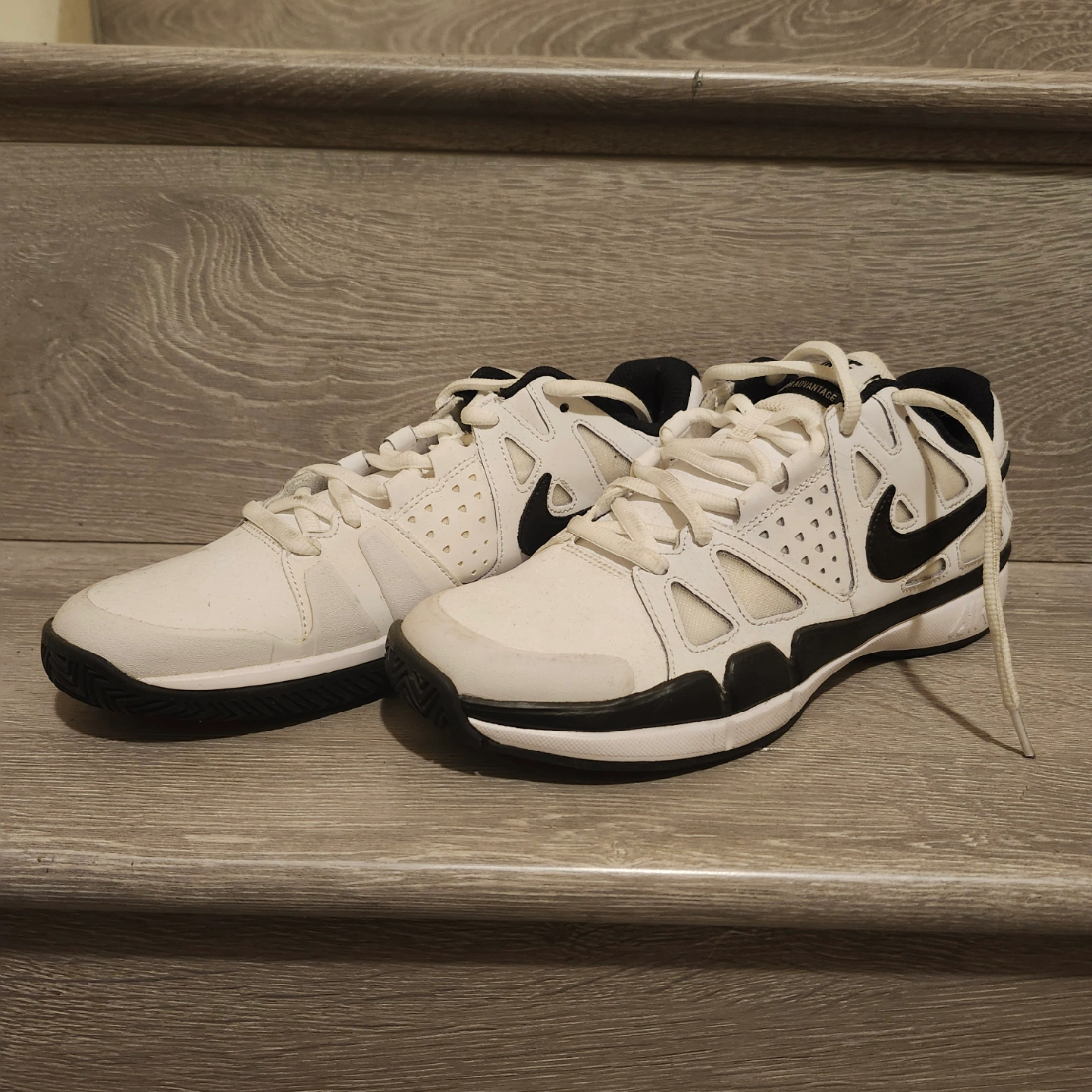 Selling a pair of Nike Advantage tennis shoes in white and black. They are in good condition and ready for the court or casual wear!