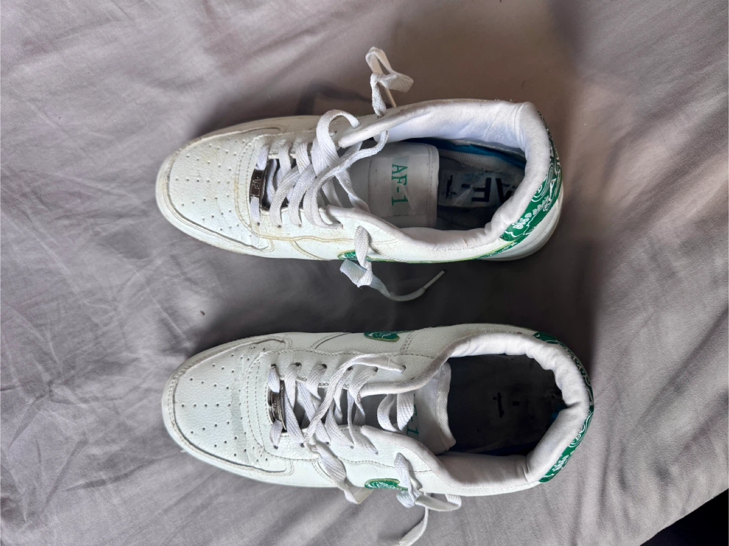 54Nike AF1 Shoe. The shoe is not new, worn multiple times. The inner sole is torn, hence the price. You can buy a new sole and use it though. If interested, address is Wellesley and Church. Thank you !