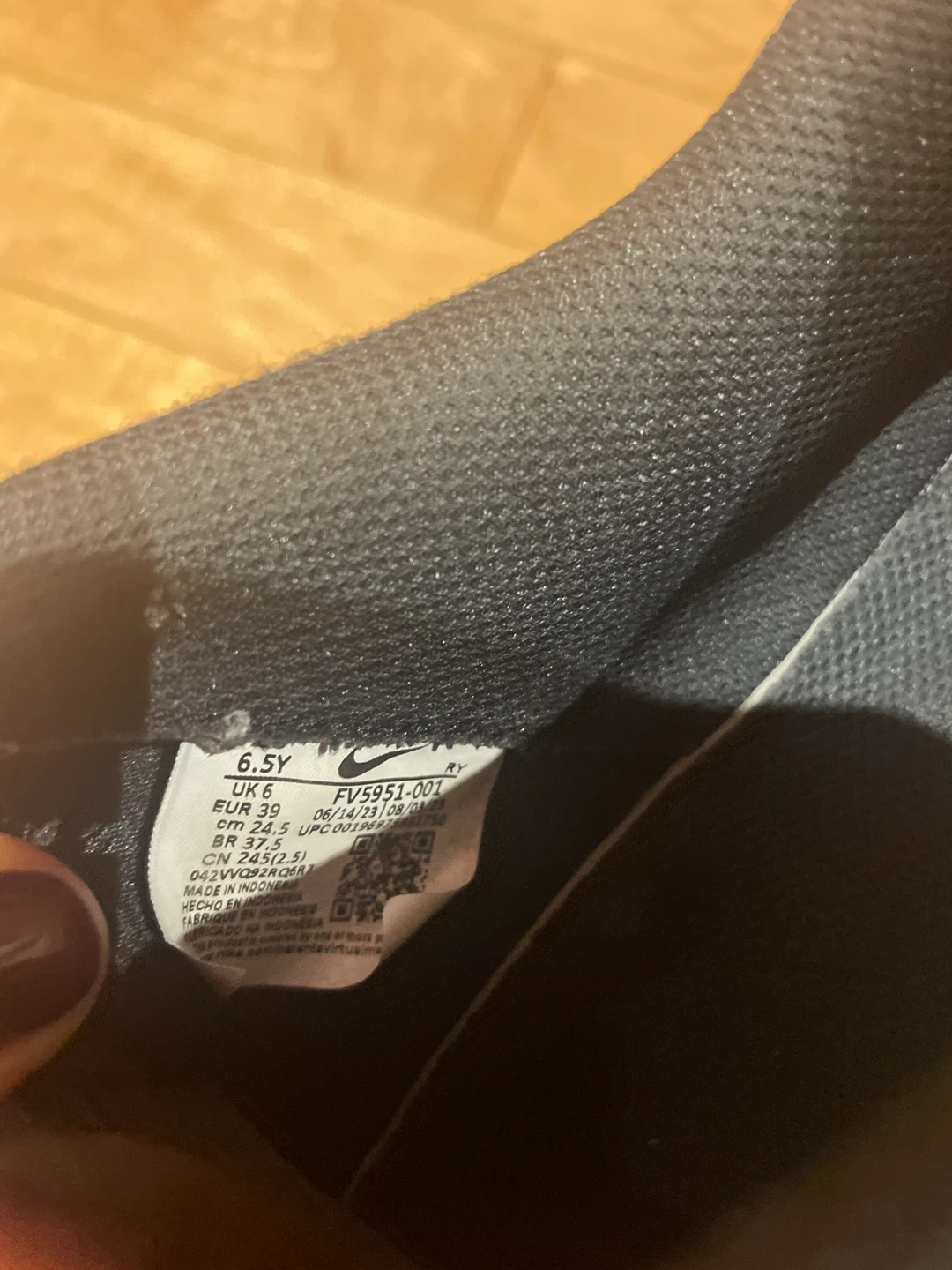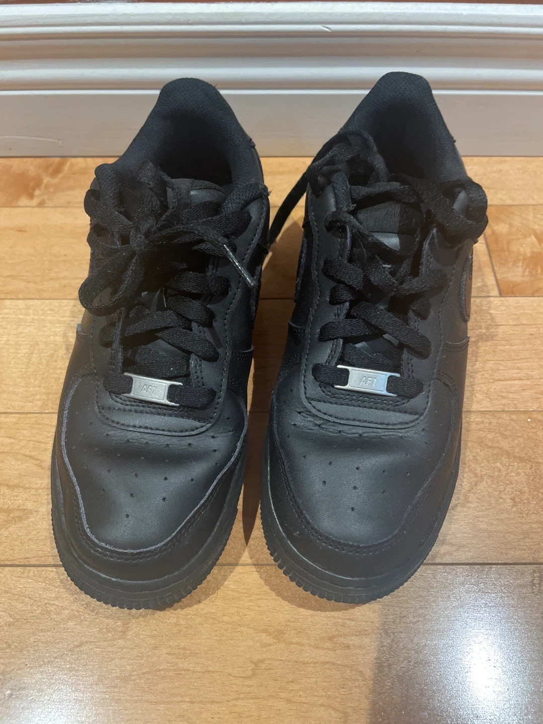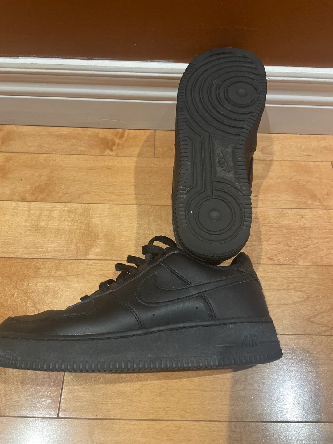 26Selling a pair of Nike Air Force 1 in black! The size is 6.5Y. They have an 'AF1' detail on the laces.