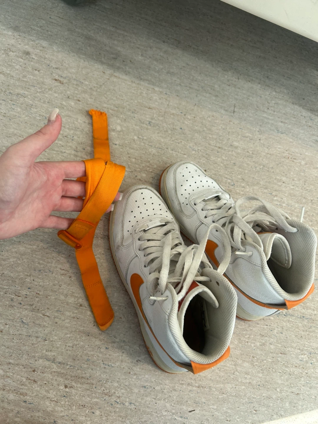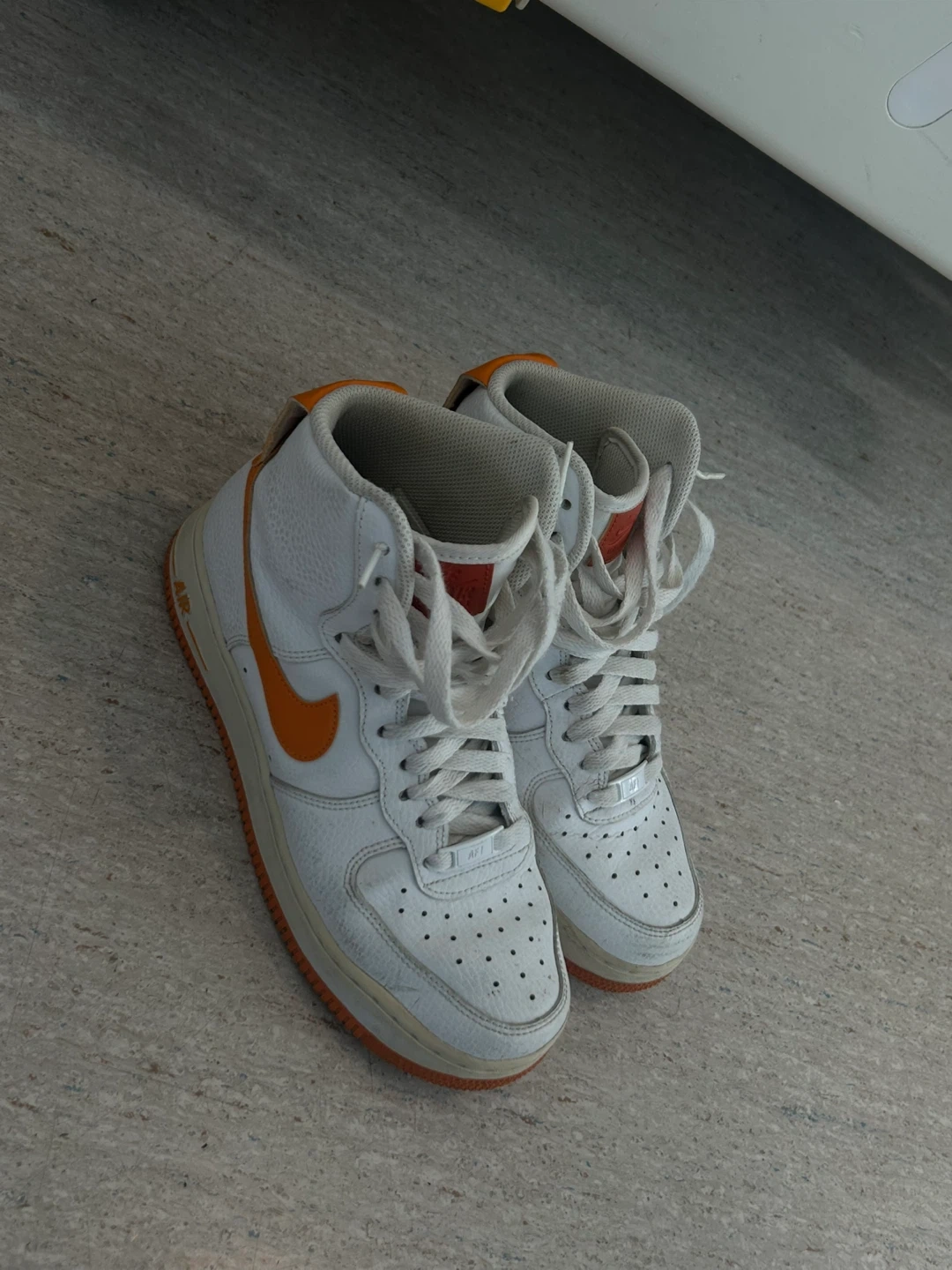 15Selling a pair of Nike Air Force 1 High '07 shoes! They are a size 8 in US sizing. The shoes are white with orange accents. They are in used condition, as shown in the photos.