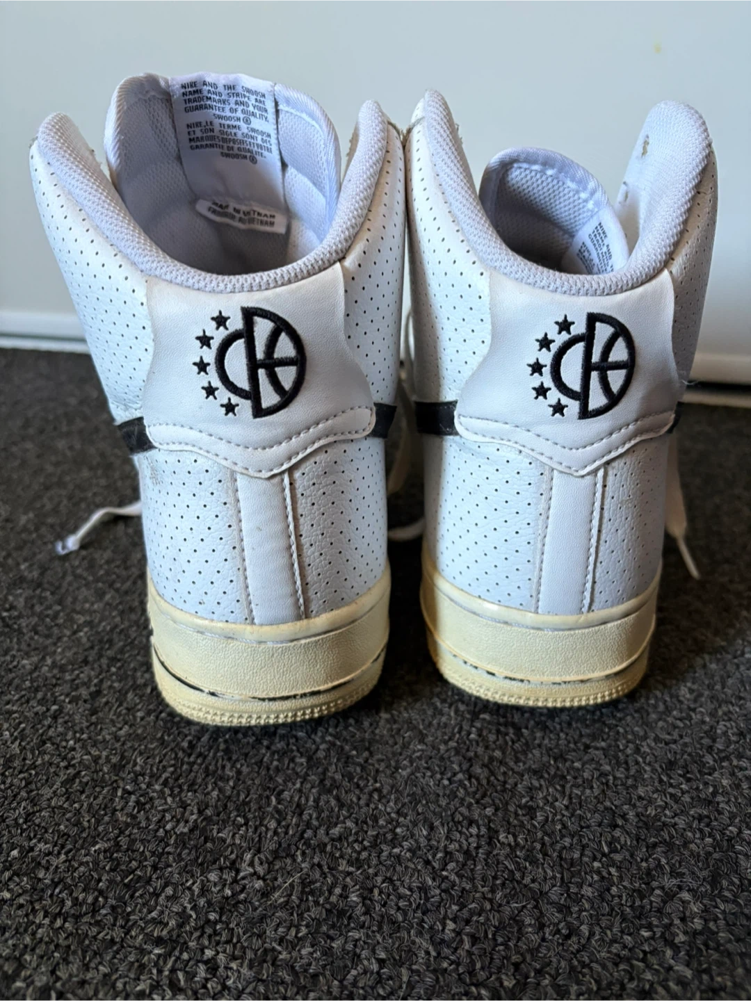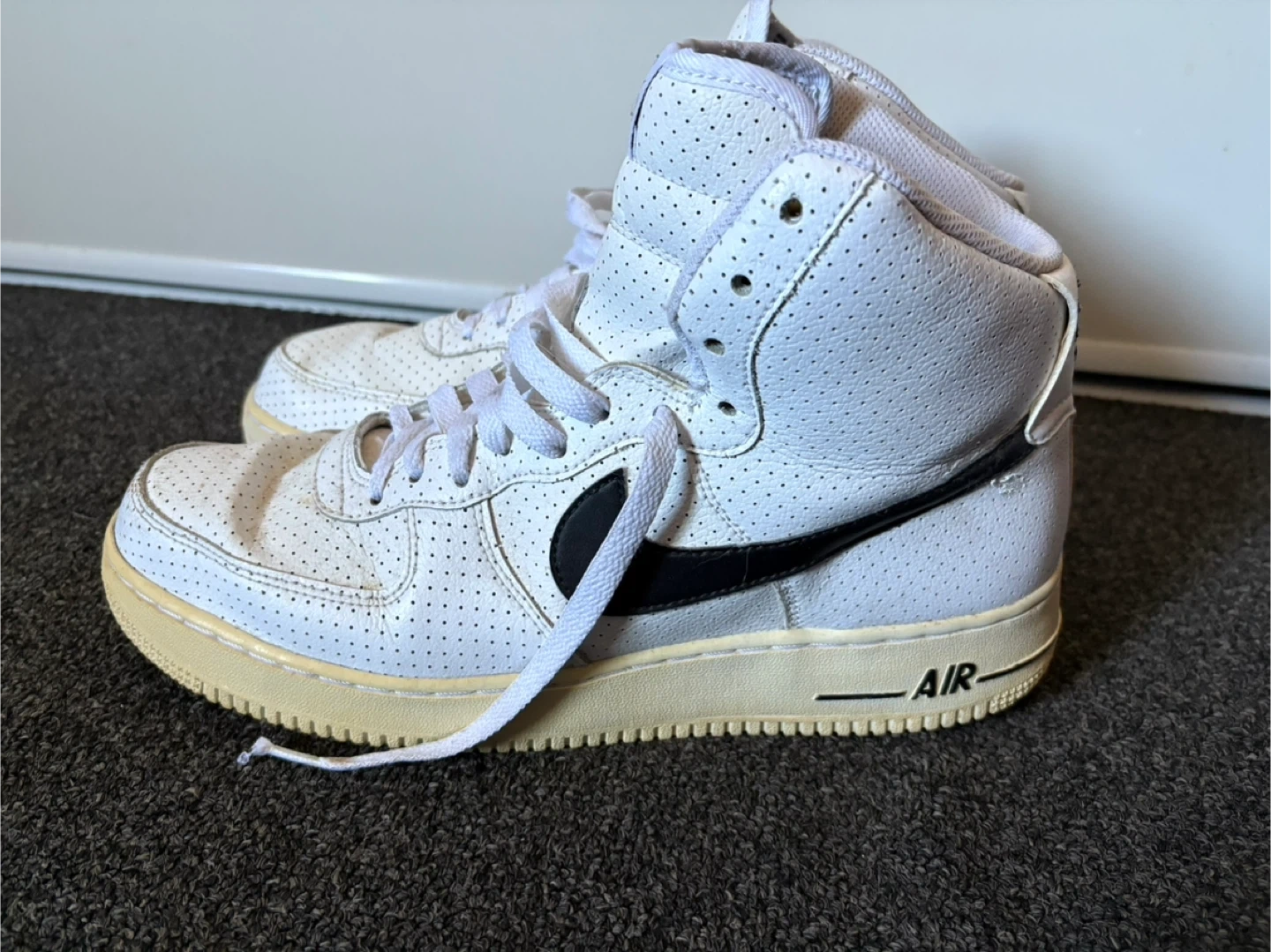 Selling a pair of perforated Nike Air Force 1 High '07 sneakers in white, size 11. They show some signs of wear but still have lots of life left. Classic style and comfortable fit! $25!