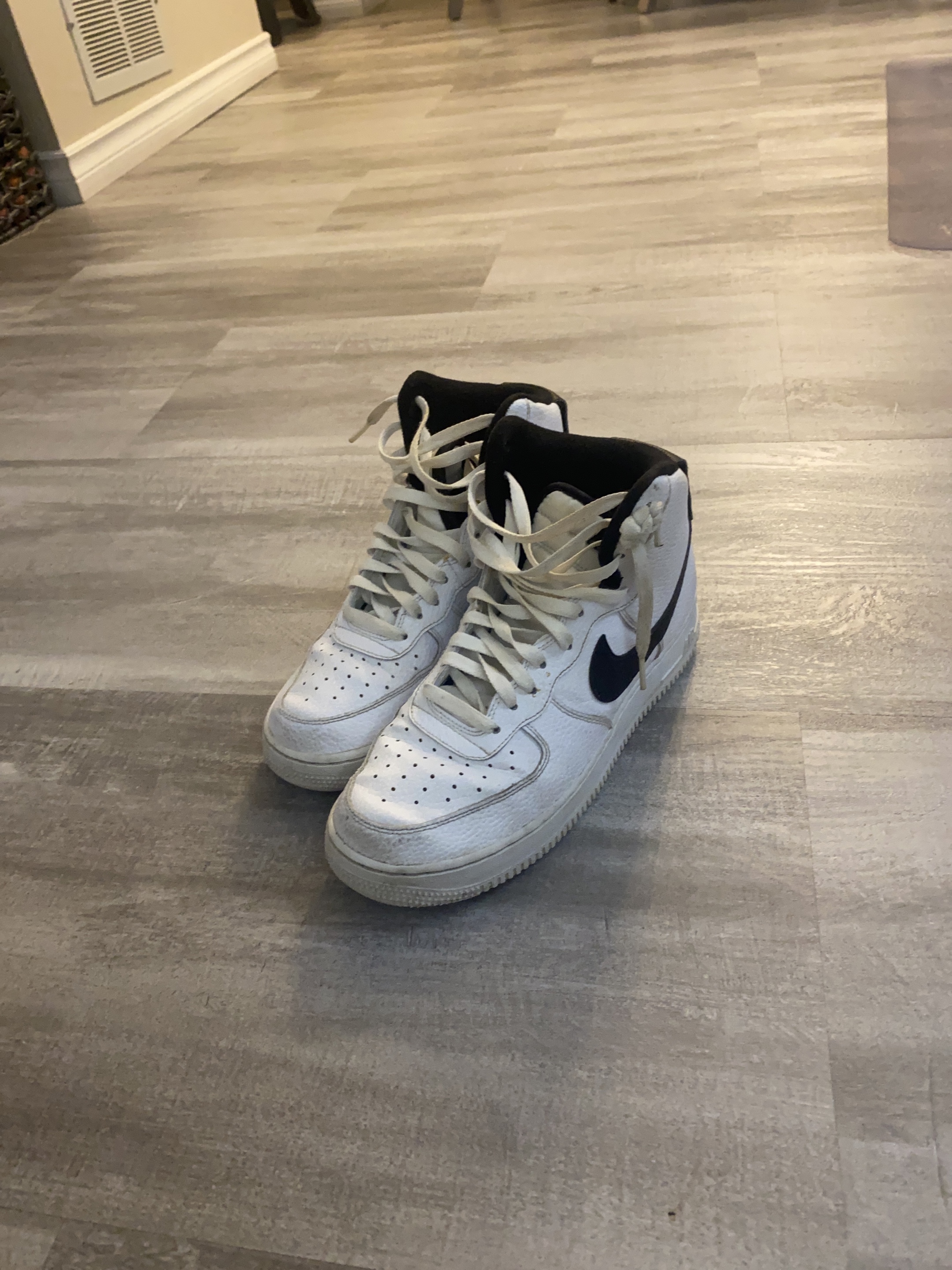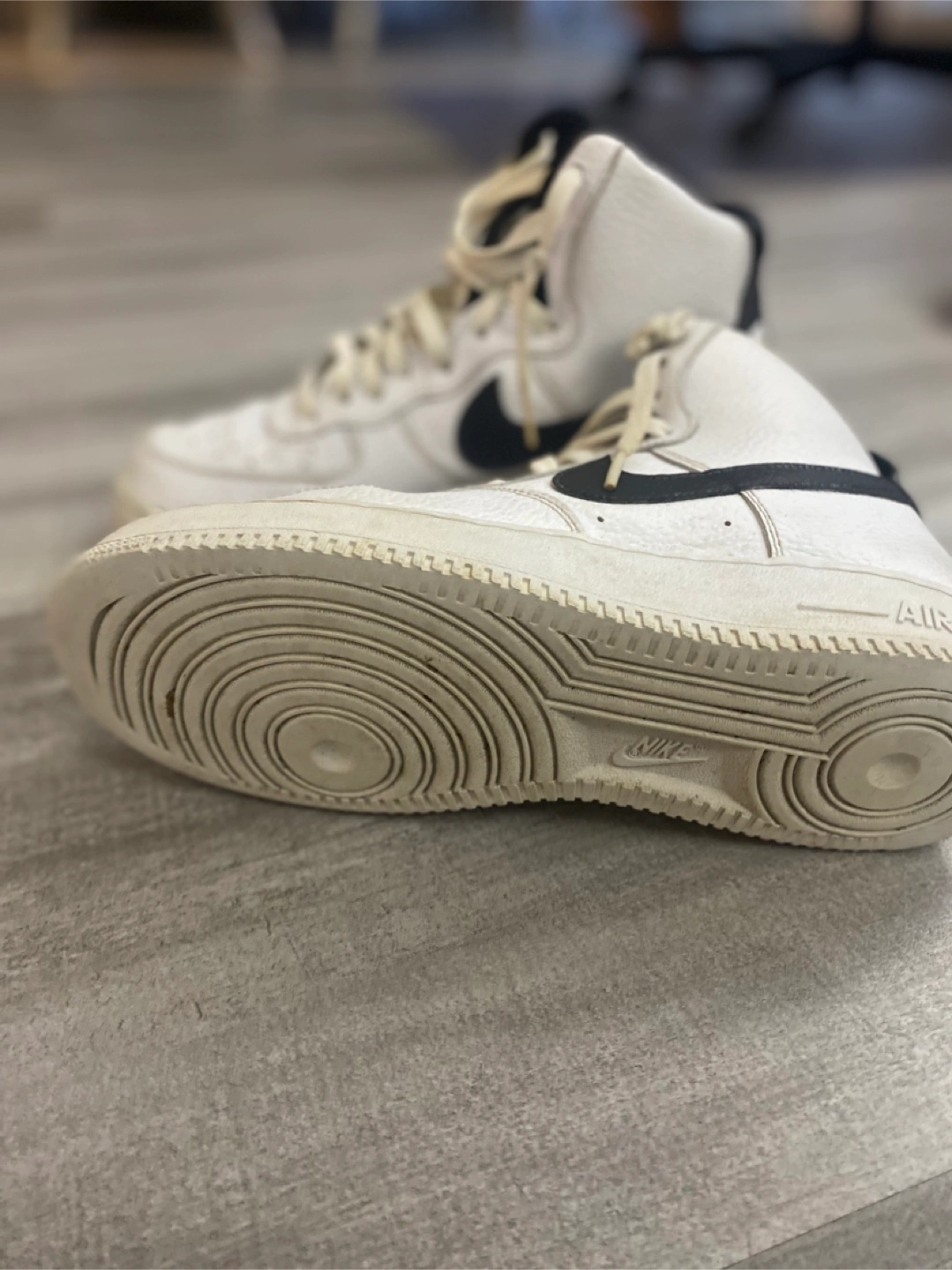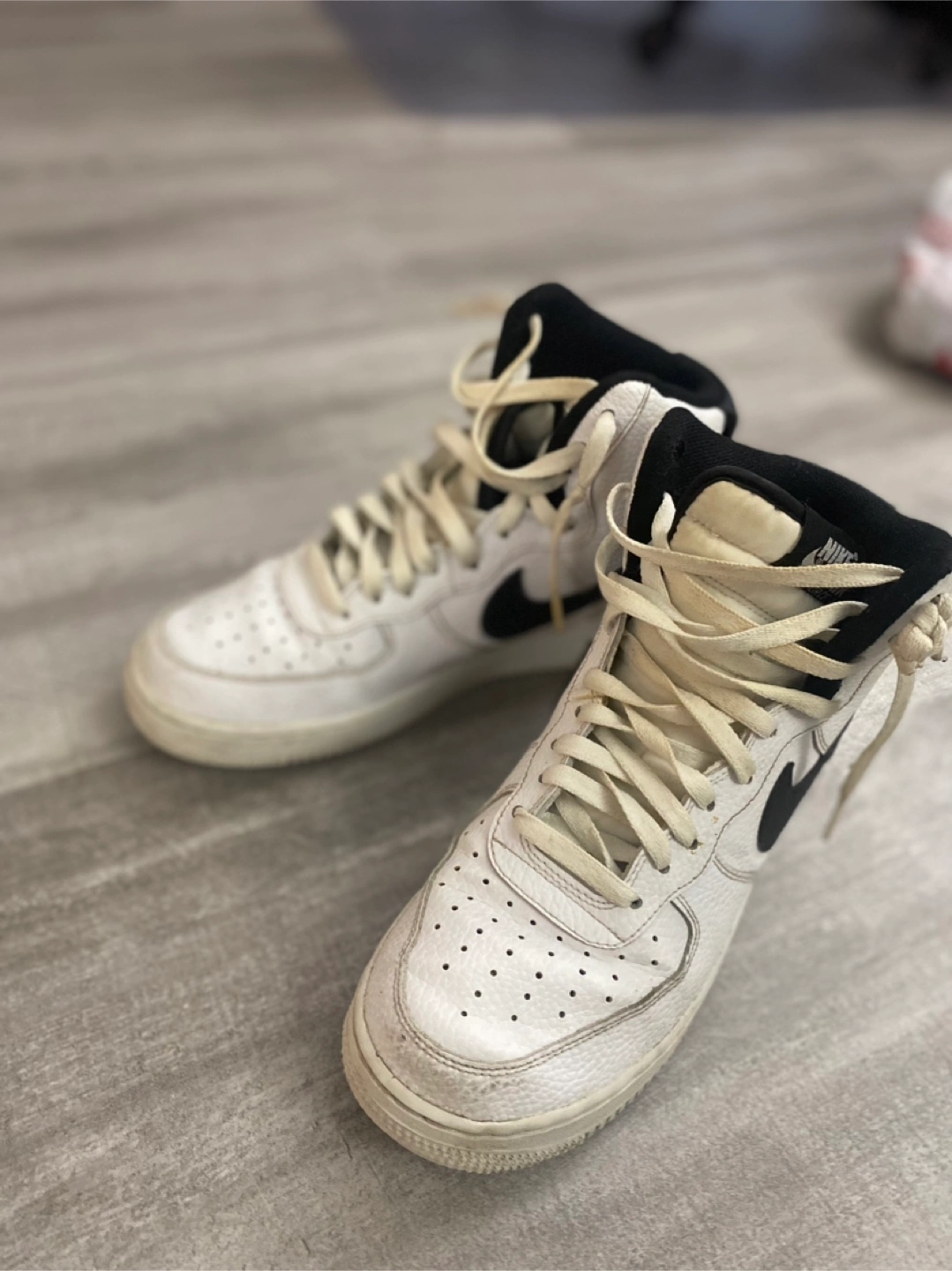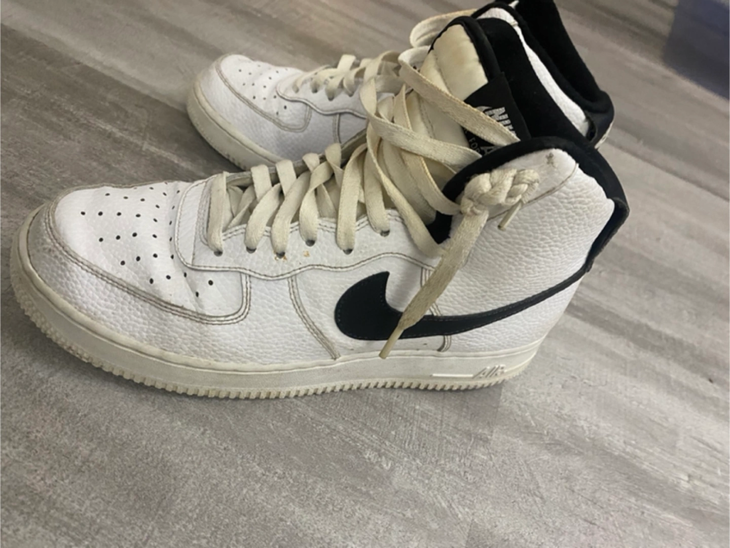 5Classic high-top sneakers in white. Features a black swoosh logo and black accents. White laces and soles, with visible signs of wear. A great way to elevate your everyday style with comfort and ease.