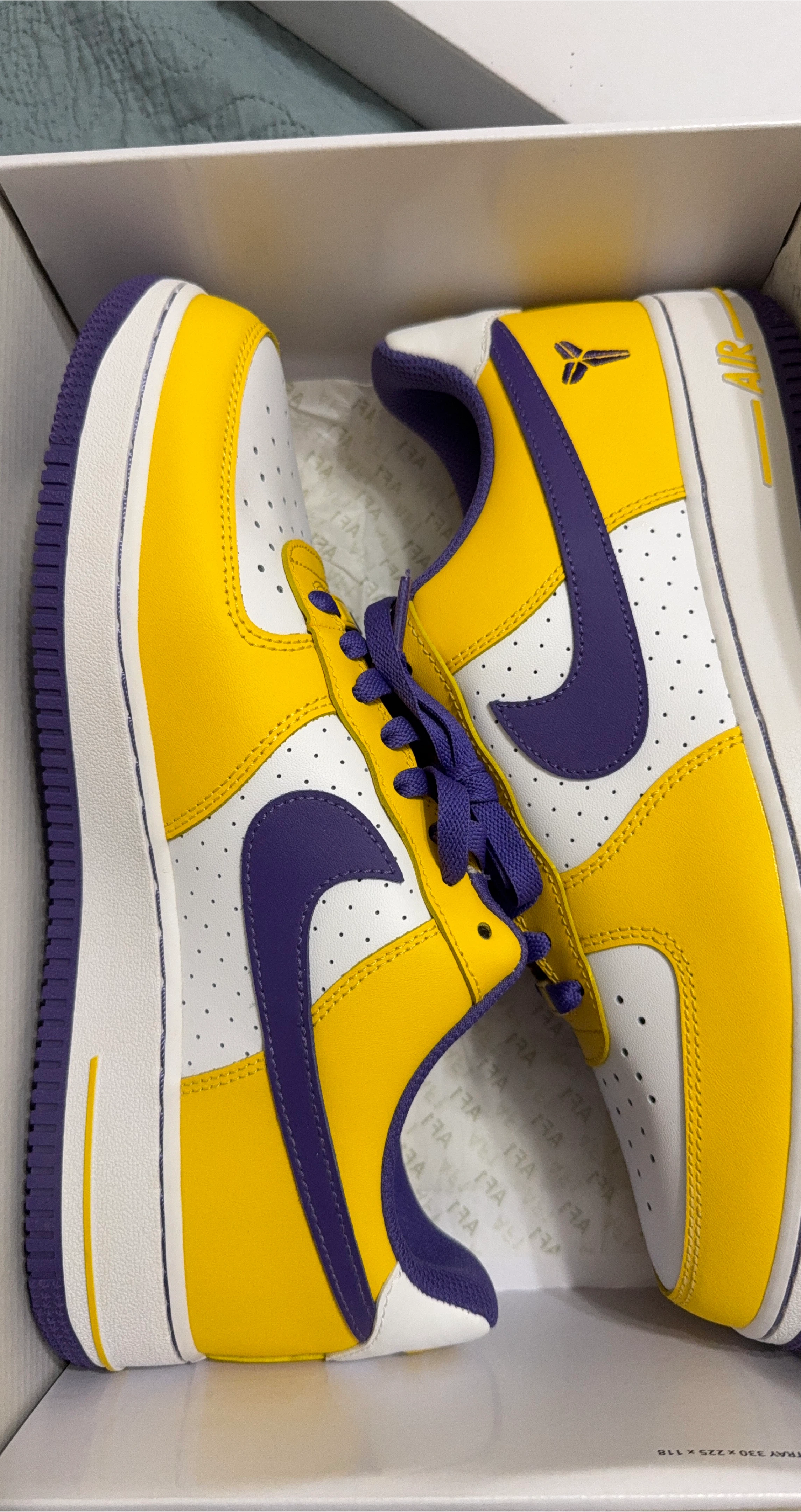 10Here are some Nike Air Force 1 Low sneakers, inspired by Kobe Bryant and the LA Lakers! The shoes are yellow, white, and purple. They come with the original box!