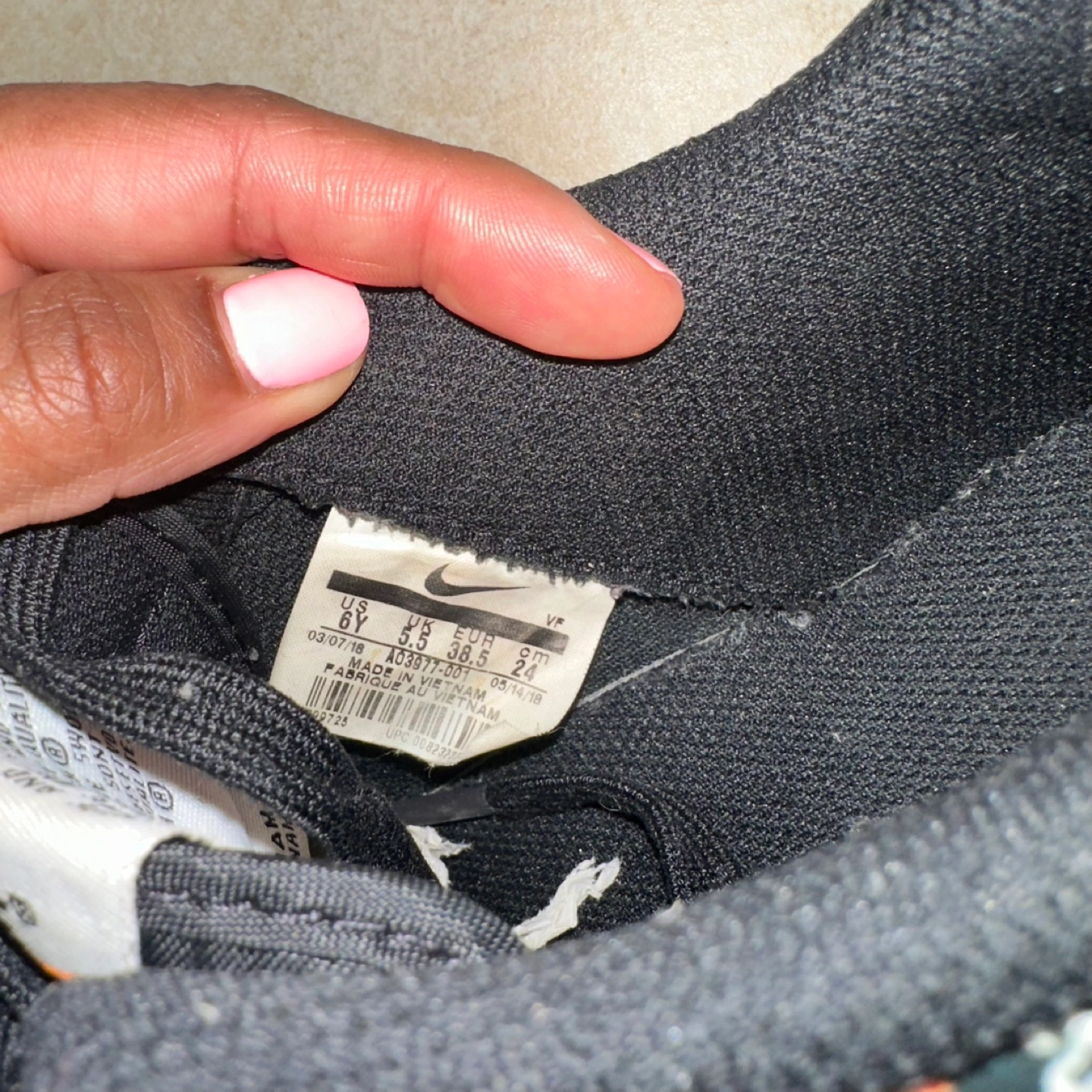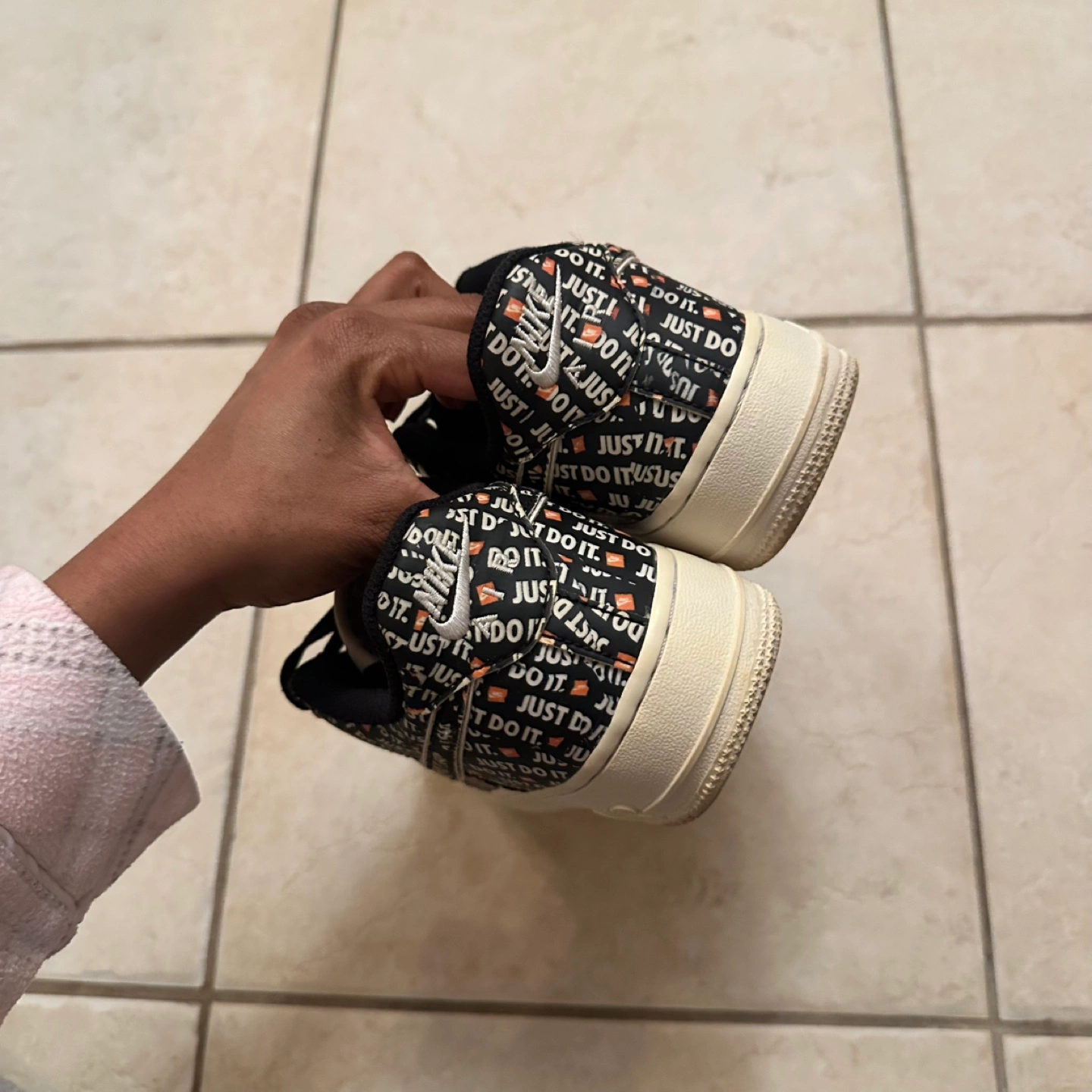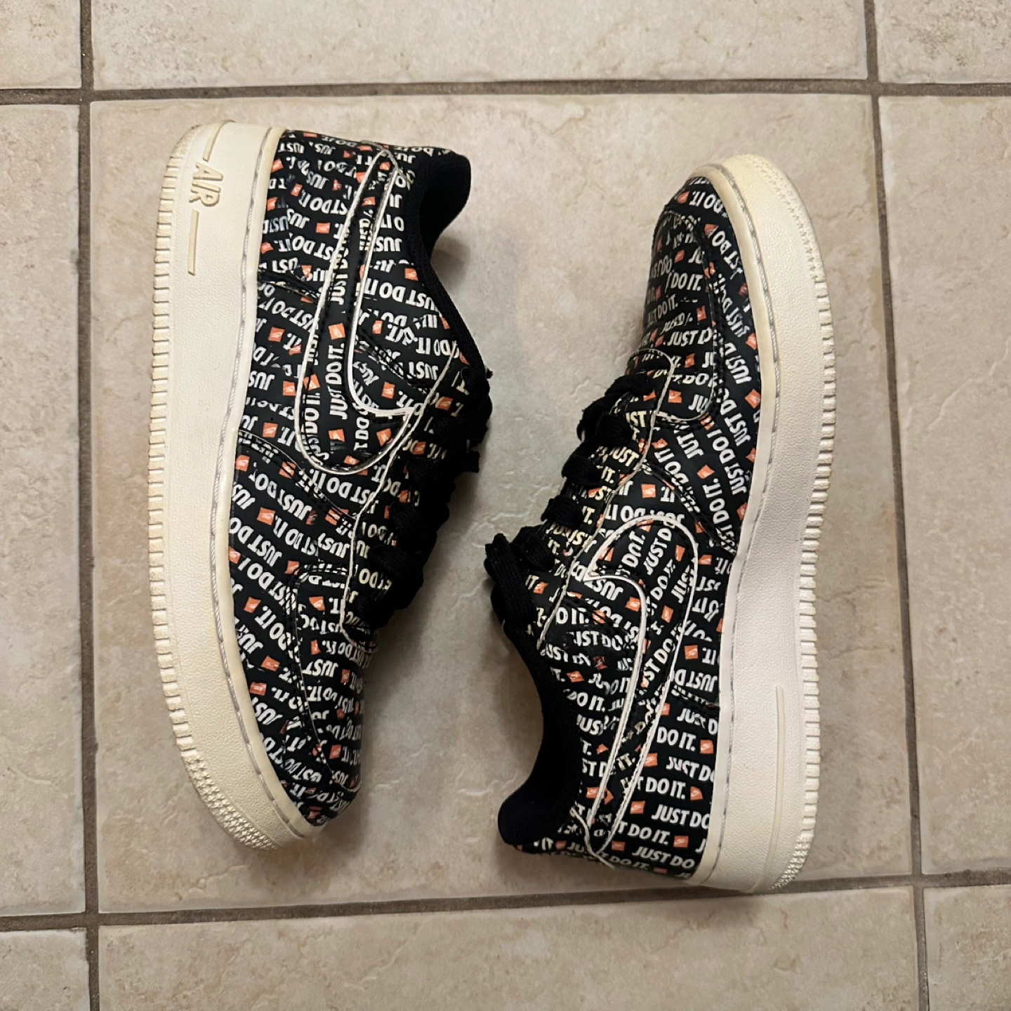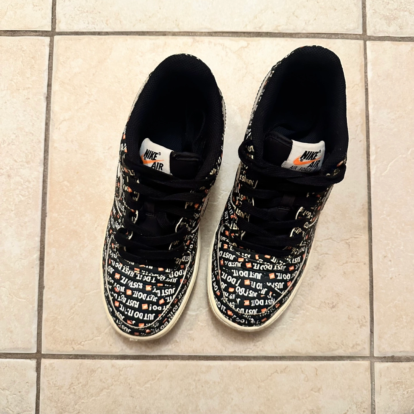 399Pre-owned Nike Air Force 1 sneakers. Youth size 6Y. Black and orange 'Just Do It' print. Cream midsole. Minor wear. - I recently got them professionally cleaned, little yellow on the bottom sole remains - no rips,smells - good condition - may fit a little looser than its original size - Haven’t seen this JDI style in so long!! - Nike never dropped a collection like this since! ✔️ - the sole looks cream coloured now, it’s giving golden goose flex🪿 lol