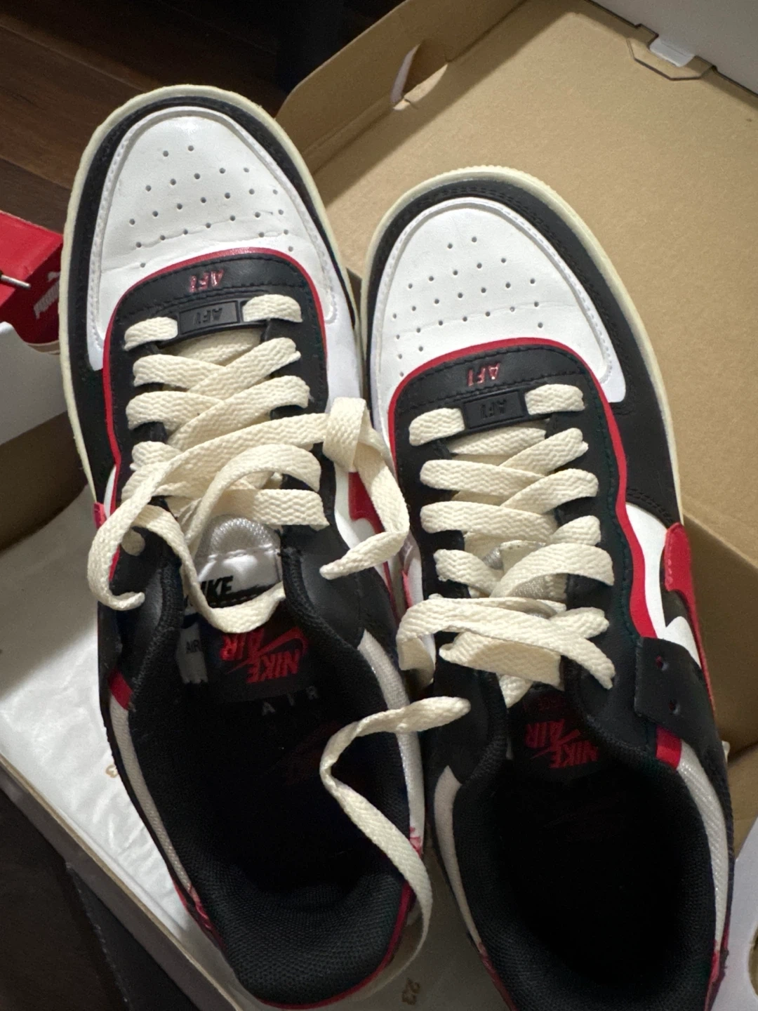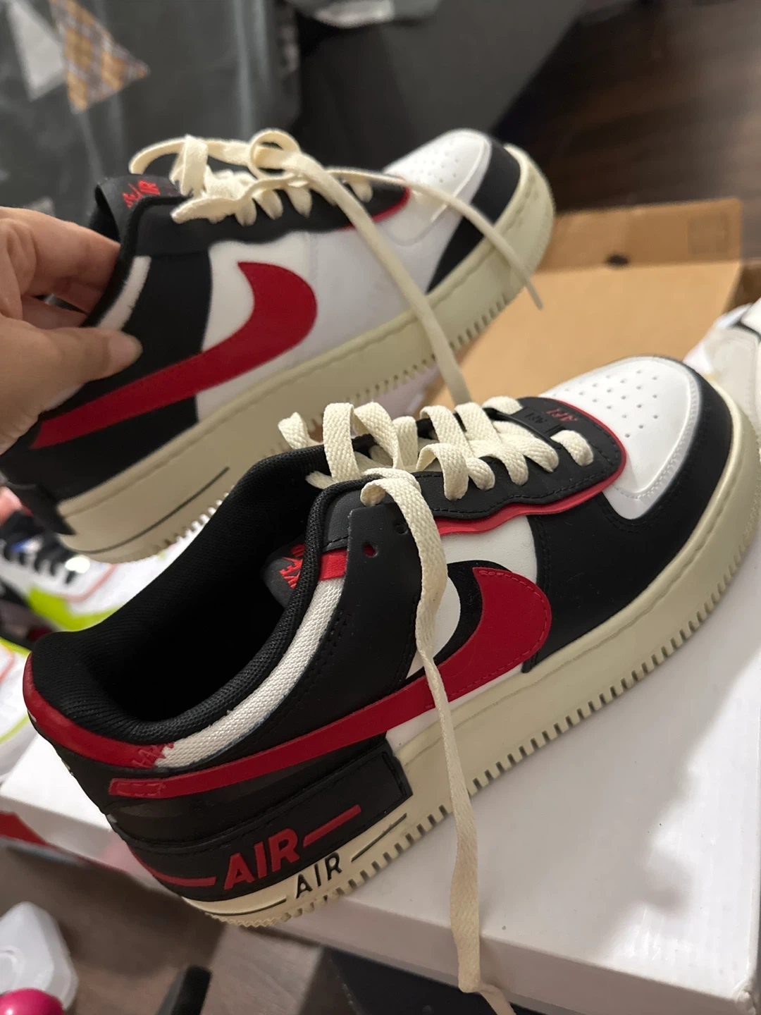 Nike Air Force 1 Shadow women's sneakers in great condition! These stylish sneakers feature a layered design with a mix of white, black, and red accents, giving them a unique and fashionable look. The iconic Nike Air cushioning provides all-day comfort and support. Perfect for adding a touch of sporty flair to any outfit