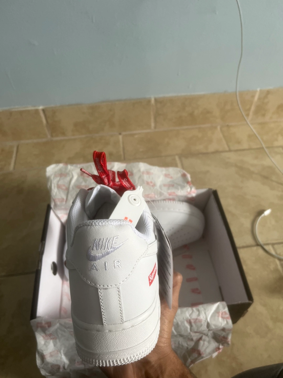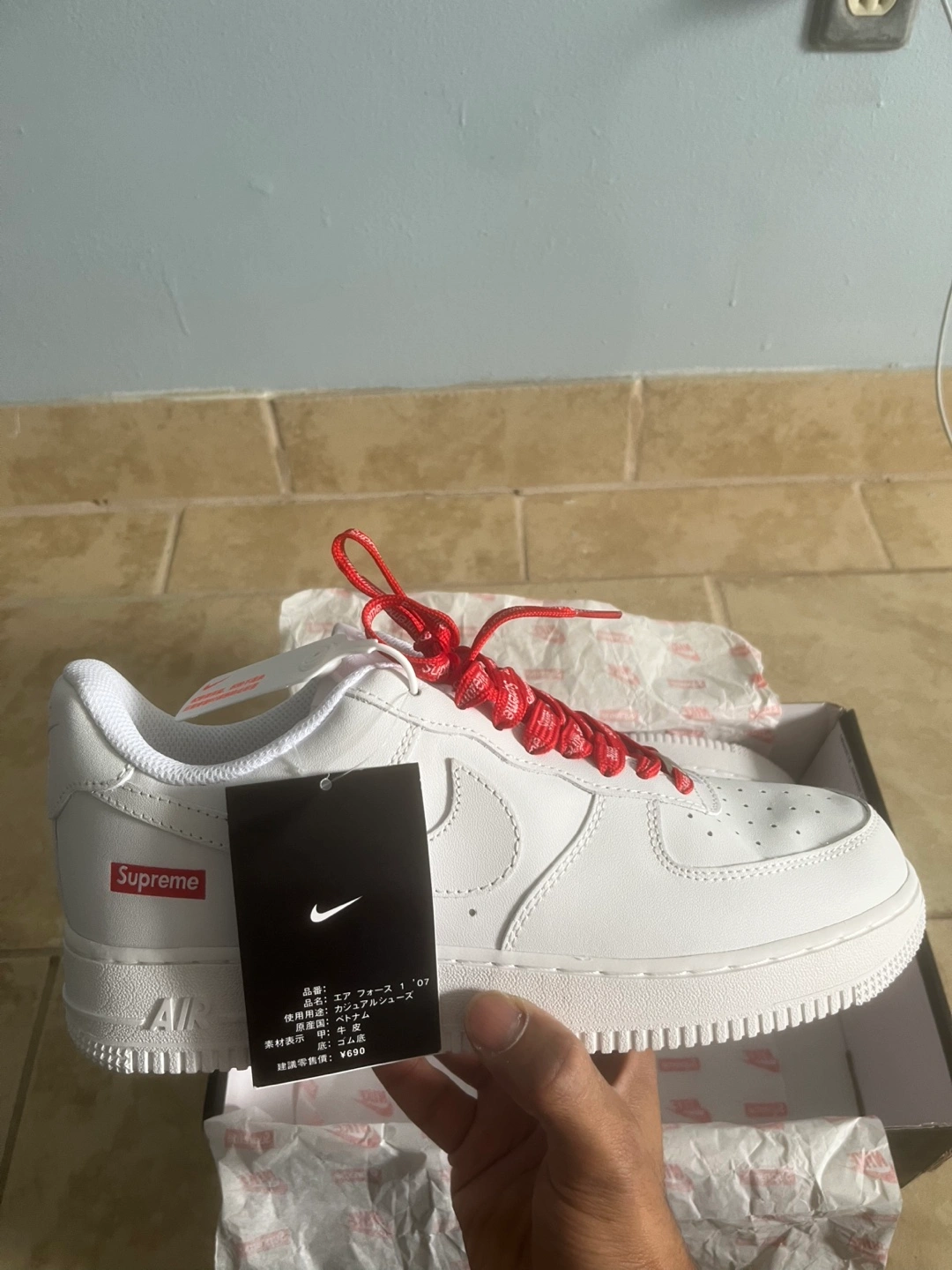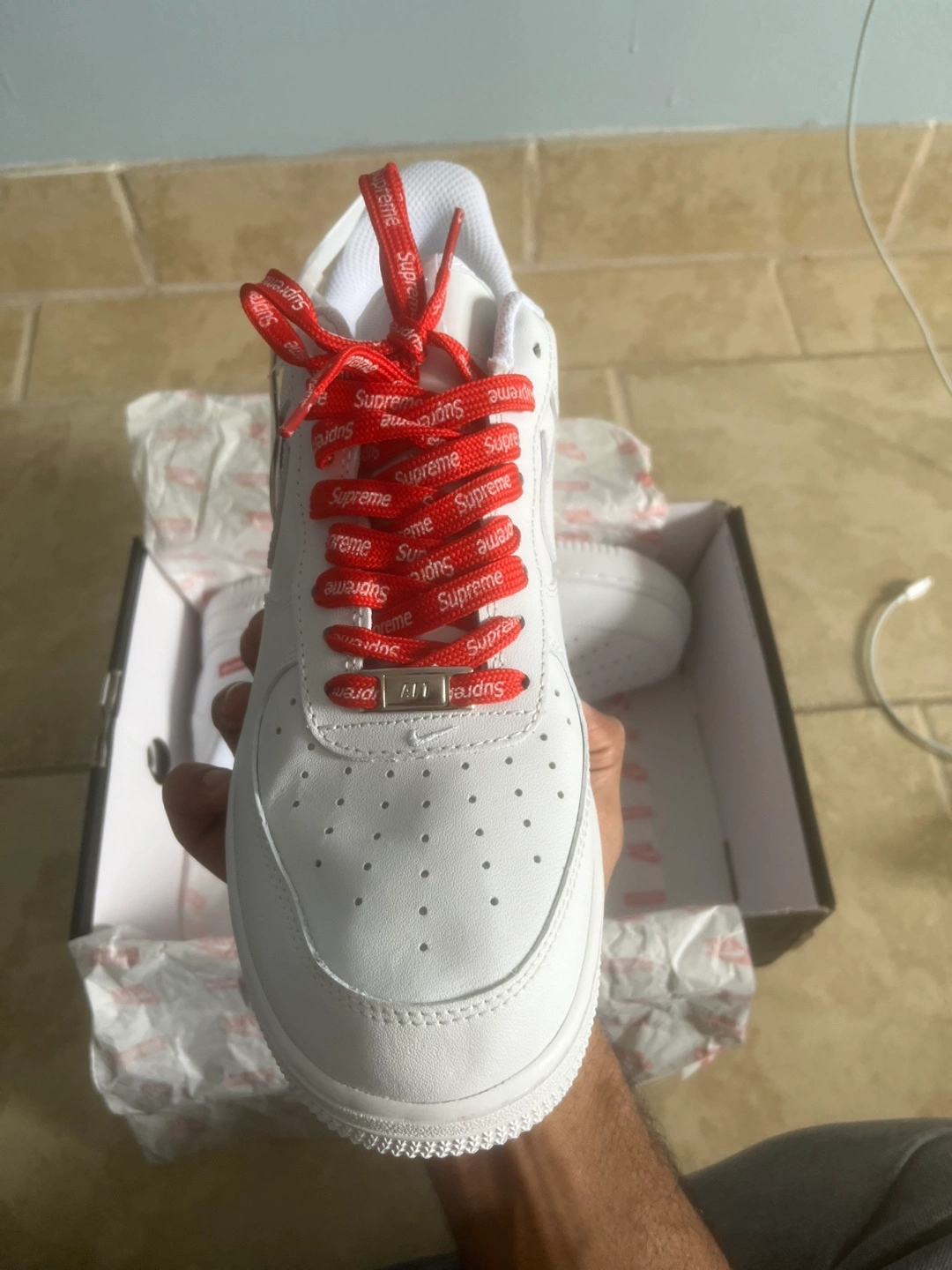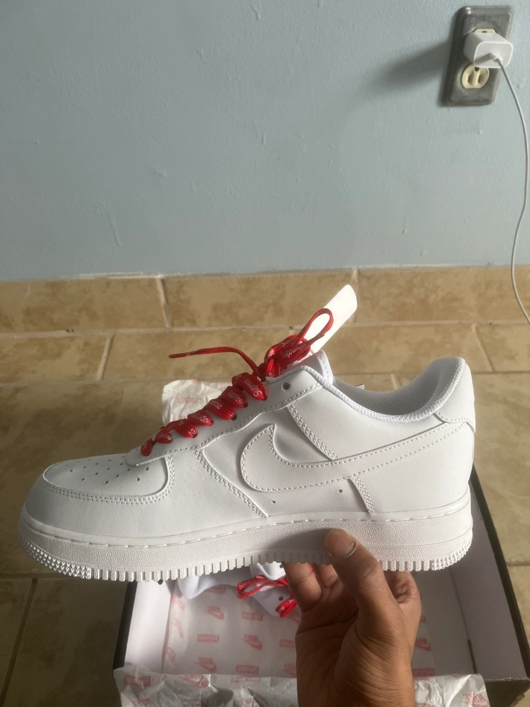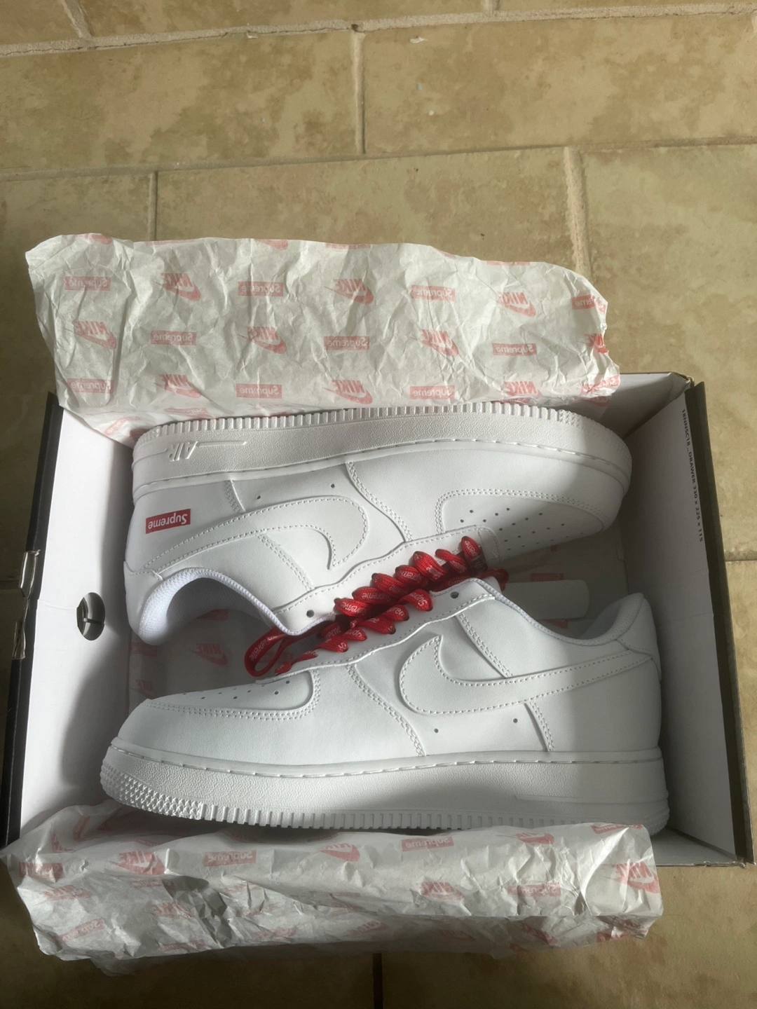 Selling a brand new pair of Nike Air Force 1 Supreme sneakers in white! They come with the original box and red Supreme laces. A classic and stylish addition to any wardrobe!