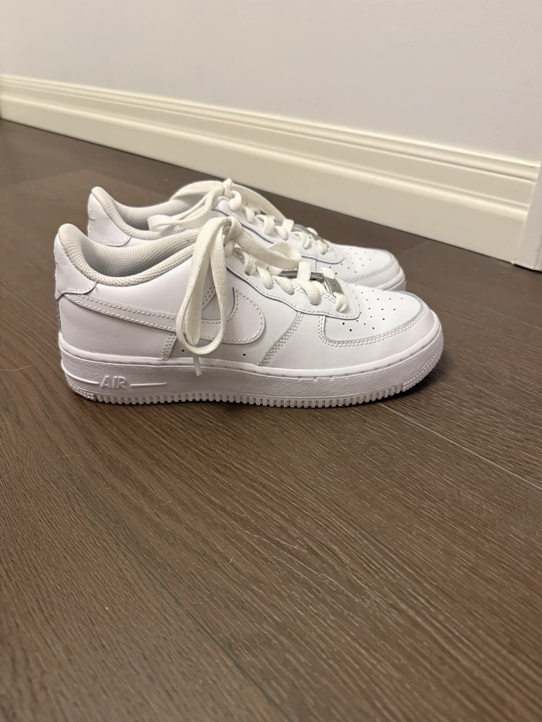 Selling a pair of Nike Air Force 1s in white. They're in excellent condition, with some signs of dirt only on the soles. Kids size 6.5. Fits a woman’s 7.5.