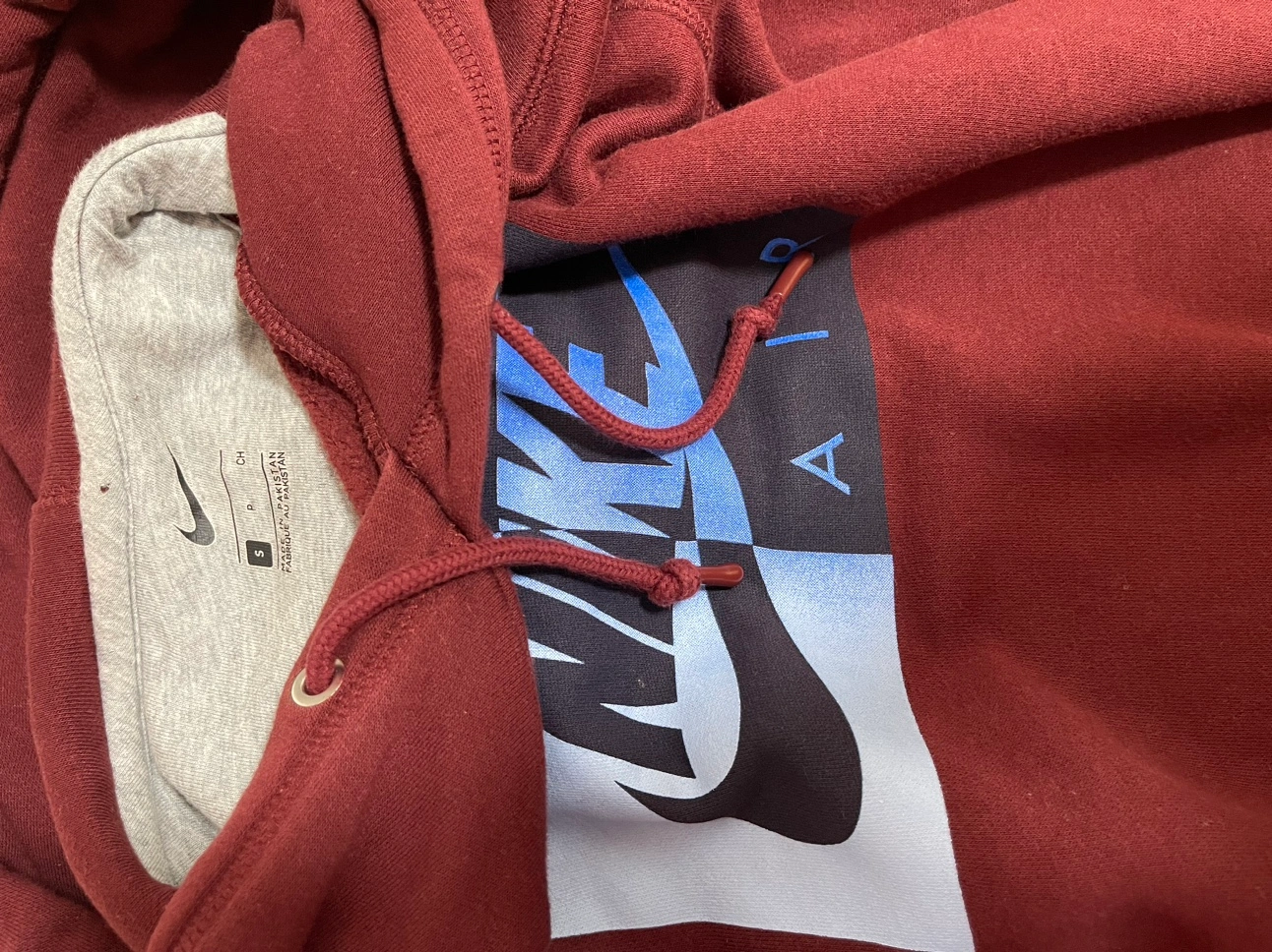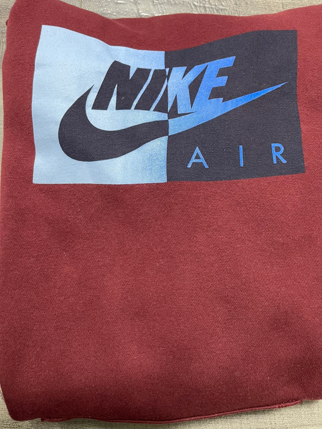 30Burgundy Nike Air hoodie with a large blue, black and white logo on the front.