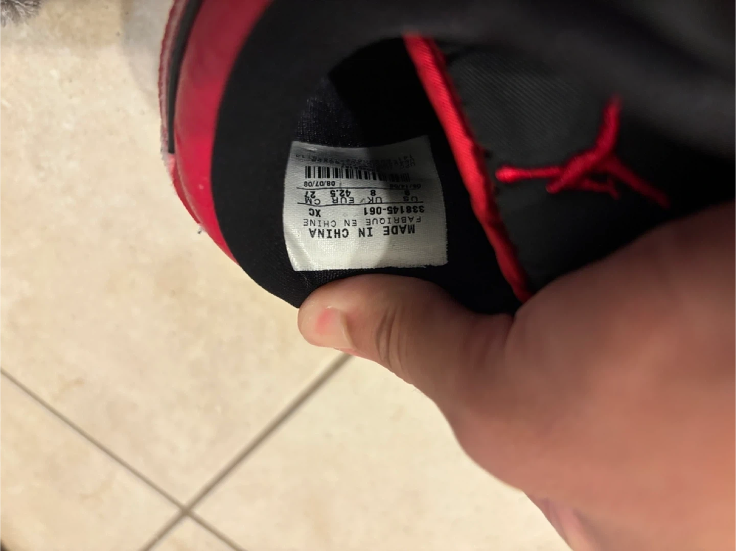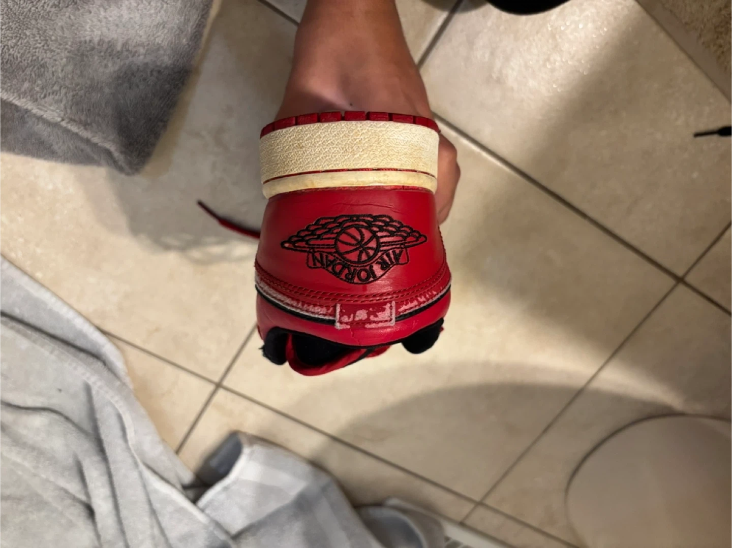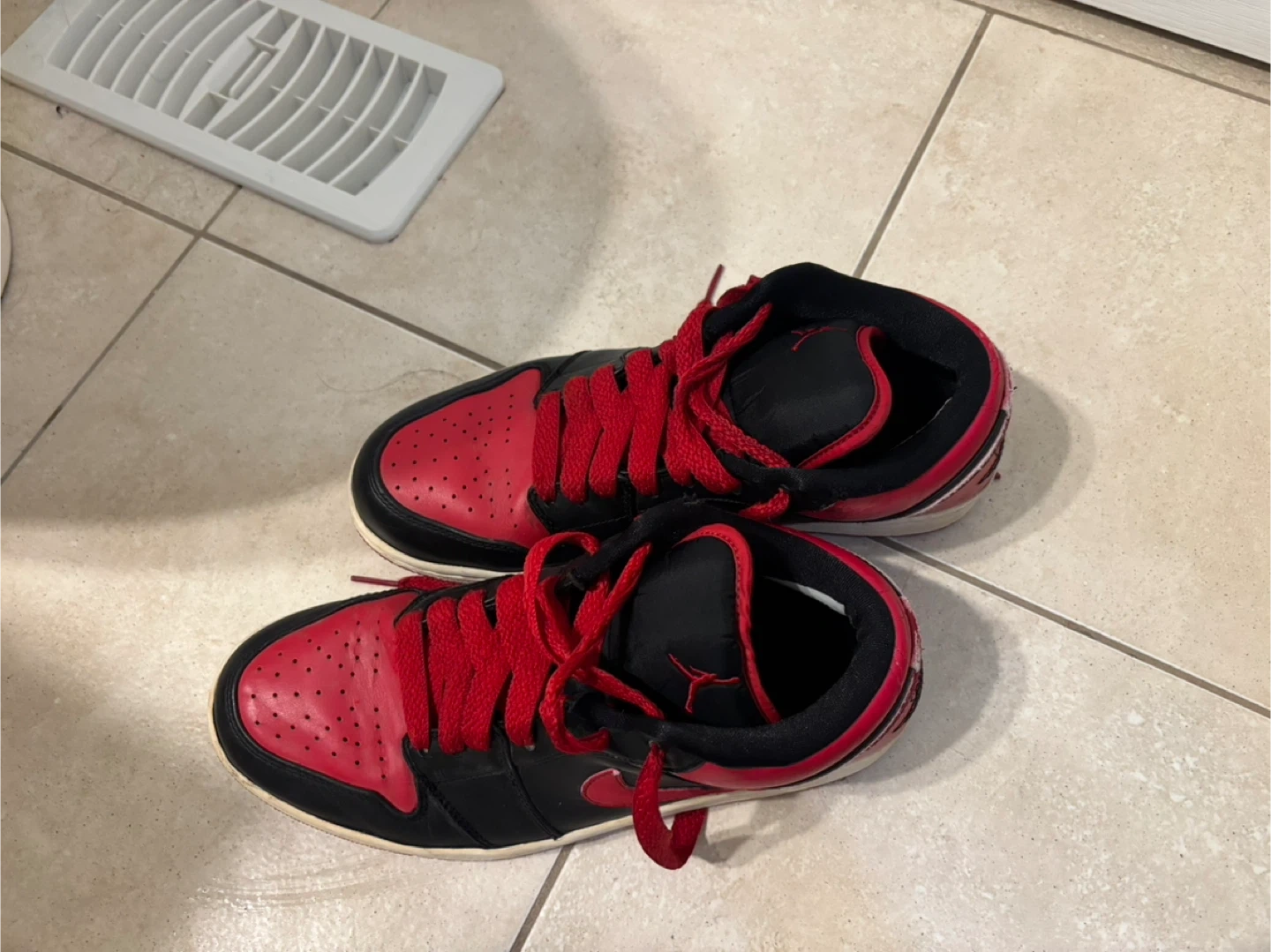 10Selling a pair of Nike Air Jordan 1 Low sneakers in a classic red and black colourway. They are in used condition, as you can see in the photos. The size is 8 US, 41 EUR, 7 UK, and 40 CM.