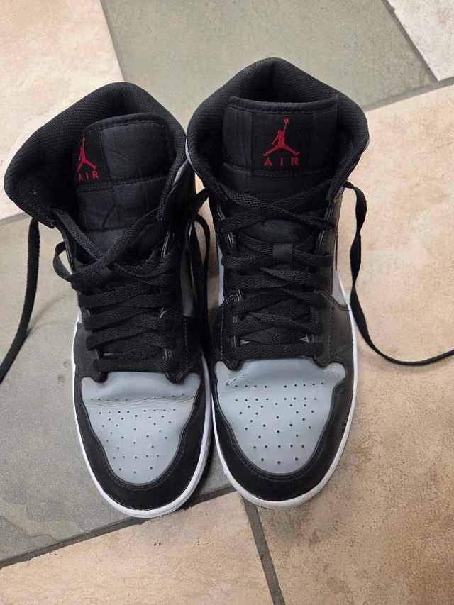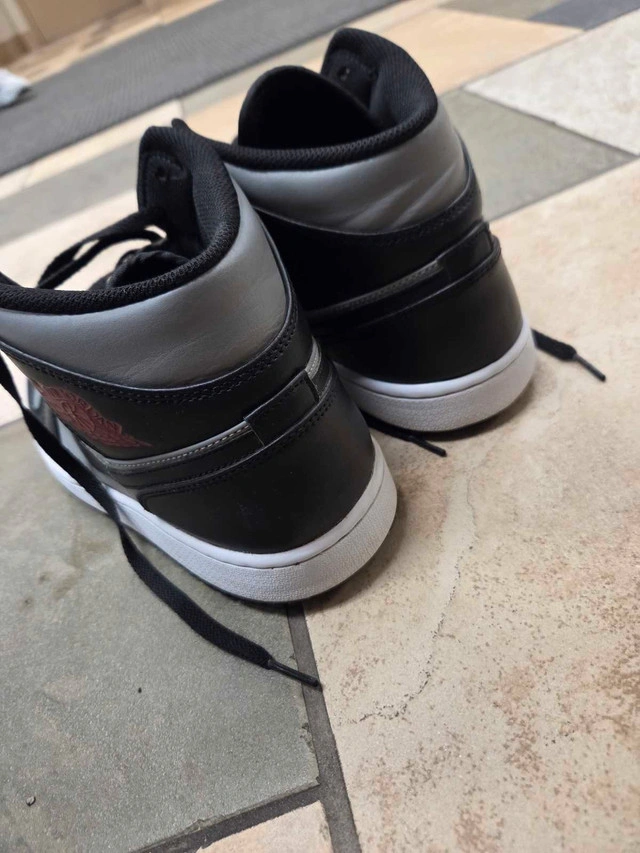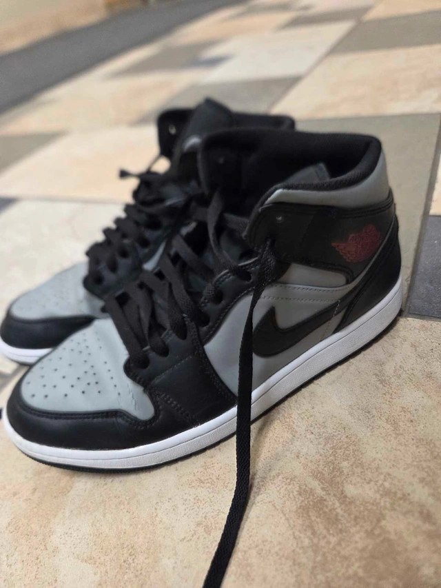 Step up your sneaker game with these used Nike Air Jordan 1 Mid sneakers, a stylish addition to any wardrobe! These size 11.5 shoes feature a sleek black and grey colourway. They have been previously worn and are still in good condition, ready for their next adventure. * Brand: Nike * Model: Air Jordan 1 Mid * Size: 11.5 US * Colour: Black/Grey Looking to add a classic touch to your fit? These sneakers have stories to tell and streets to explore. Don't miss the chance to make them yours! P.S. If the ad's still up, they're still kickin' around!