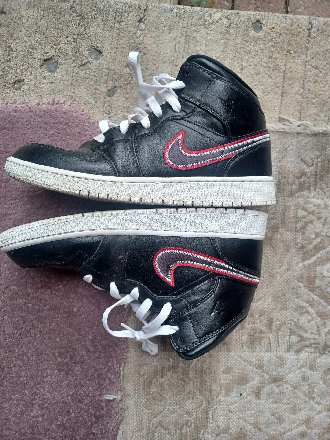 Selling a pair of Nike Air Jordan 1 Mid sneakers in black with red accents. They're in good condition and ready for a new home! Great for everyday wear or adding to your sneaker collection