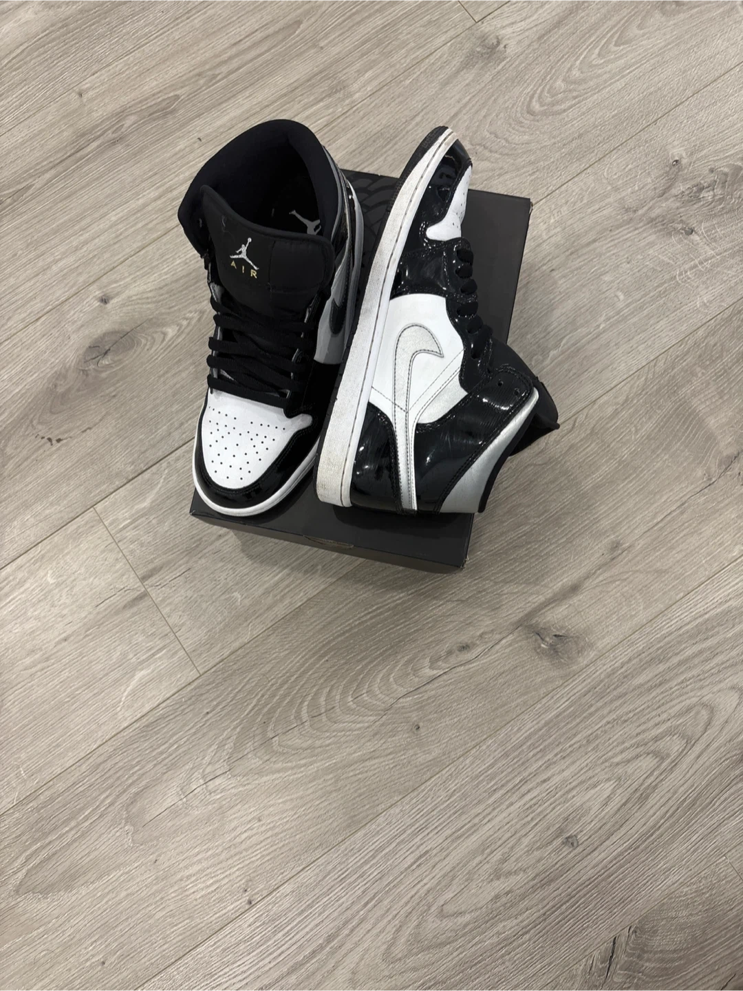 15Selling a pair of Nike Air Jordan 1 Mid sneakers in black, white, and silver! These are a US size 9. They come with the original box too
