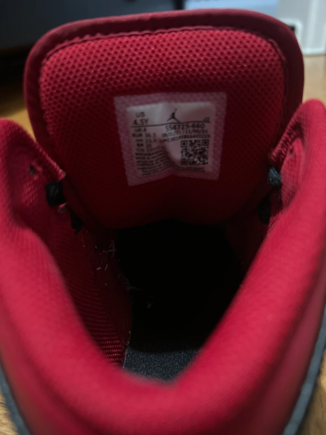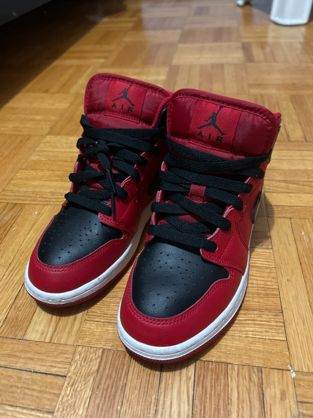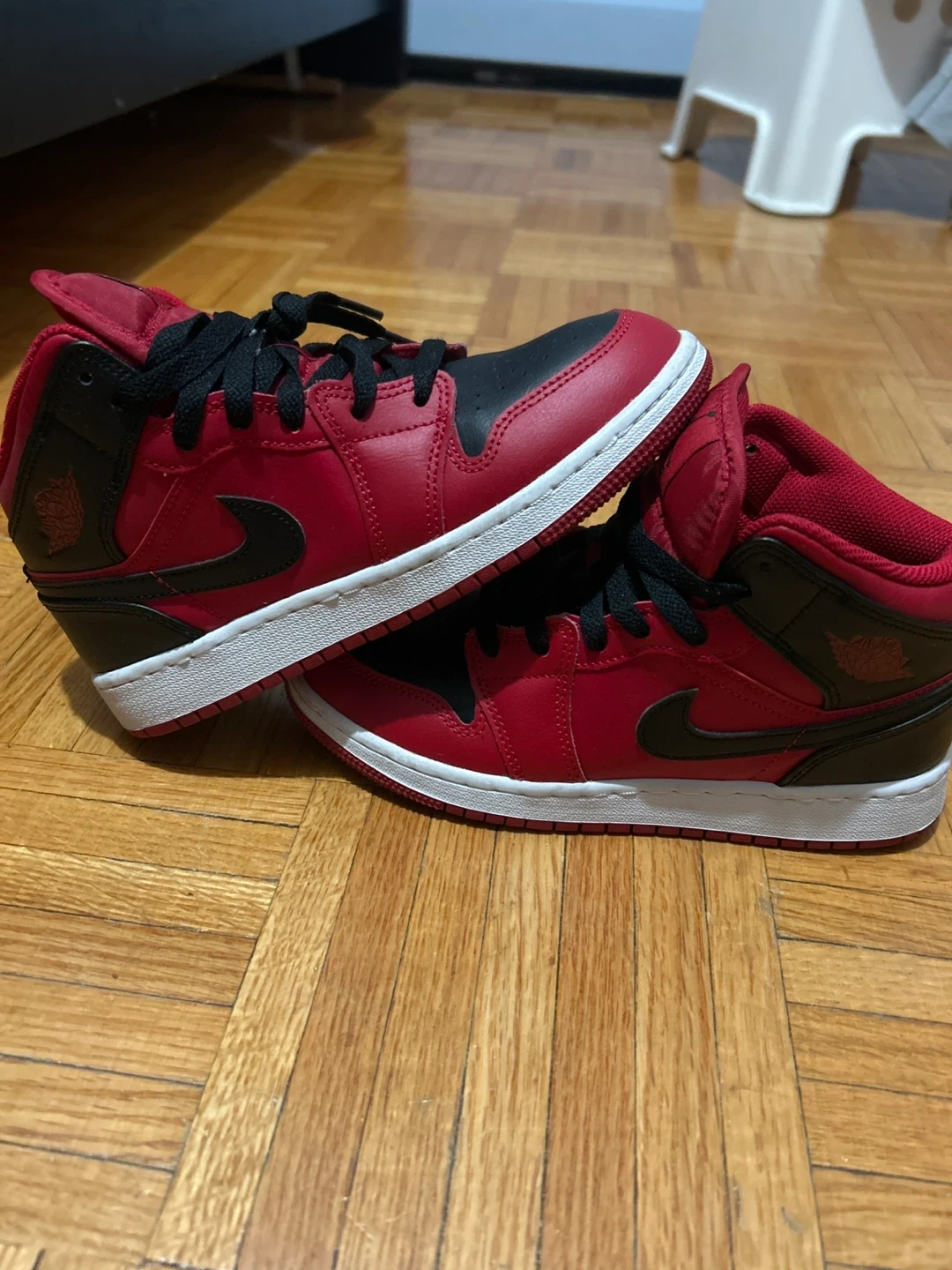 10Selling a pair of Nike Air Jordan 1 Mid sneakers in red and black. These are a youth size 4.5 (US 4.5Y). They're in great shape and ready for a new home!