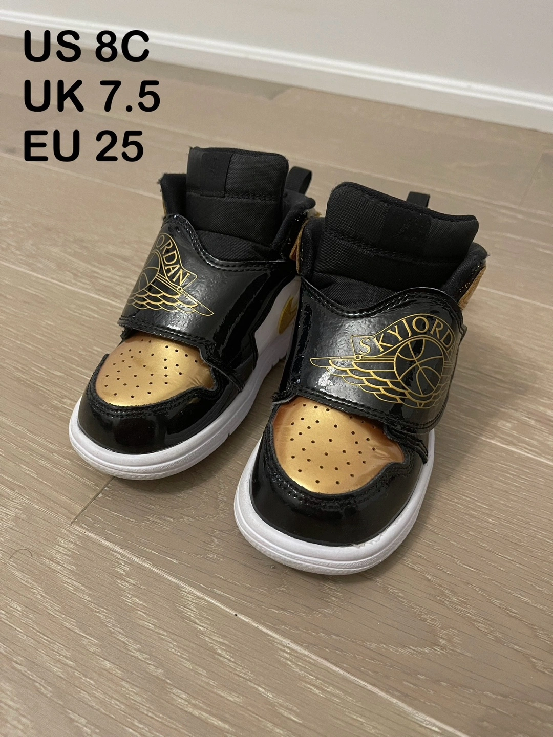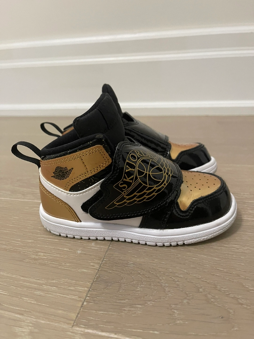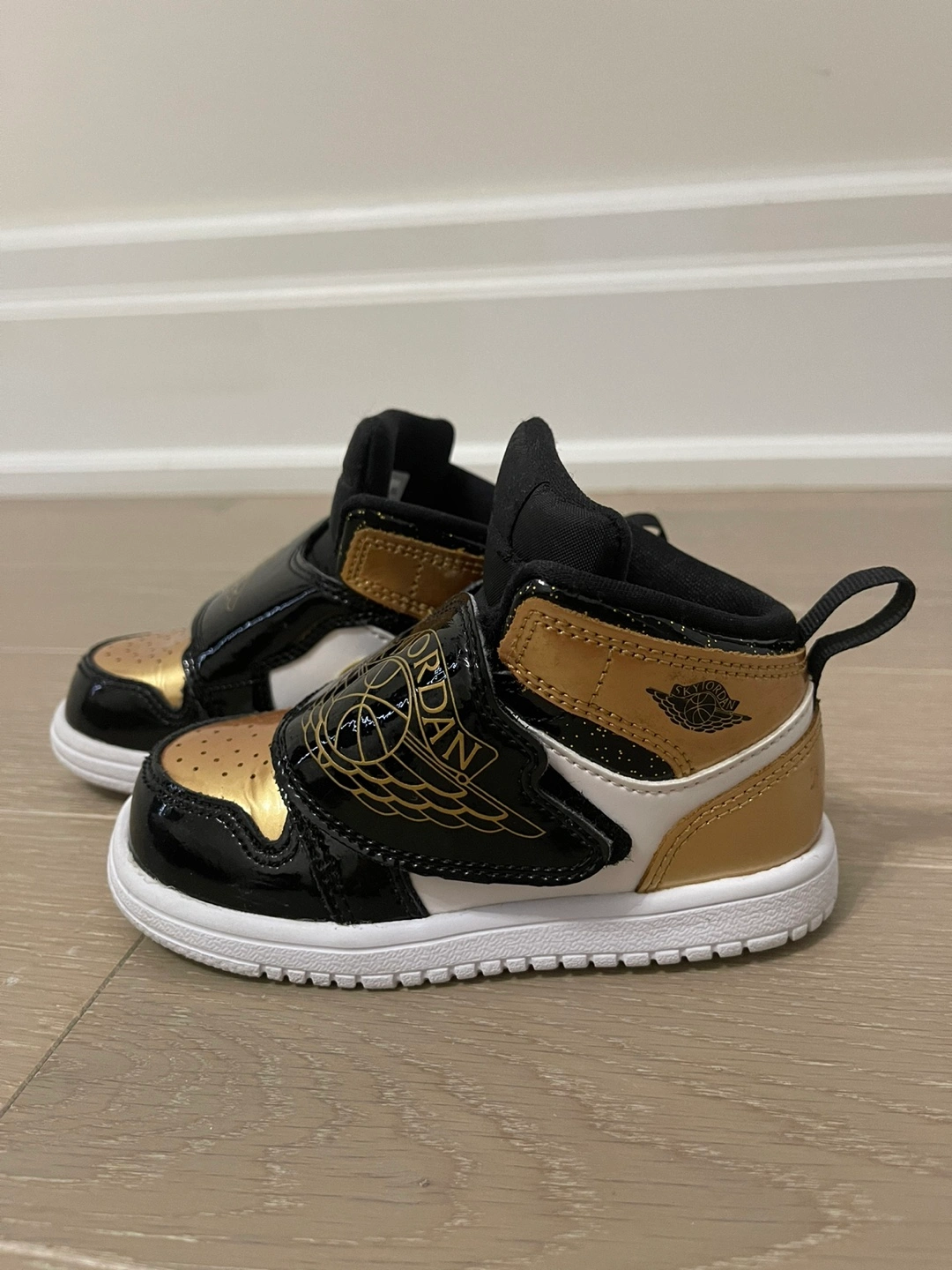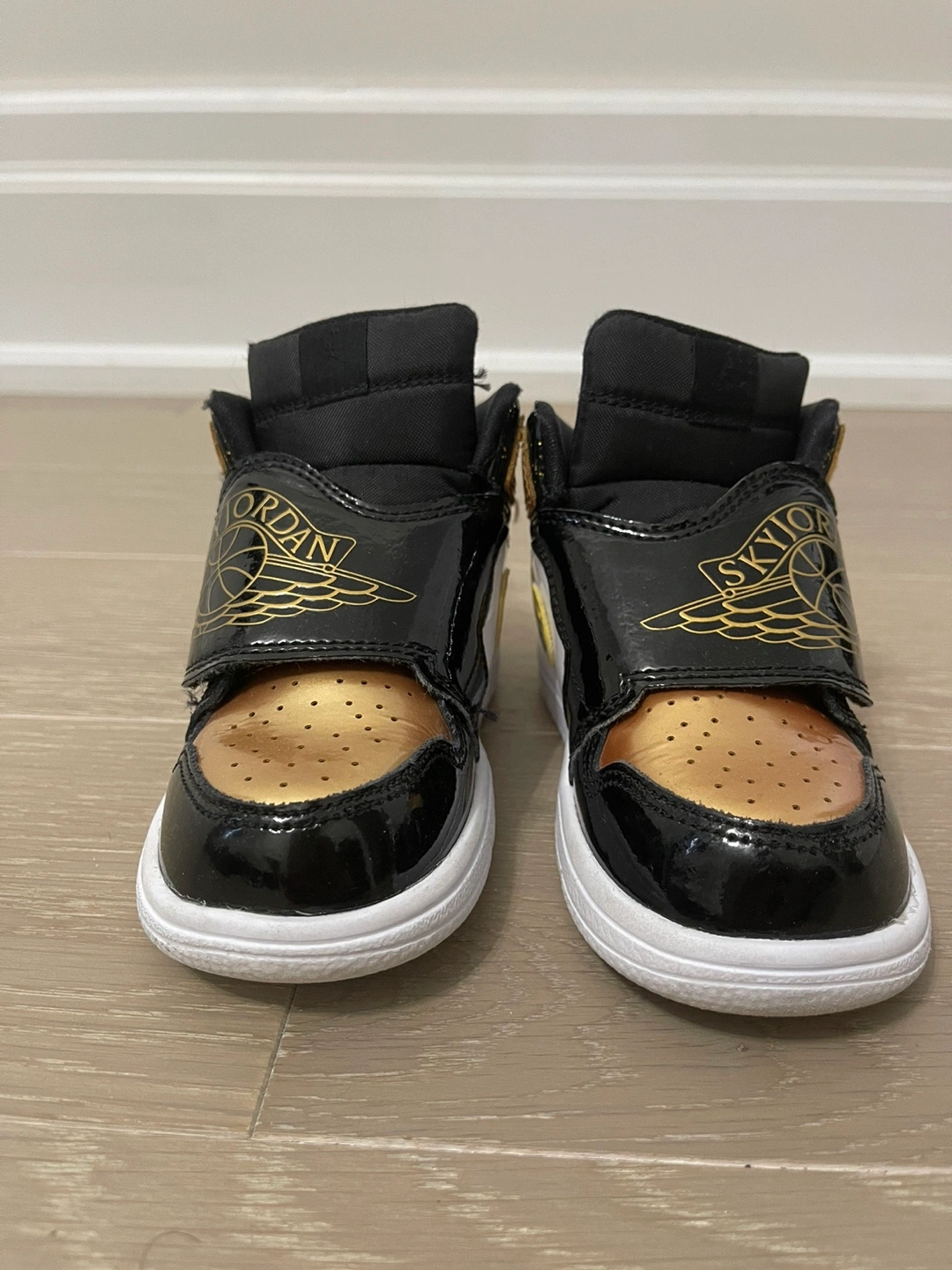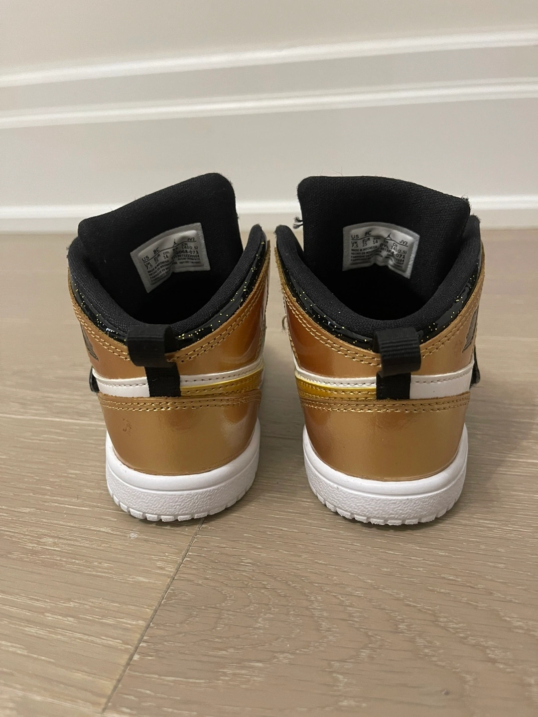 10Black and gold Air Jordan 1 Mid SE toddler shoes, size US 8C, UK 7.5, EU 25.