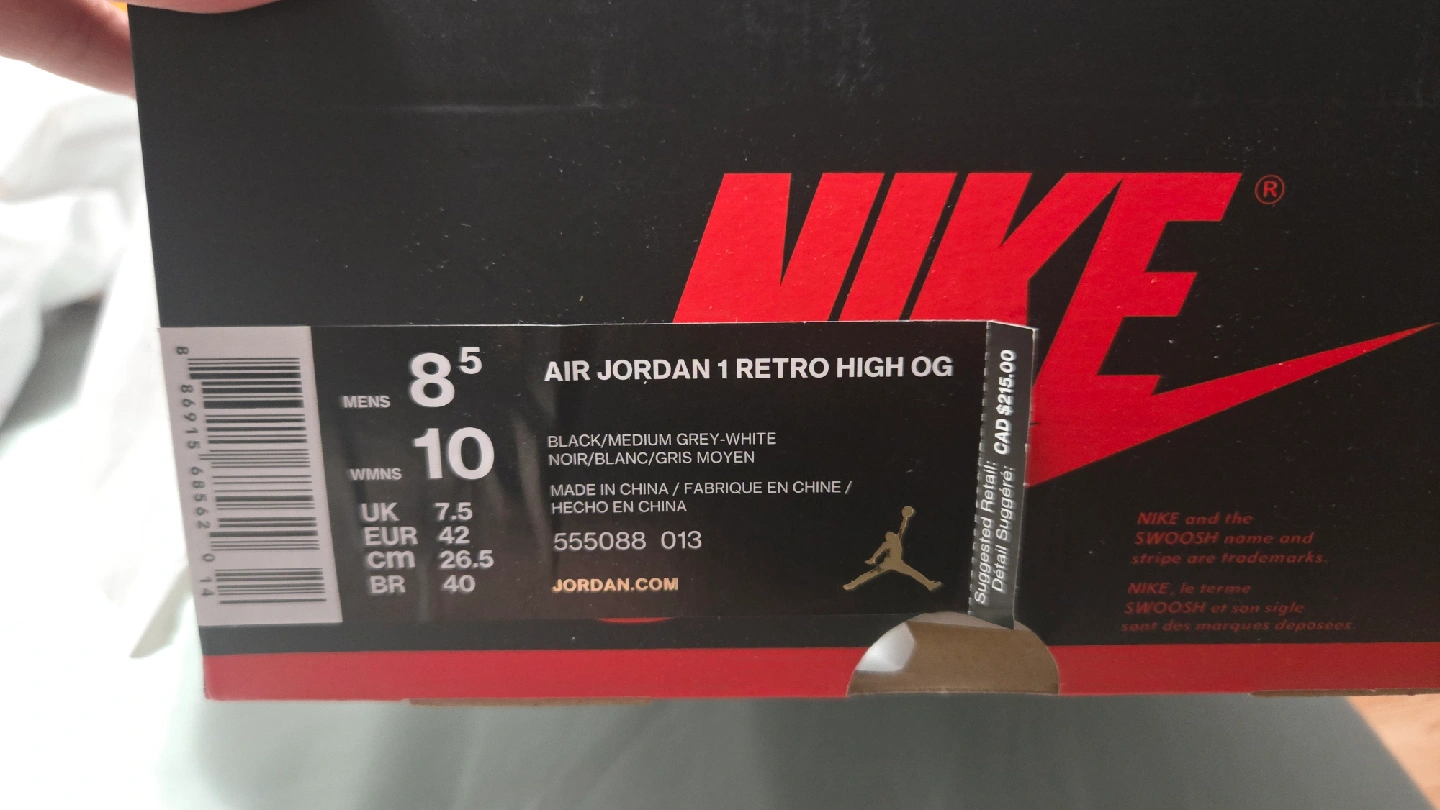 They are missing laces! Selling a pair of Nike Air Jordan 1 Retro High OG sneakers in men's size 8.5. These are black, medium grey, and white. The box is included! These shoes were barely worn!