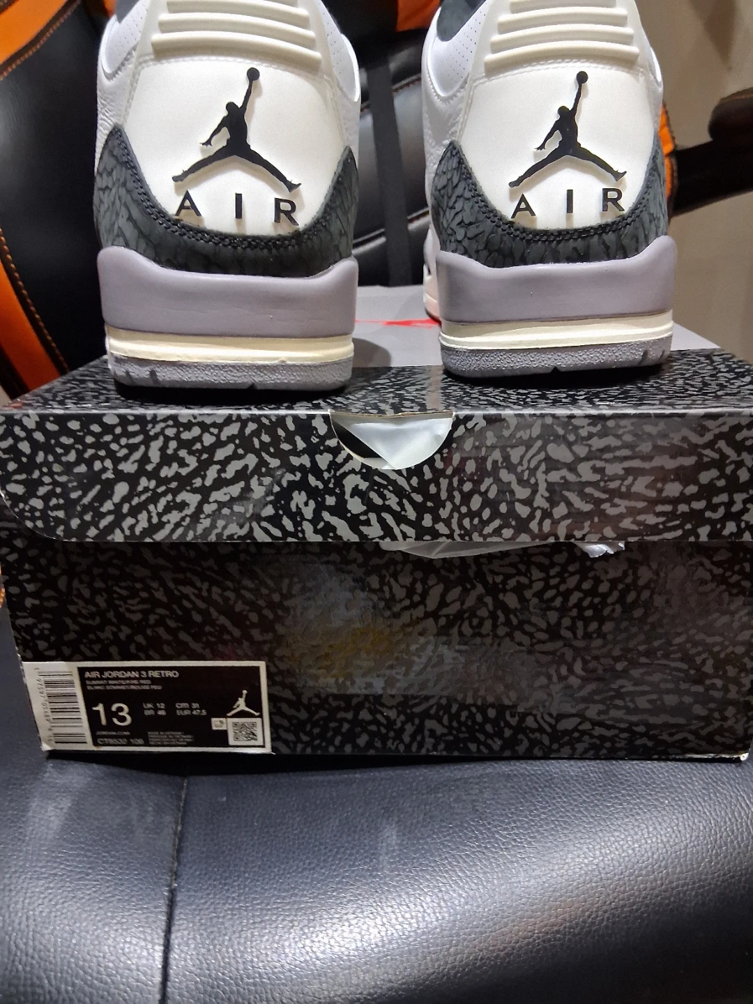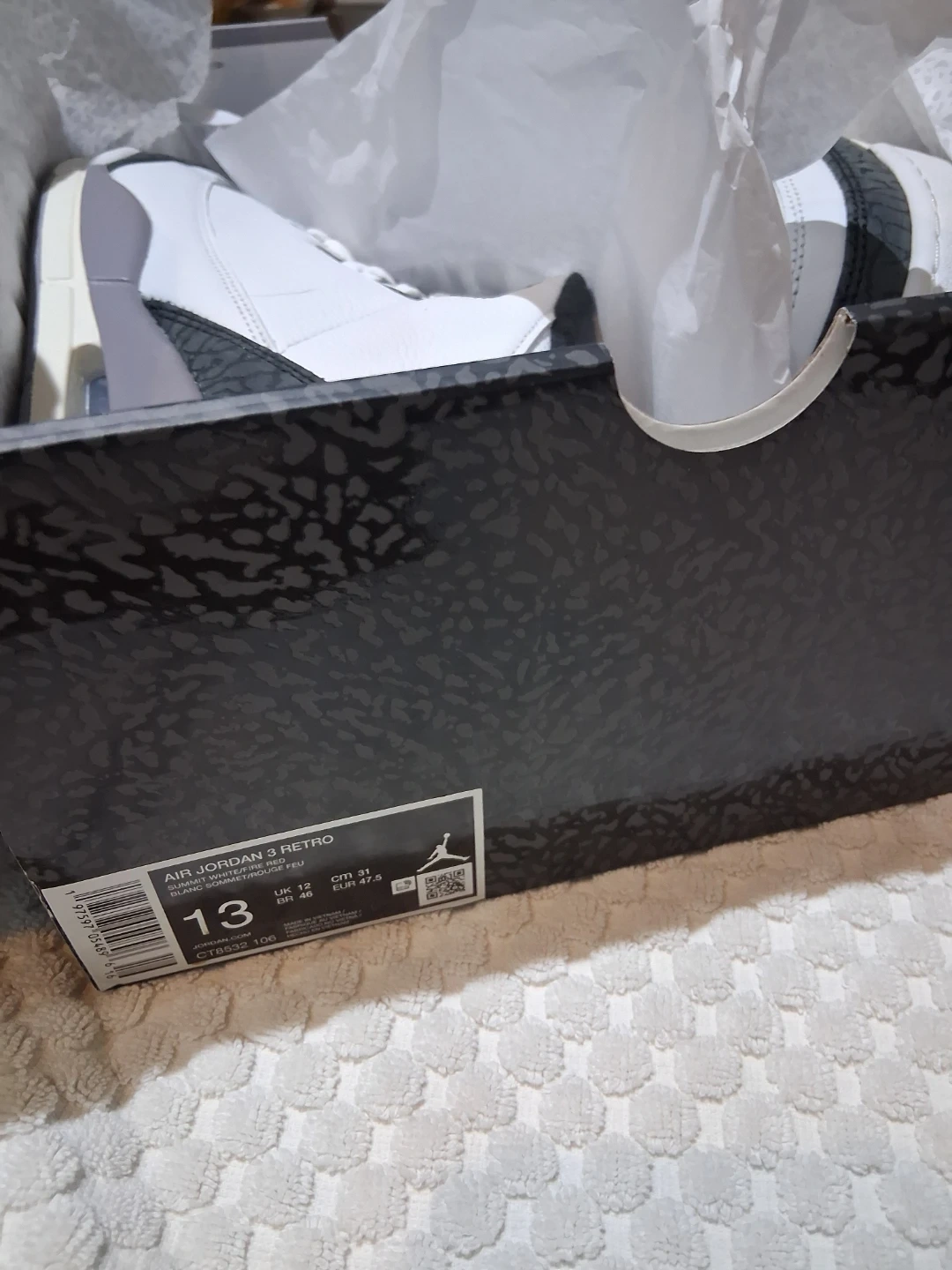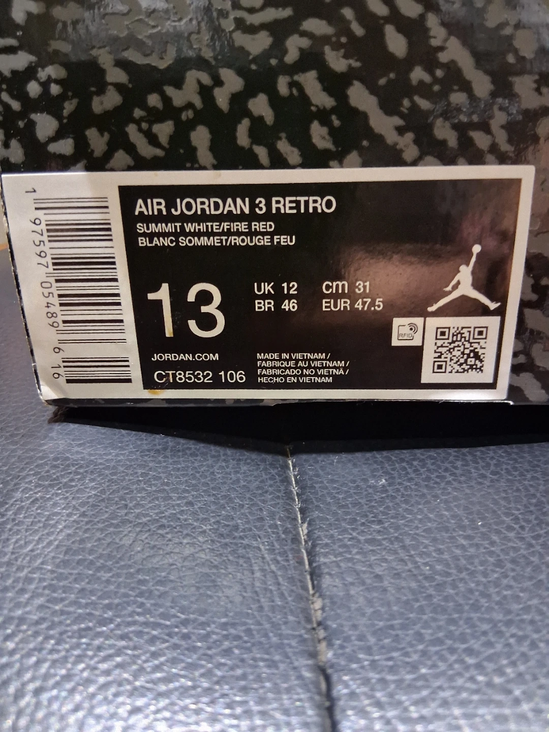 60Selling a pair of Nike Air Jordan 3 Retro in the classic White Summit/Fire Red colourway. These are in great condition and ready for a new home! Size 13. Can check Authenticity before exchange. QR Scan