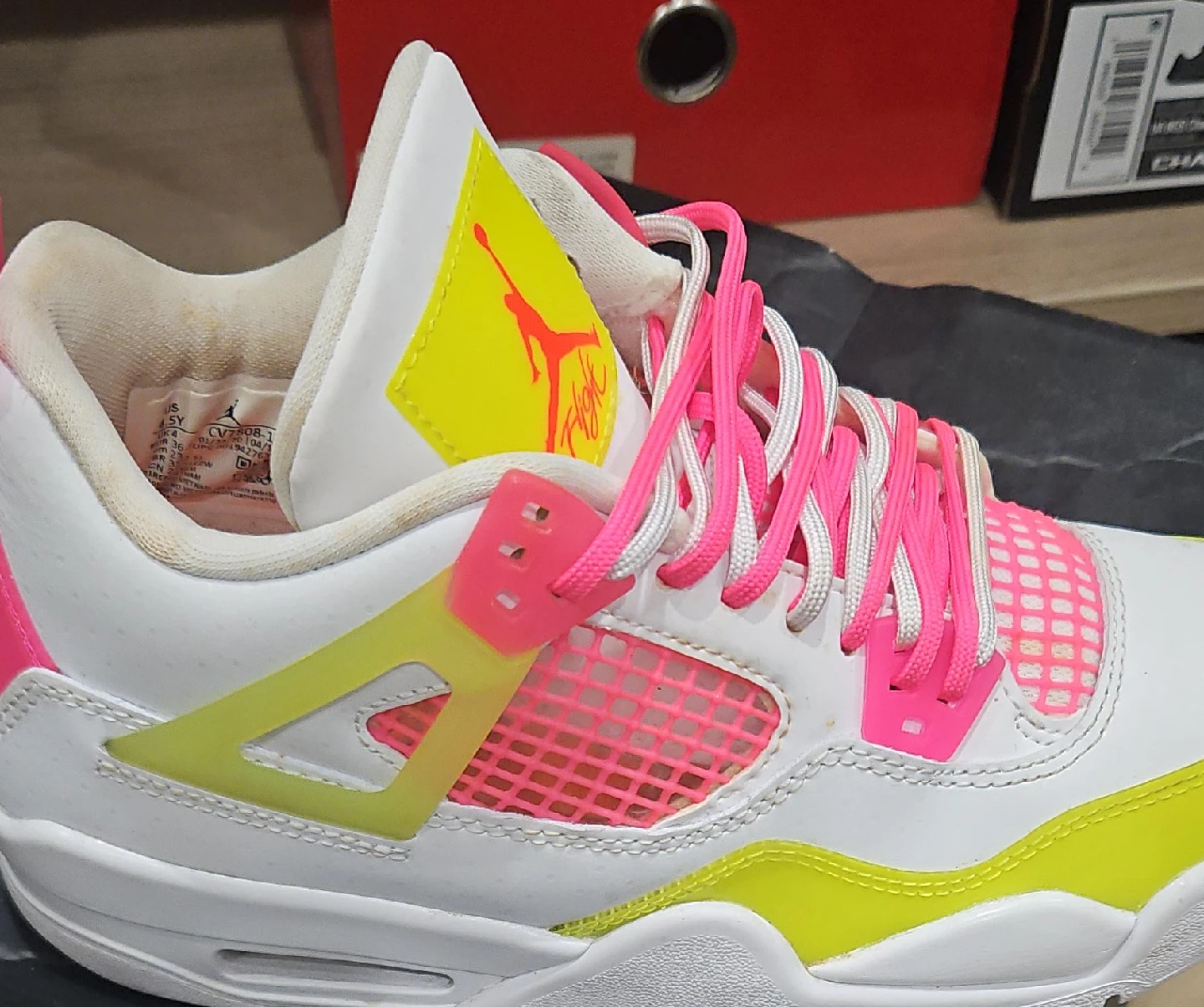 60Selling a pair of Nike Air Jordan 4 Retro sneakers in a vibrant white, pink, and yellow colourway! These are a youth size 5Y. Perfect for adding a pop of colour to any outfit!