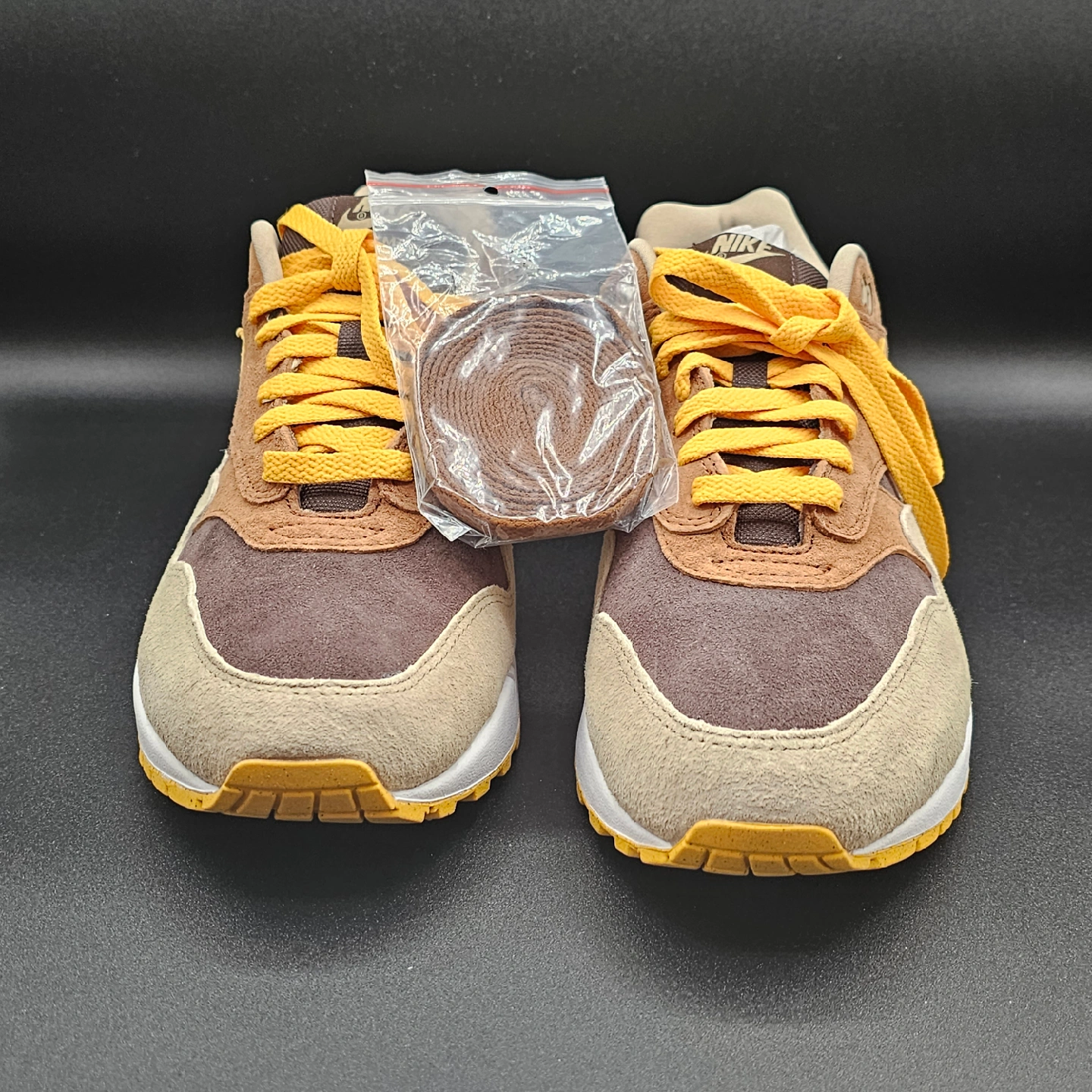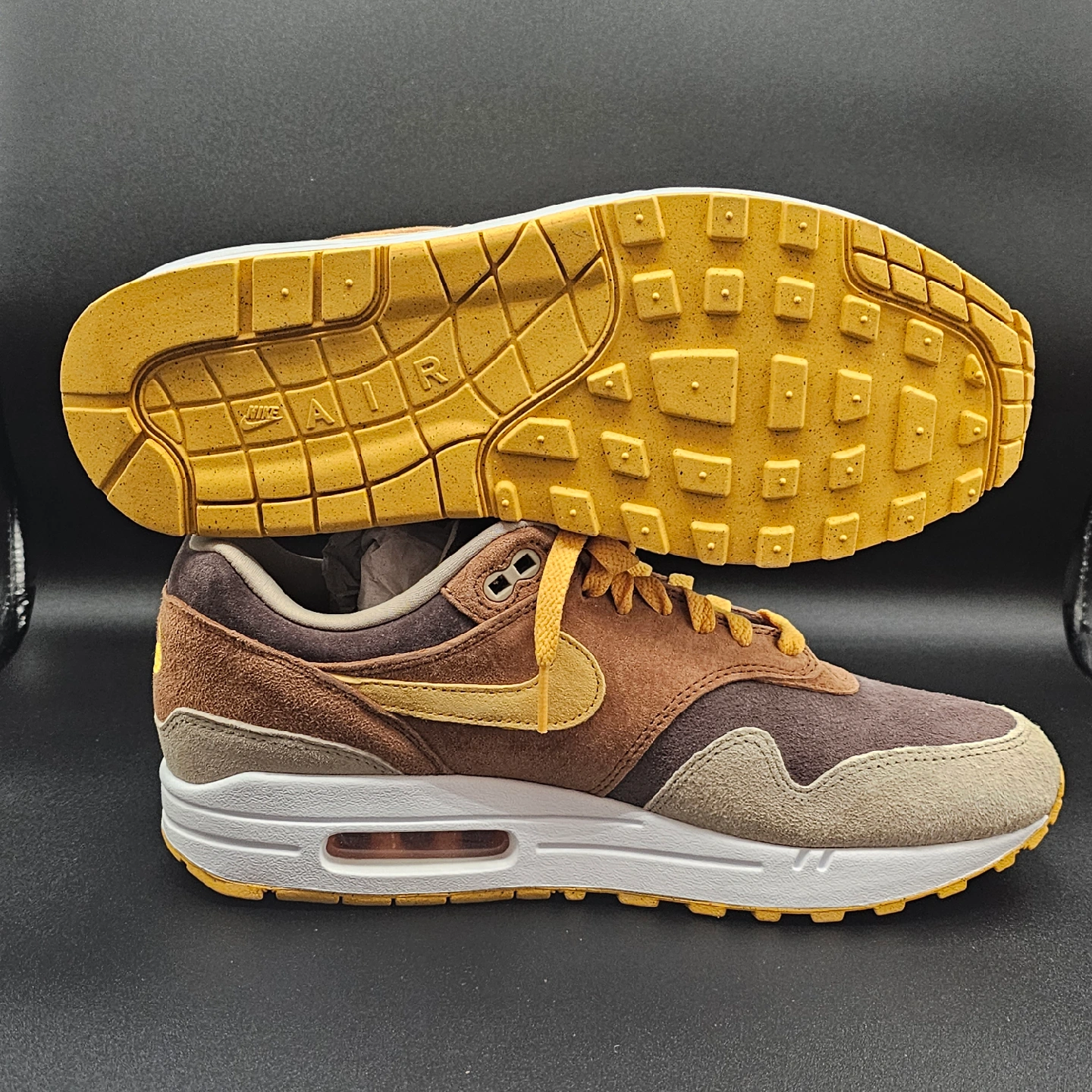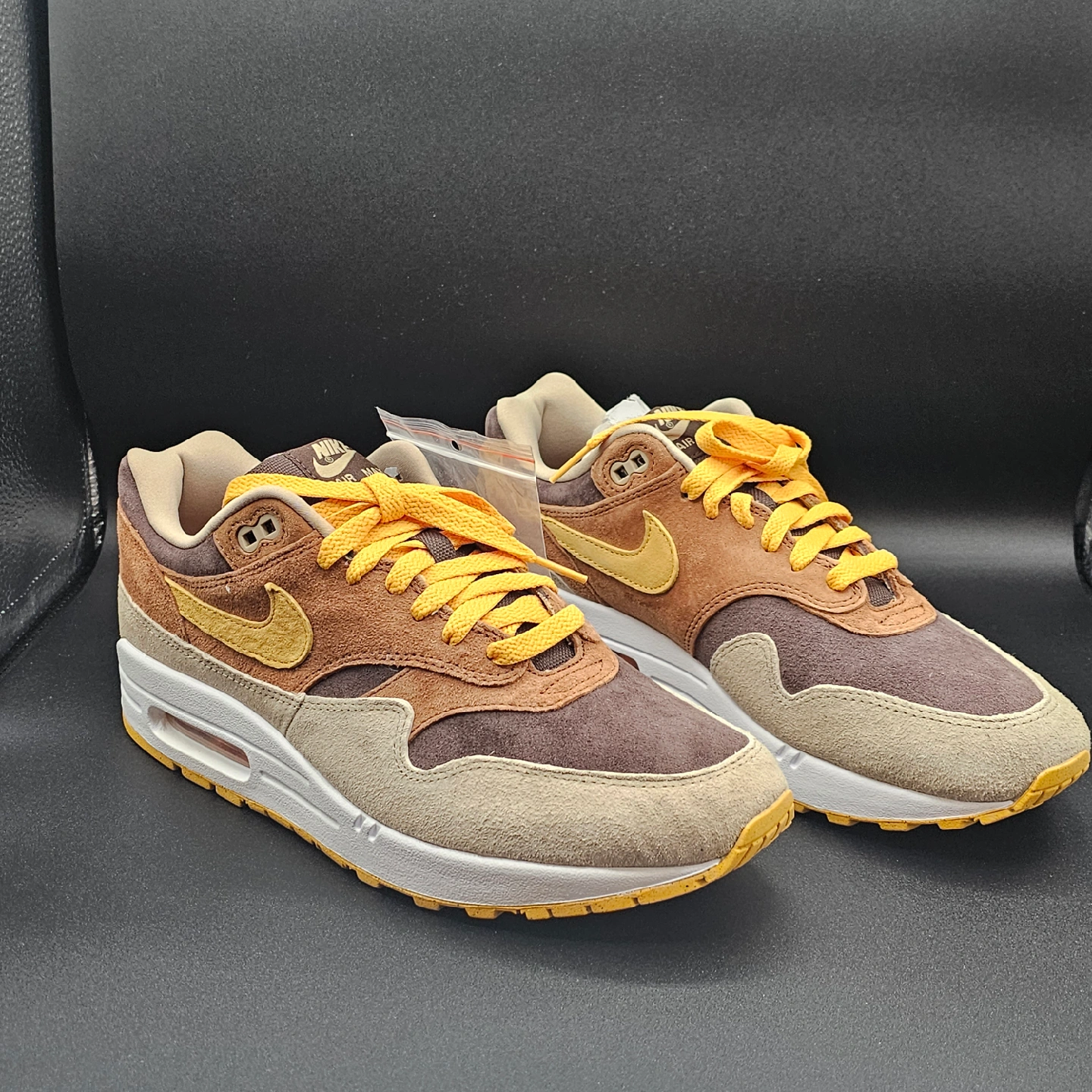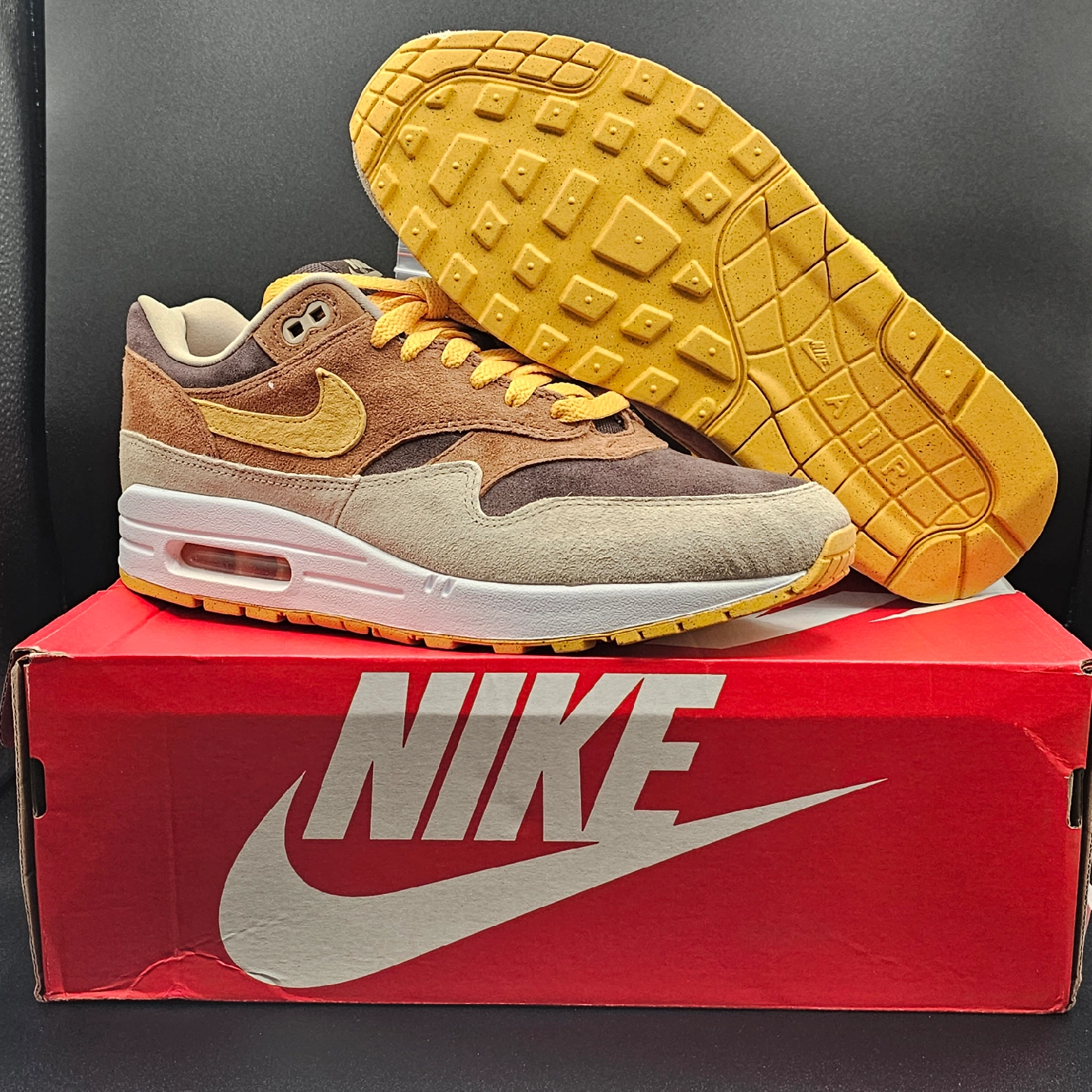15Selling a pair of Nike Air Max 1 in the 'Baroque Brown' colourway. These sneakers come with an extra set of brown laces and the original box. They feature a mix of suede and textile materials, giving them a unique look and feel. A great addition to any sneaker collection!
