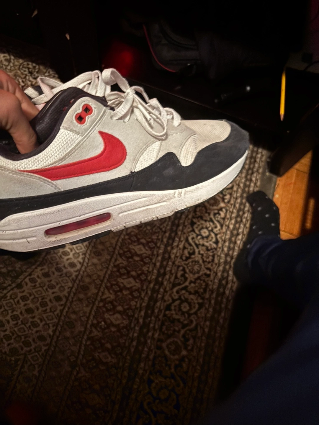 10Pre-owned Nike Air Max 1 running shoes. White, black, and red colourway. Price up for negotiation.