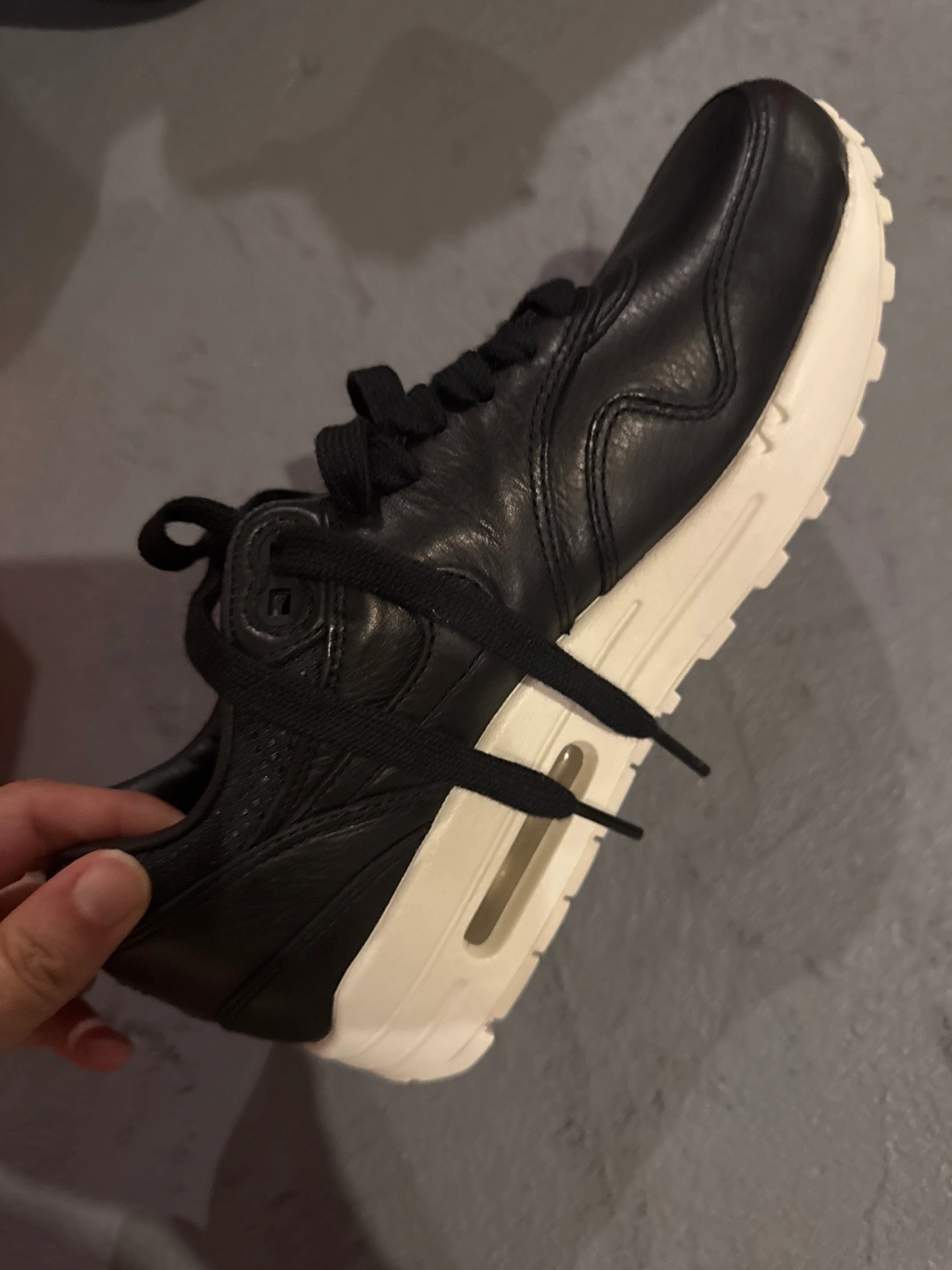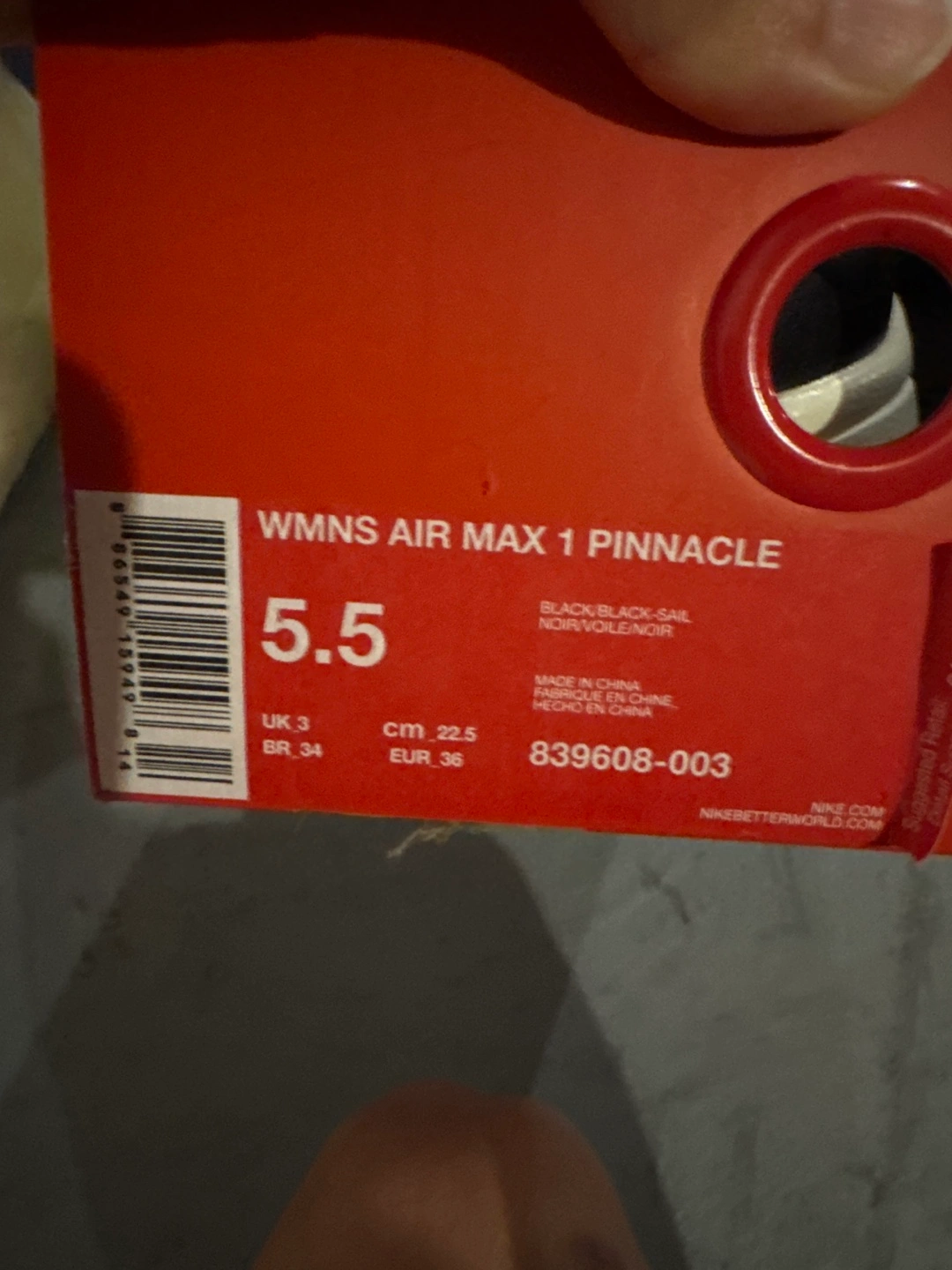 Selling a pair of women's Nike Air Max 1 Pinnacle sneakers in size 5.5. They are black/black-sail/noir/voile/noir. Comes with the original box