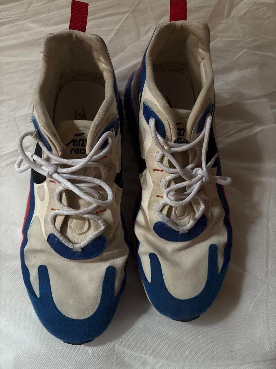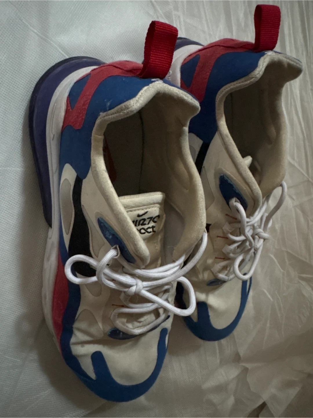 222Selling a pair of Nike Air Max 270 React shoes in US size 10. They feature a stylish combination of white, blue, and red. Great for casual wear or workouts!