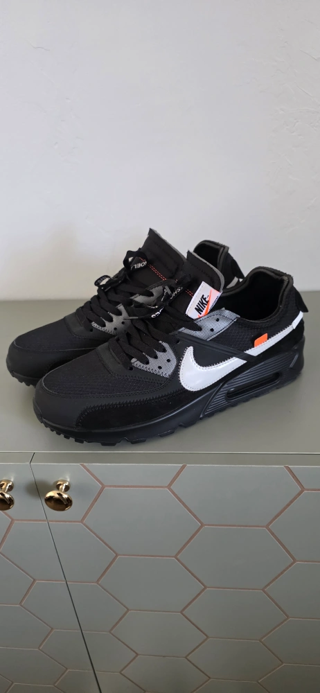 Selling a pair of Nike Air Max 90 Off-White in black, size 11.5 to 12. Comes with extra laces in green and orange. Check out the photos for details!
