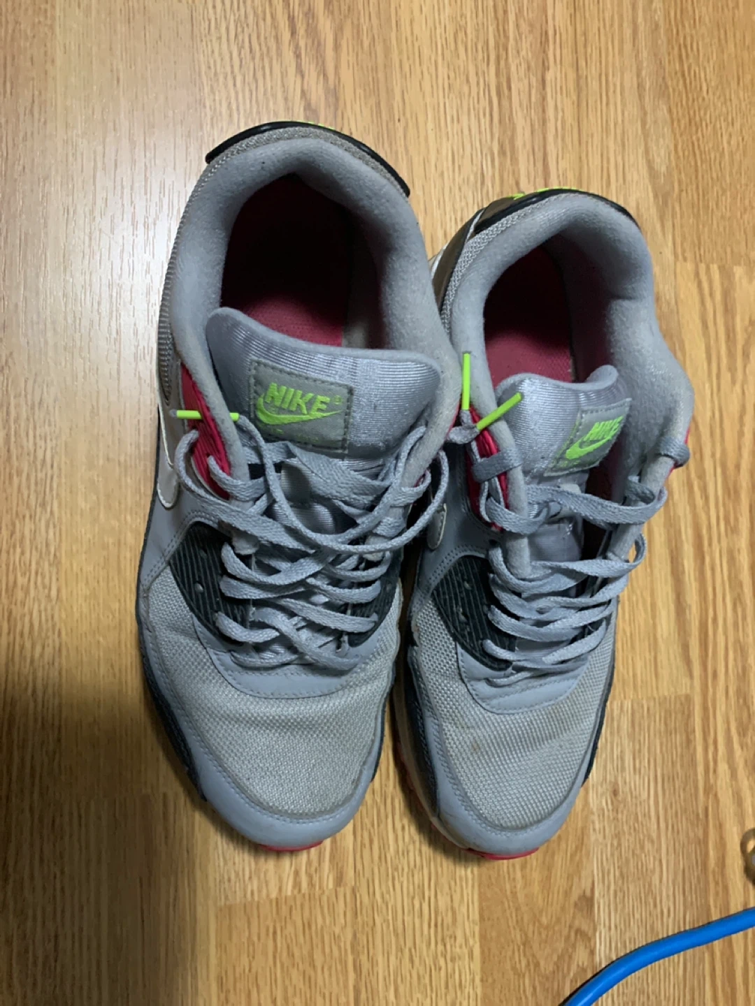 10Selling a pair of Nike Air Max 90 sneakers. They're grey with pink accents and in used condition. Great for casual wear!
