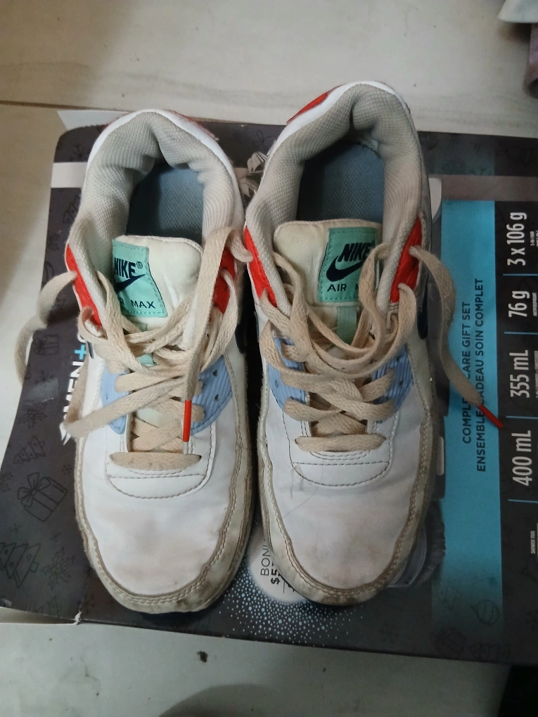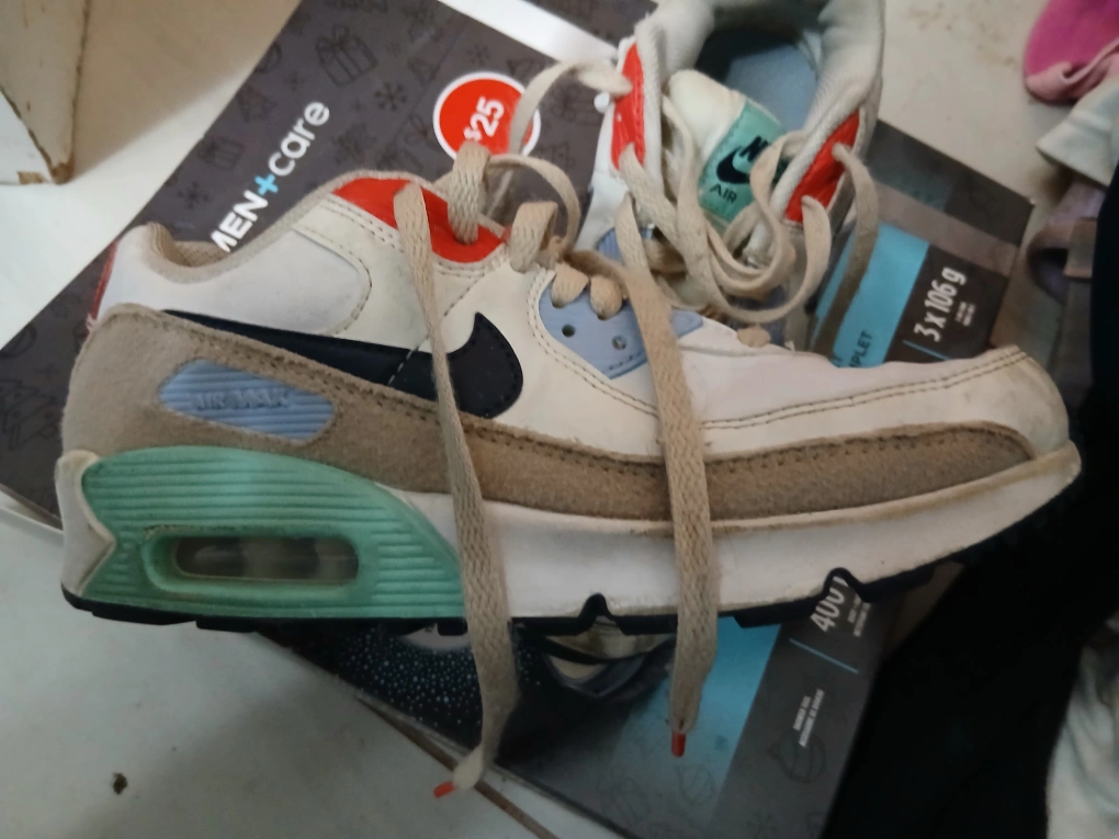 Pair of sneakers with a combination of colours. The shoes feature laces. The tongue has brand markings. These would be great for a casual walk on a beautiful day.