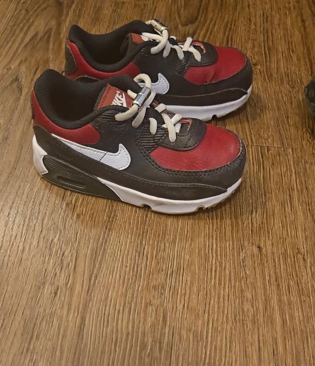 10Selling a pair of Nike Air Max 90 toddler shoes in red and black. They are in good condition and ready for a new home! Size 8c
