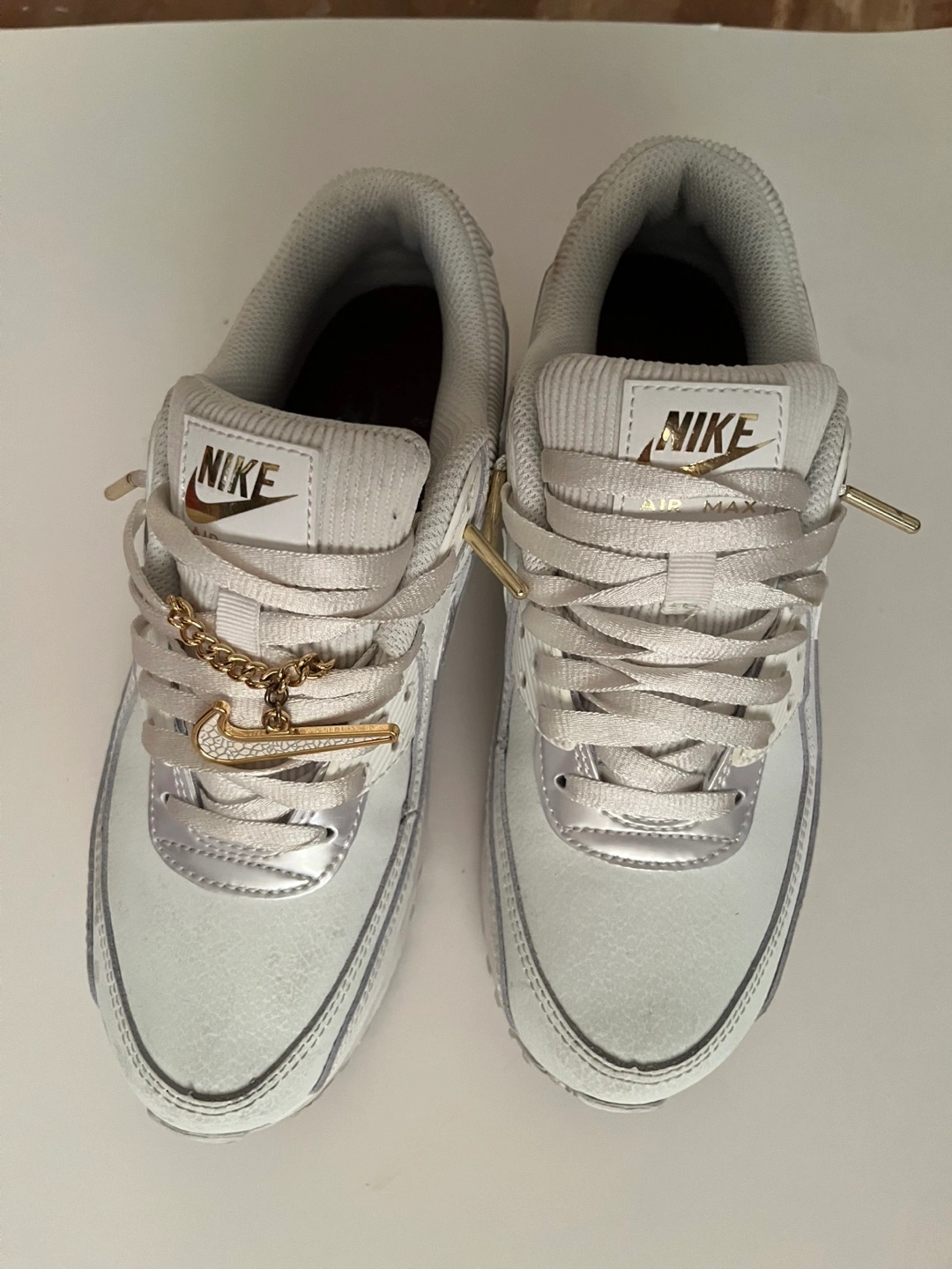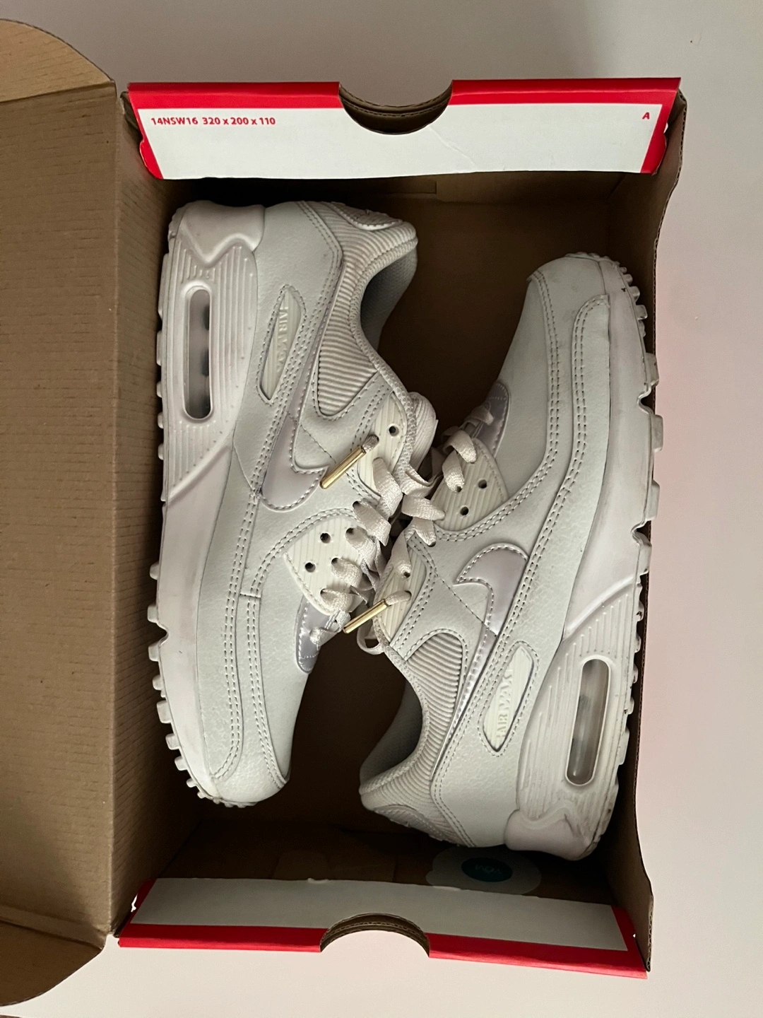 26Women's Nike Air Max 90 sneakers. Size 8.5. White leather upper. Gold accents. Comes in original box.