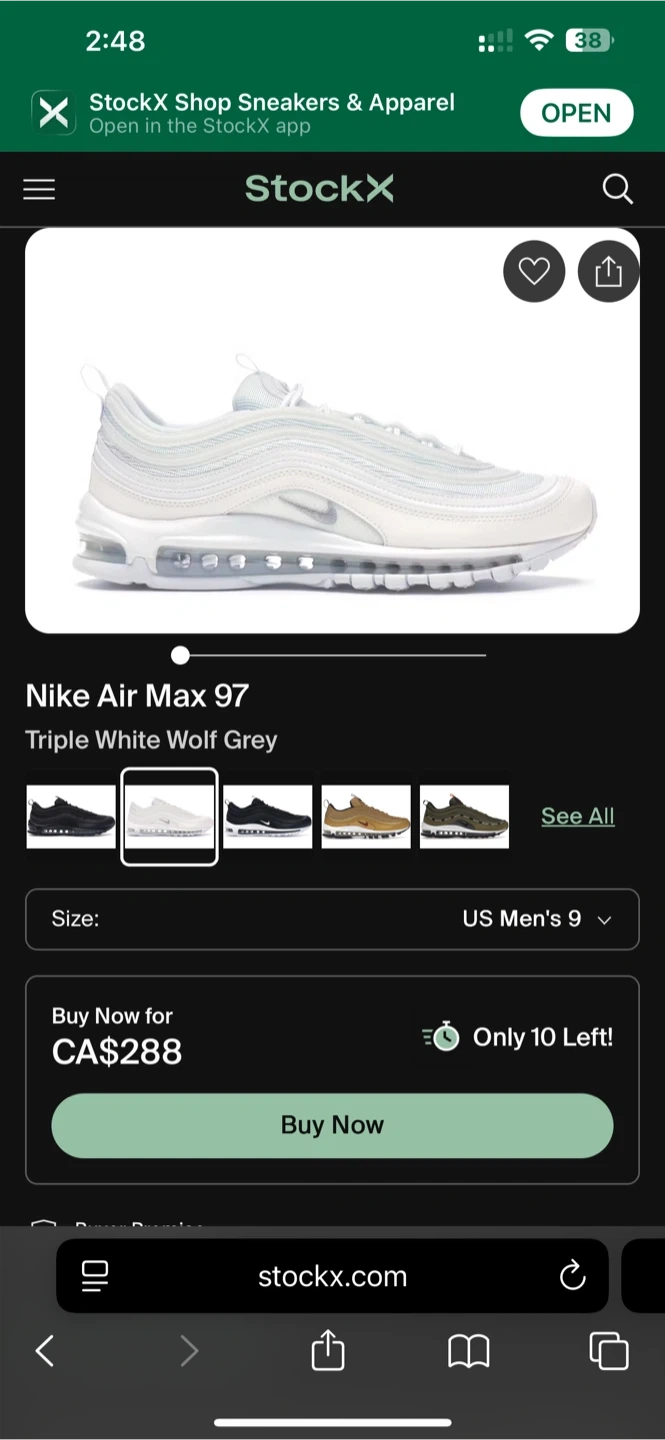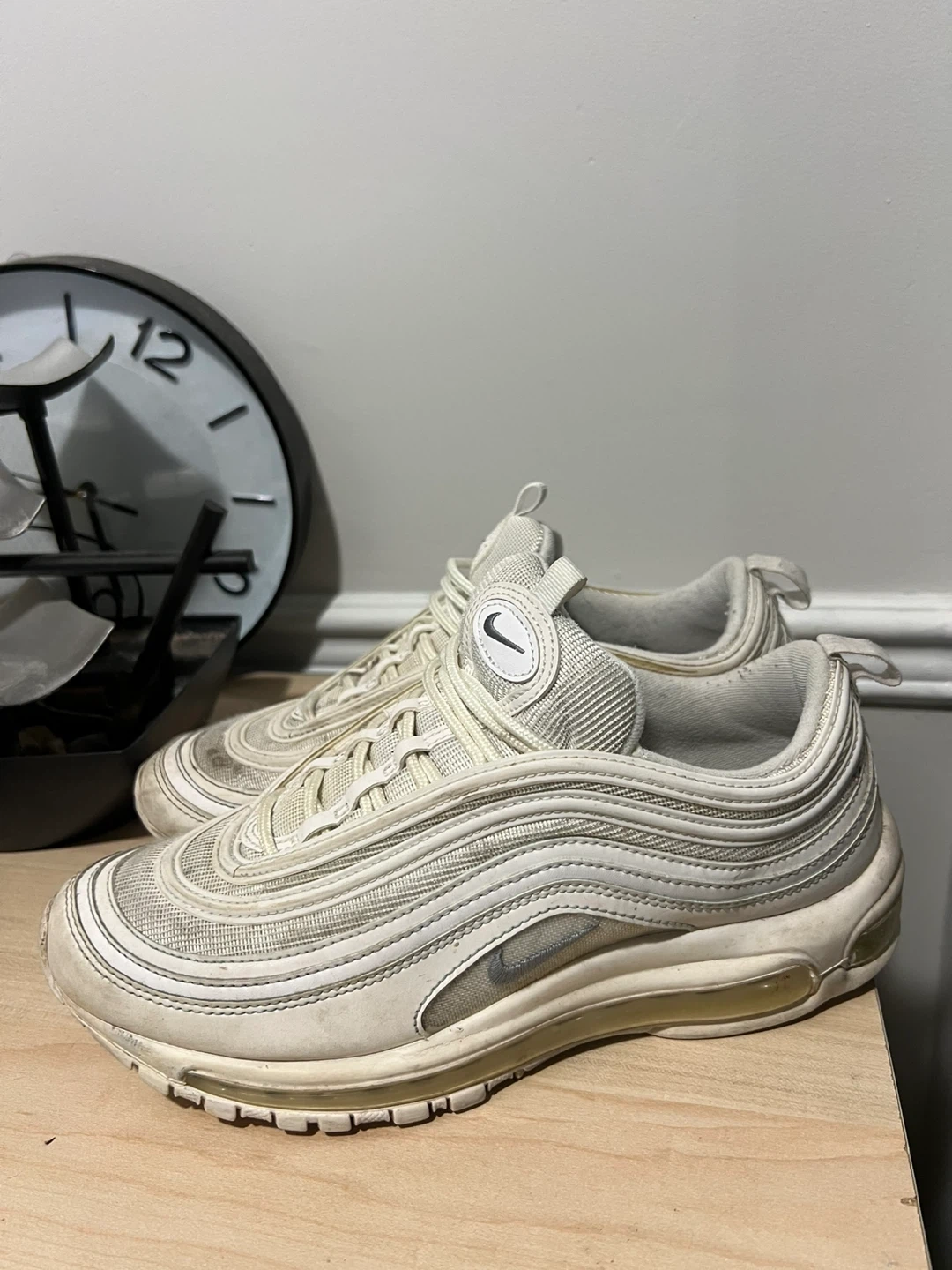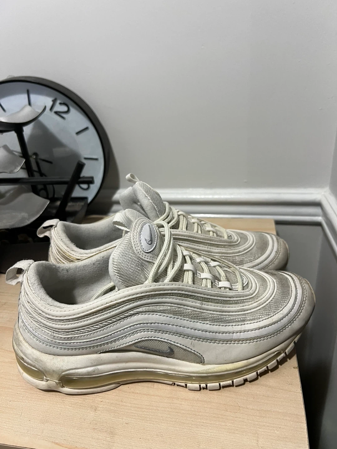 10Selling a pair of Nike Air Max 97 in Triple White Wolf Grey, size US Men's 9. They show signs of wear, but still have lots of life left