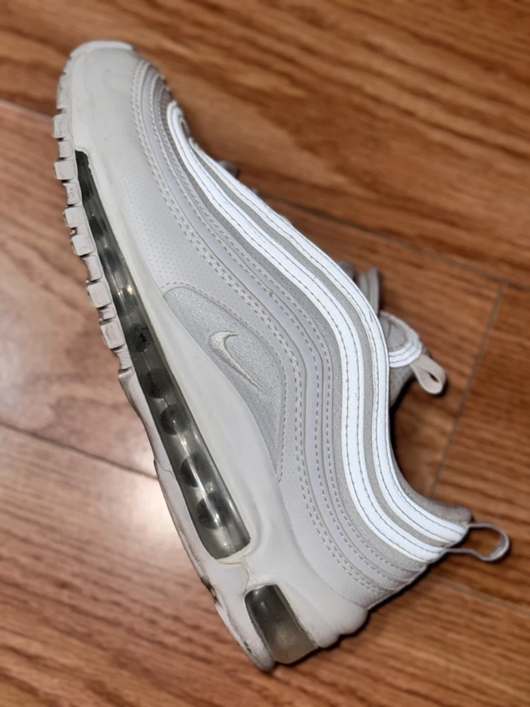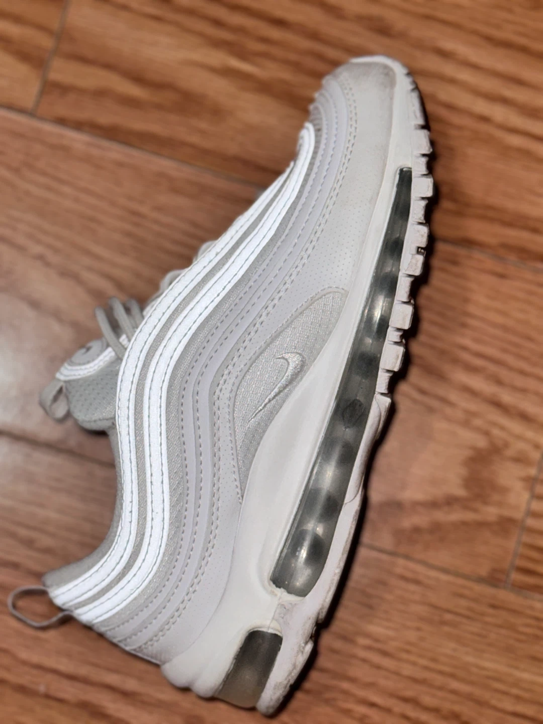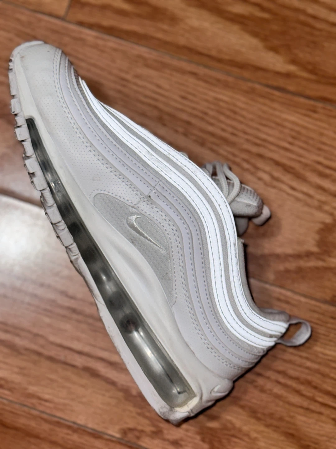 56Selling a pair of Nike Air Max 97 sneakers in white. They show some signs of wear but are still in good condition for everyday use. Great for adding a classic touch to your outfit! Kids size Slightly used For pick up and meet up only!