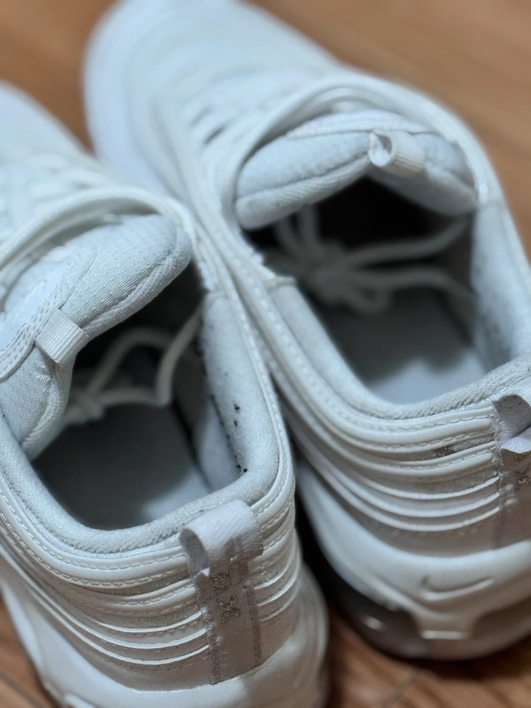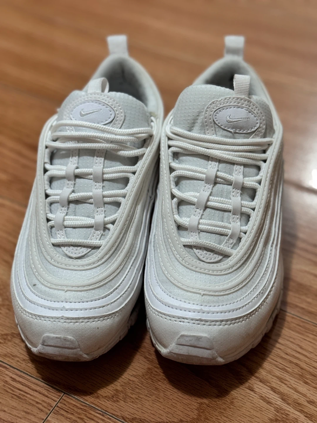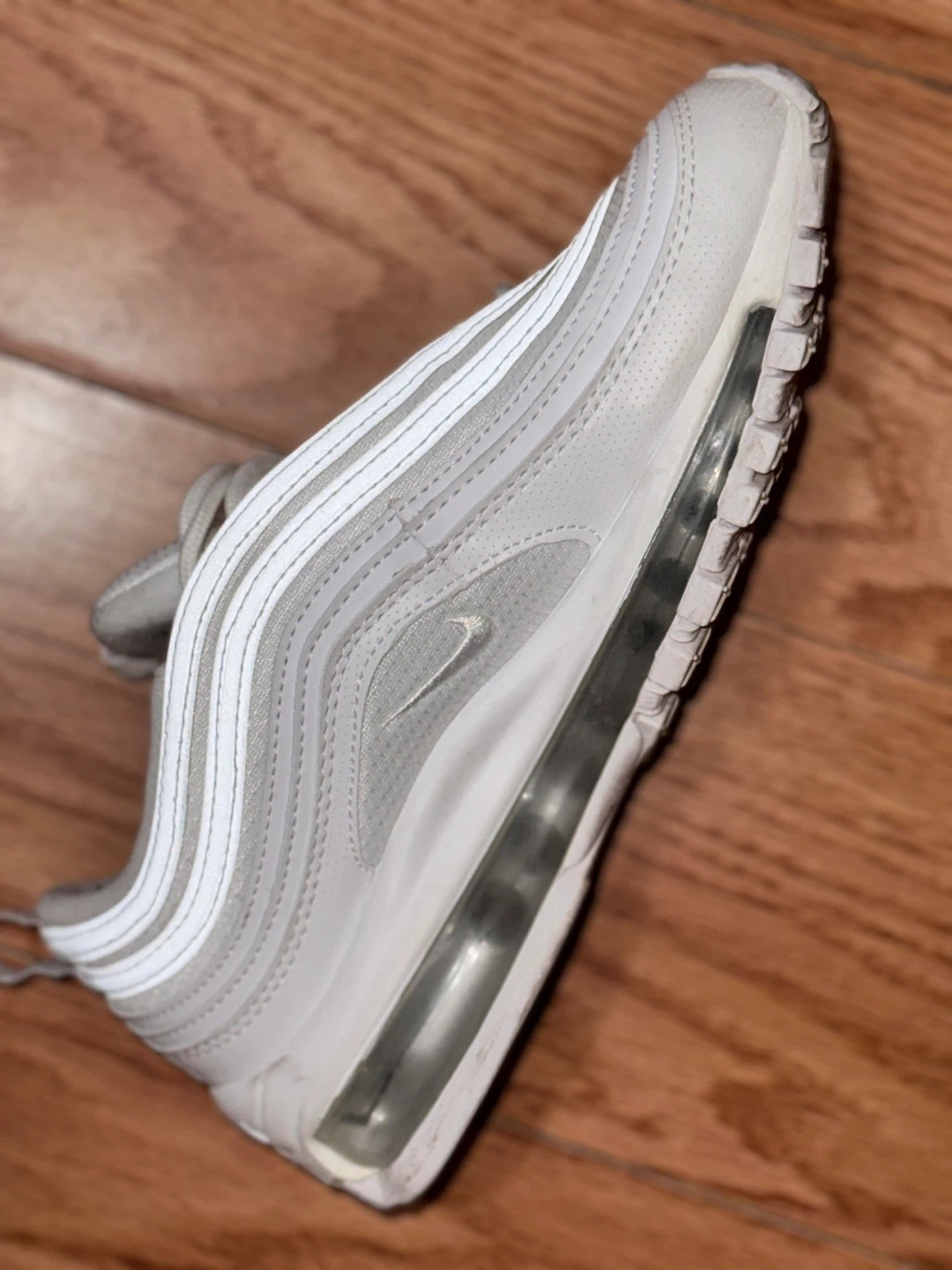 56Selling a pair of Nike Air Max 97 sneakers in white. They show some signs of wear but are still in good condition for everyday use. Great for adding a classic touch to your outfit! Kids size Slightly used For pick up and meet up only!