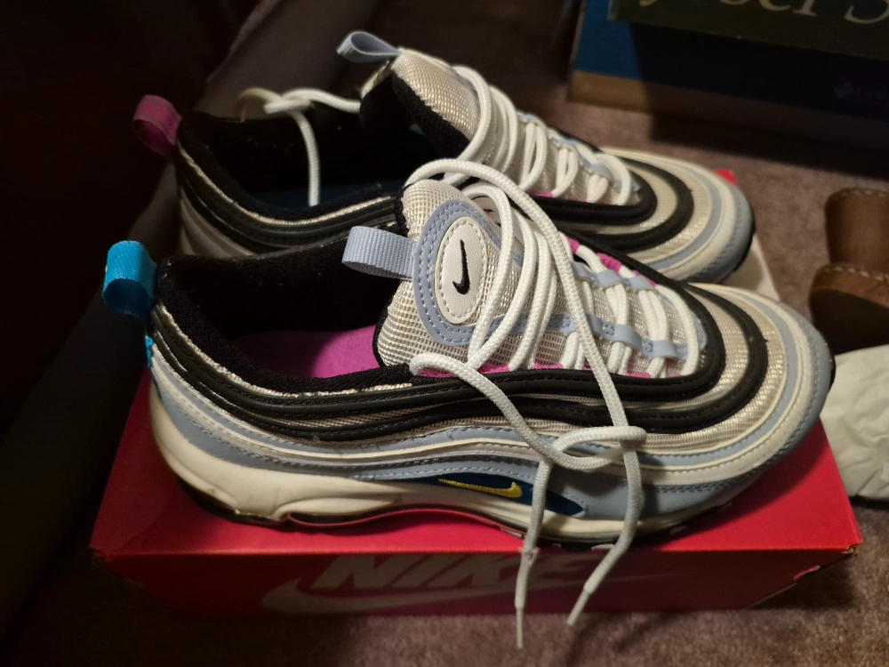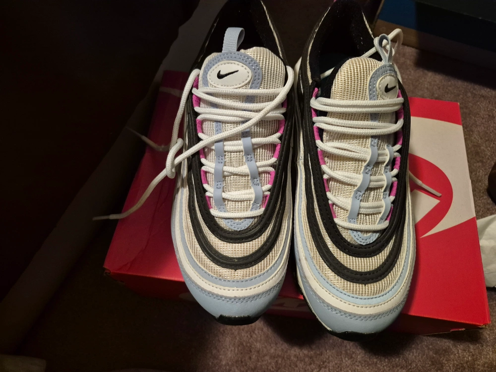 10Selling a pair of Nike Air Max 97. They feature a stylish design with a mix of light blue, pink, and black accents. These shoes are comfortable and great for everyday wear. The original box is included!