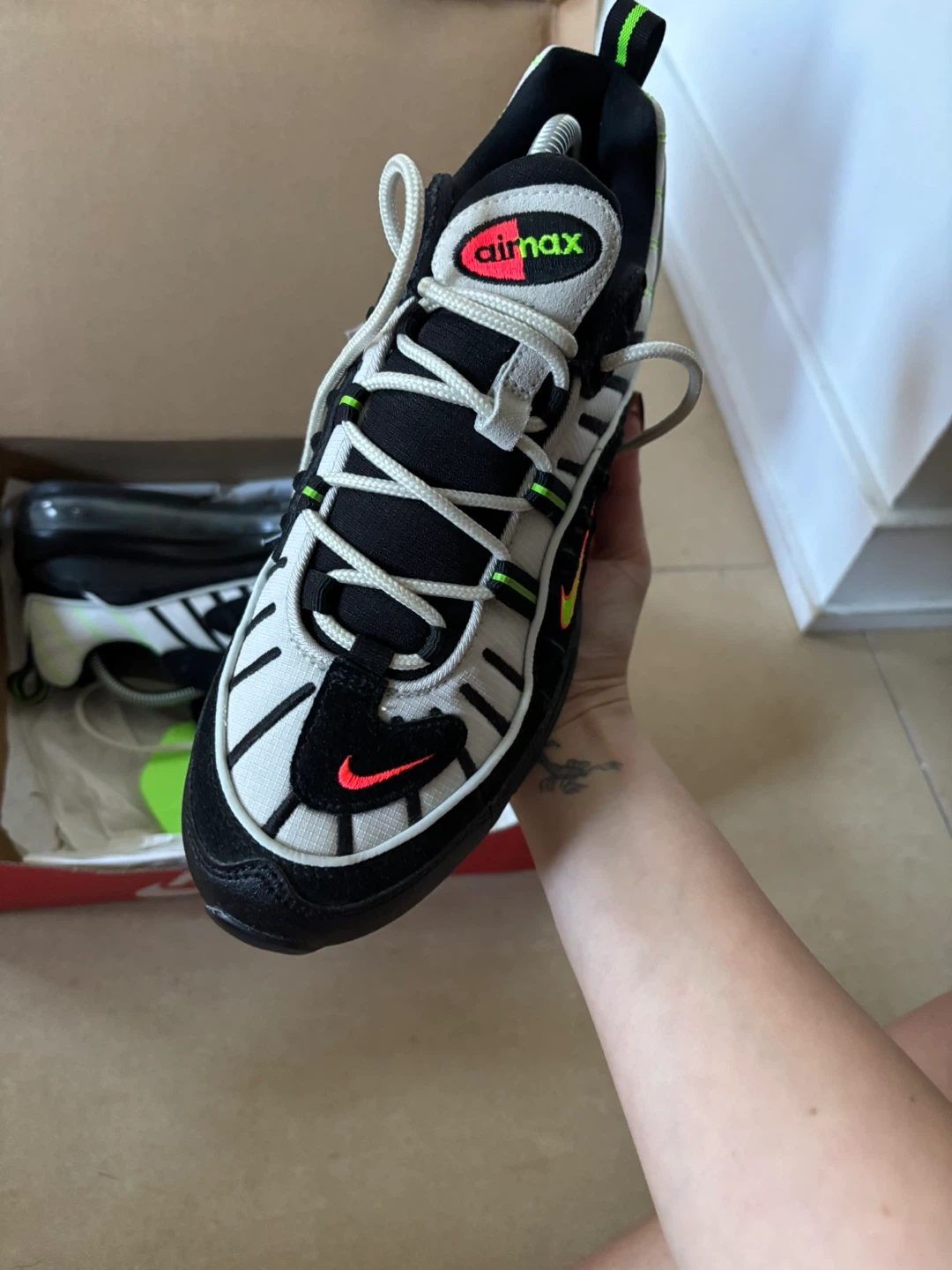 10Selling a pair of Nike Air Max 98 in Platinum Tint/Black! They are a US size 8.5, UK size 7.5, EUR size 42, and CM 26.5. Comes with the original box