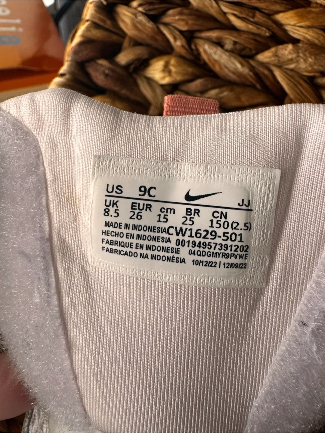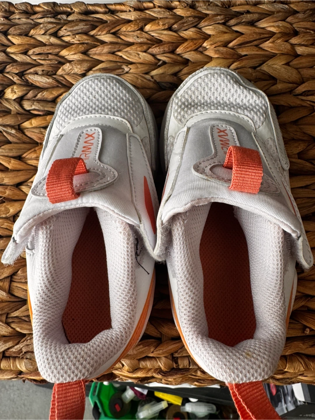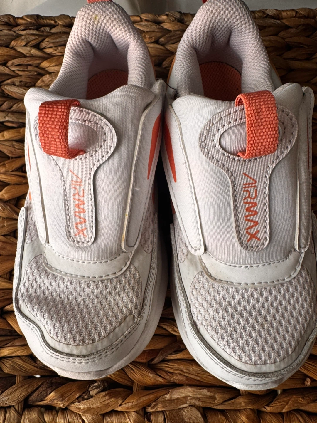 10Selling a pair of Nike Air Max kids shoes, size 9C. They're white with orange accents. The shoes have some signs of wear, but still have lots of life left in them!