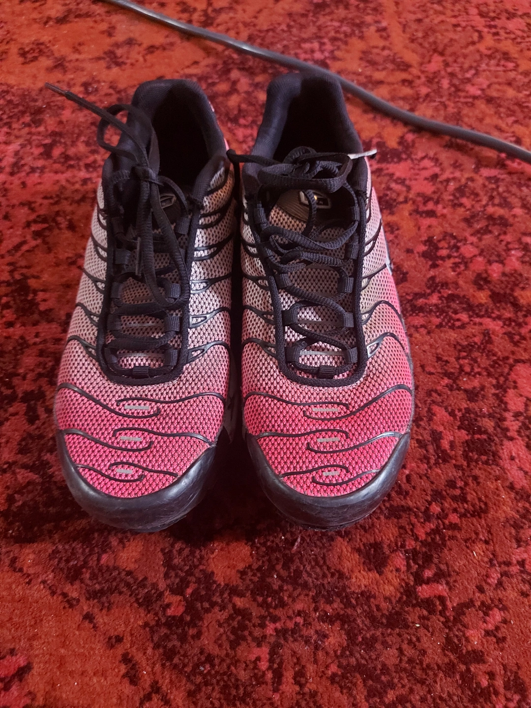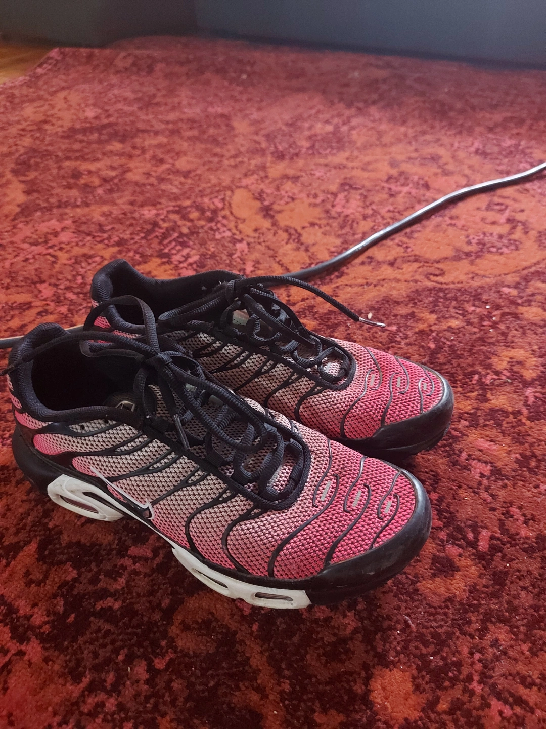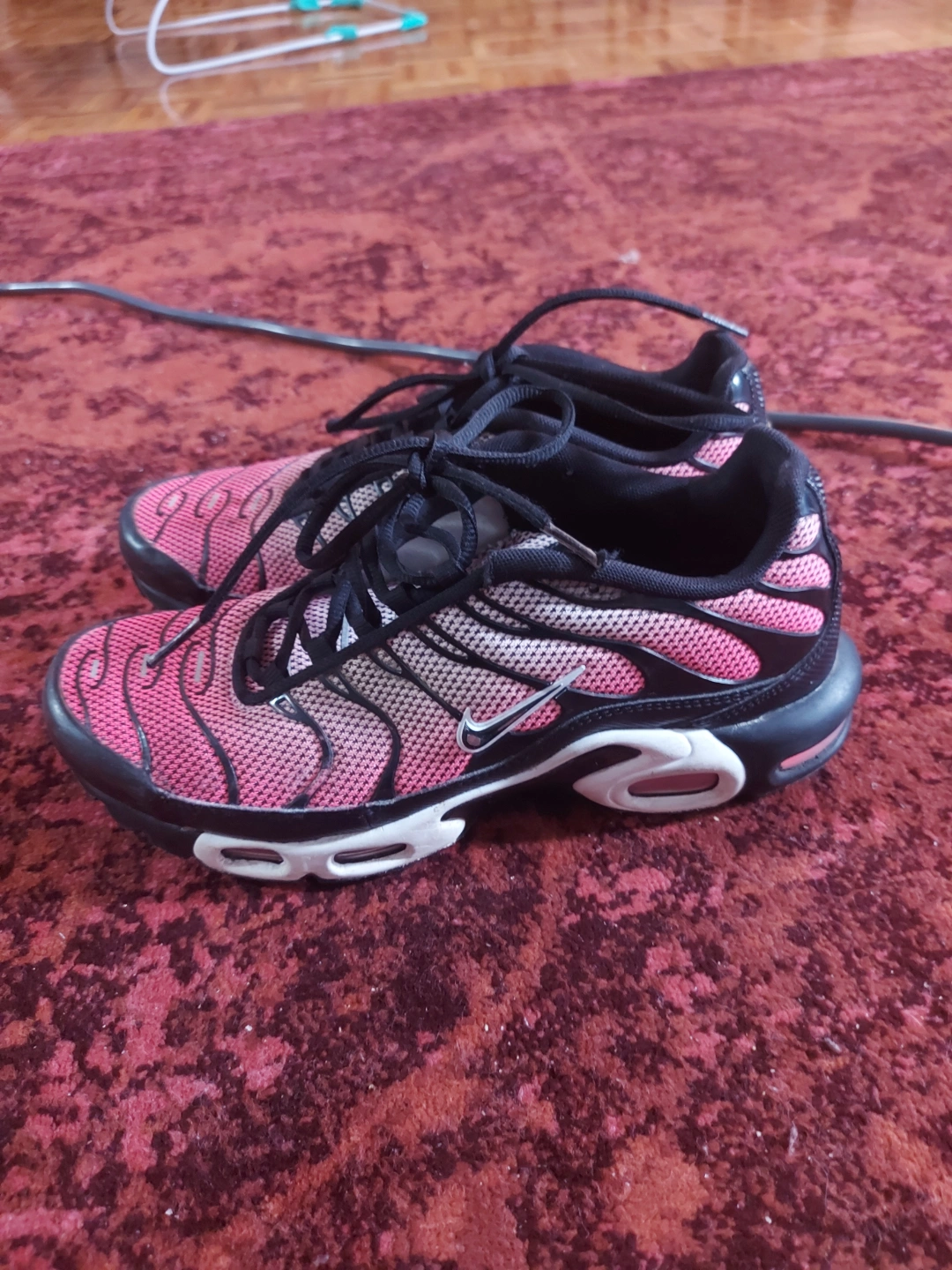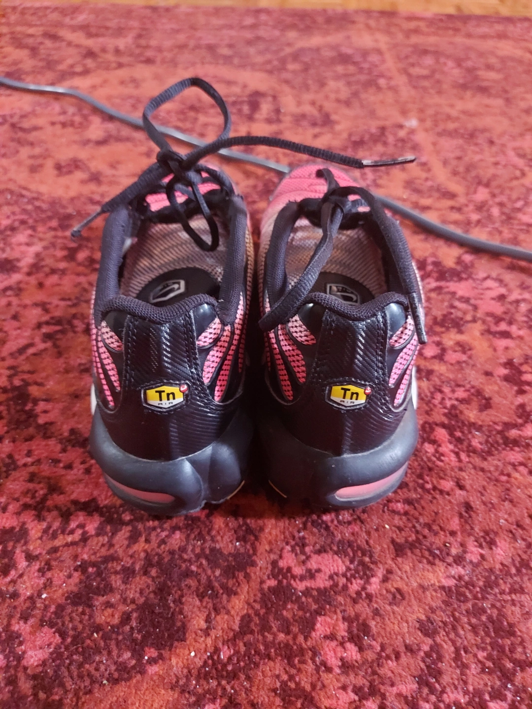 Pink and black sneakers. Laces are black. White accents. A great pair to wear while out for a walk.