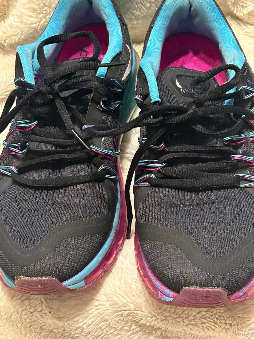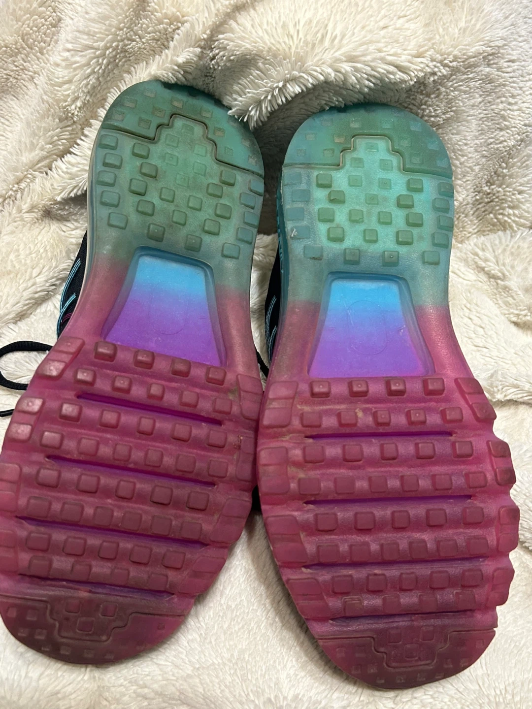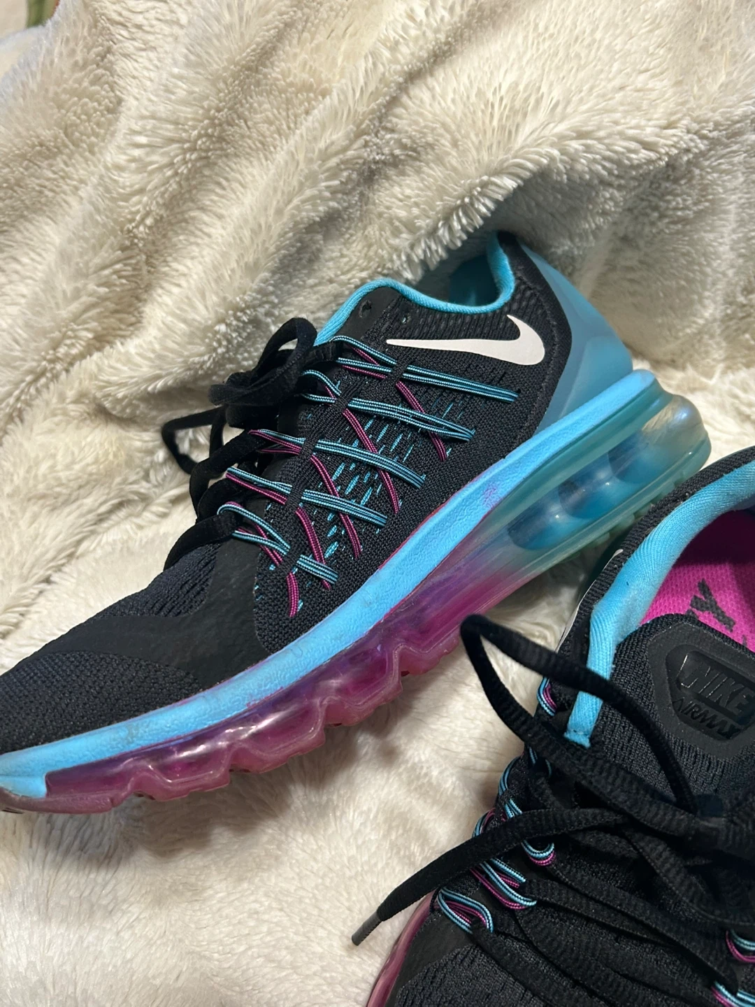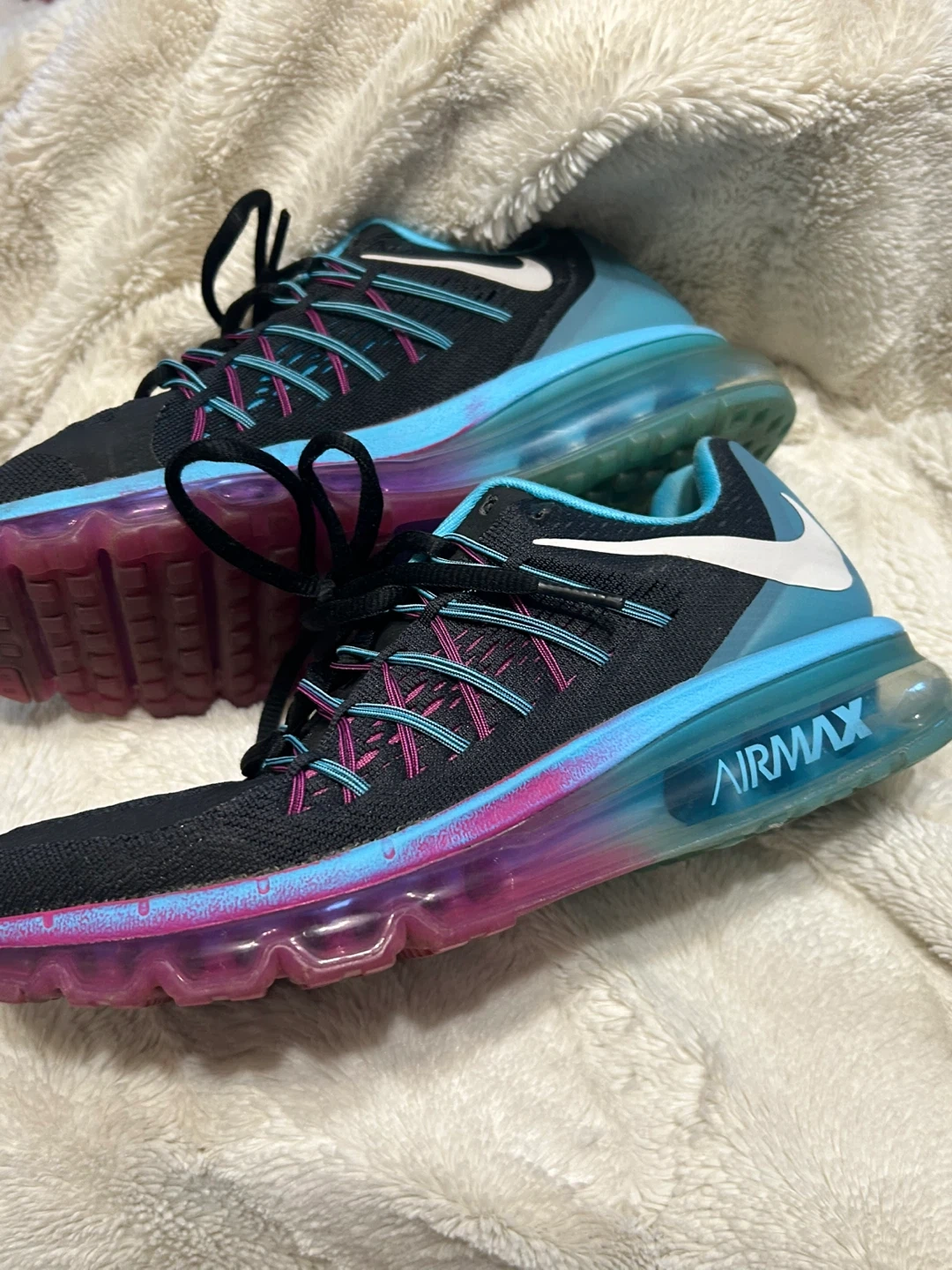 354Selling a pair of Nike Air Max running shoes! They're in good condition and ready for a new home. The shoes feature a black upper with accents of light blue and pink. The soles have a unique gradient design with pink, purple, and green hues