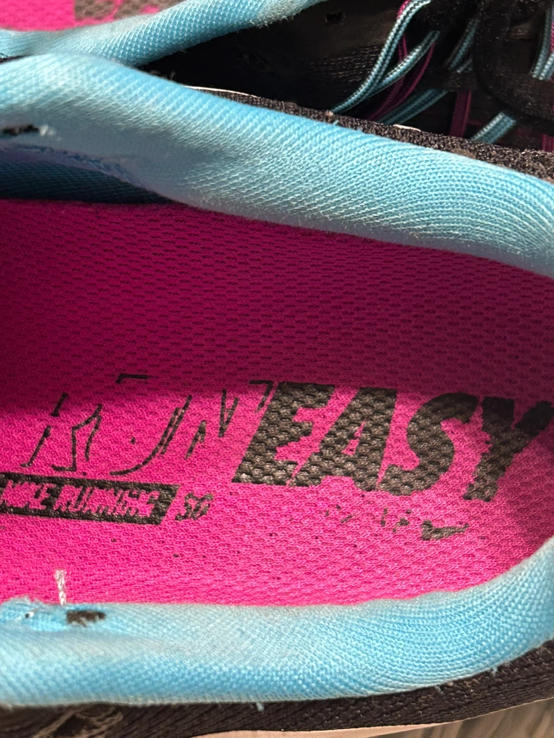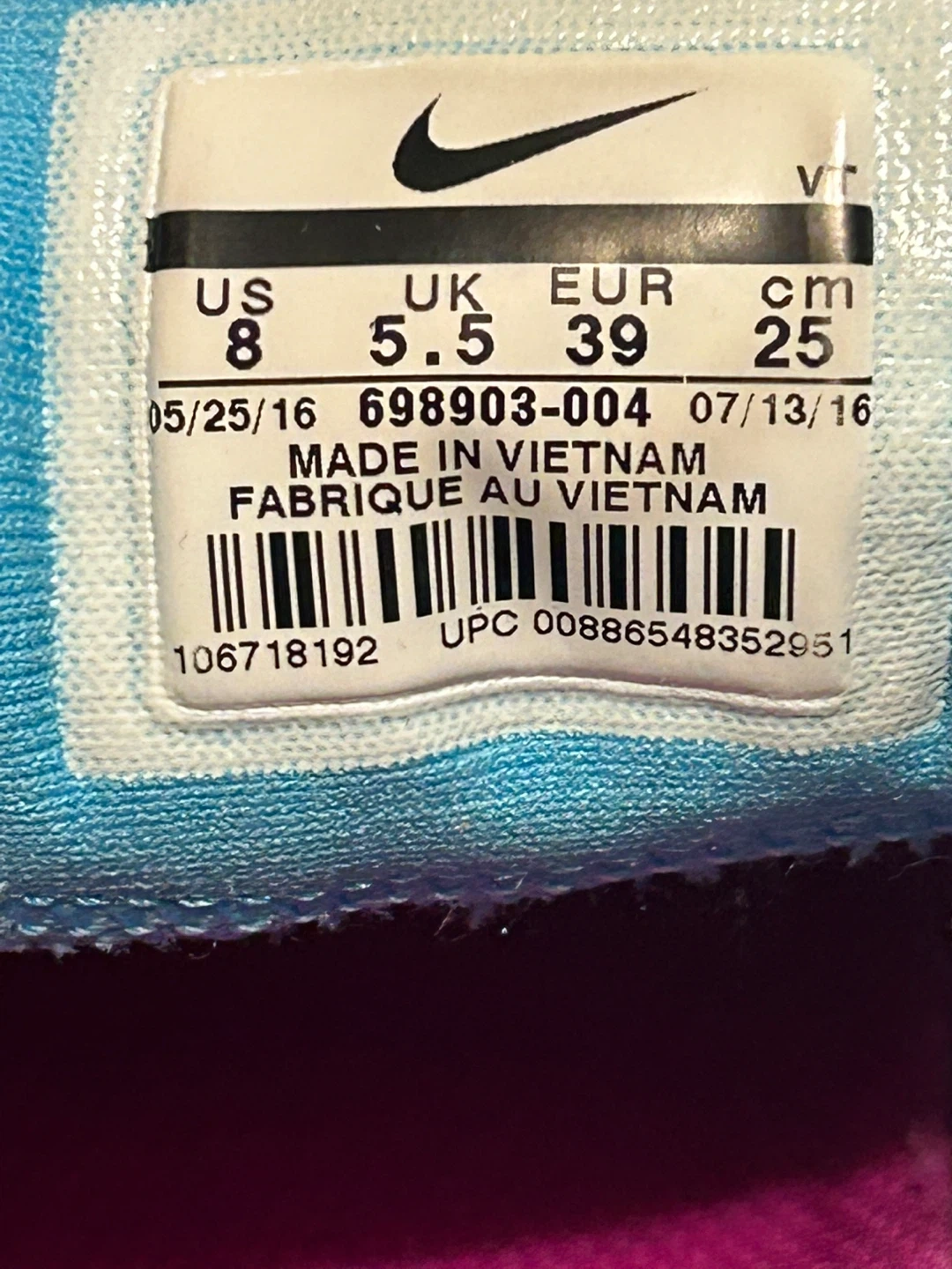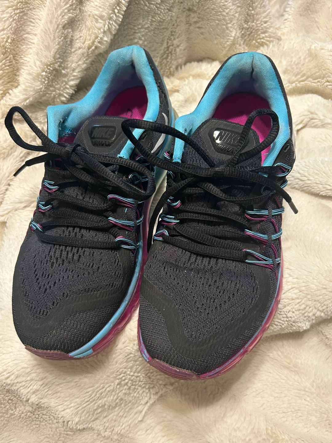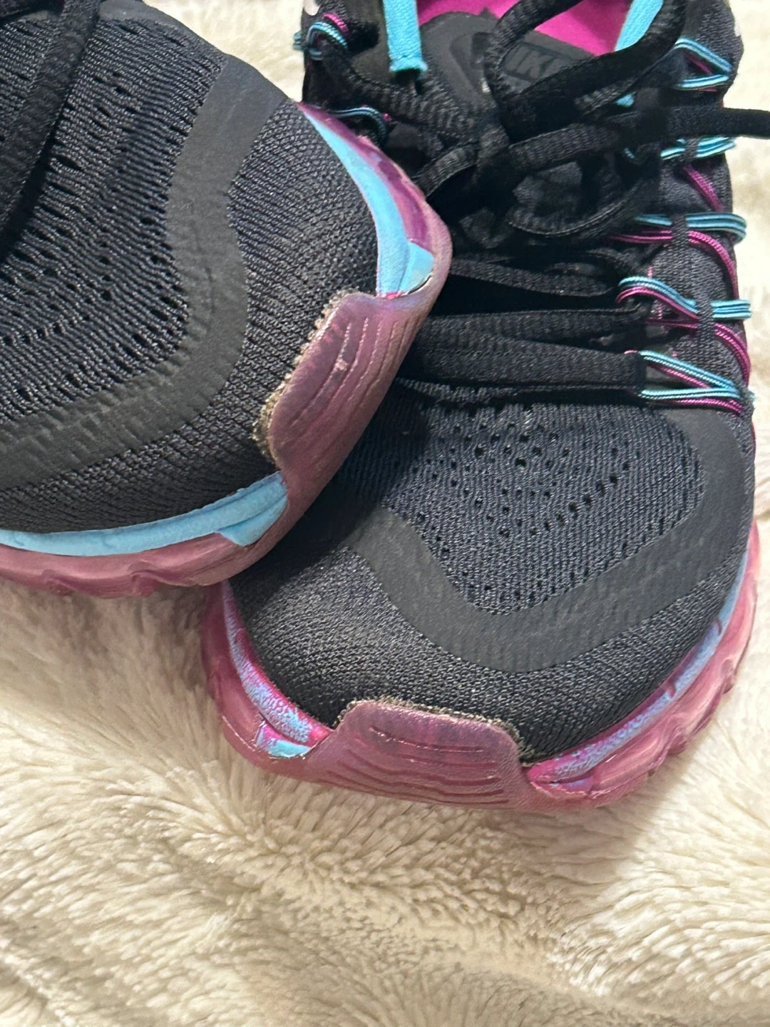 354Selling a pair of Nike Air Max running shoes! They're in good condition and ready for a new home. The shoes feature a black upper with accents of light blue and pink. The soles have a unique gradient design with pink, purple, and green hues