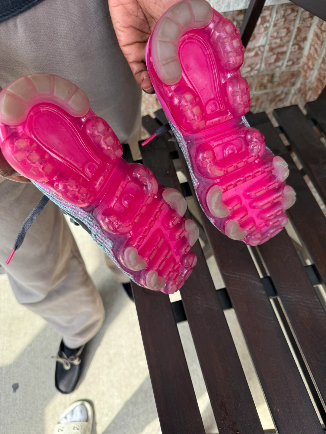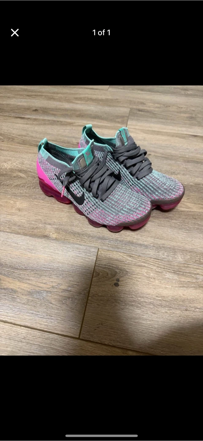 Selling a pair of Nike Air VaporMax 360 sneakers! They feature a unique design with the iconic VaporMax sole for ultimate comfort and style. The colourway is a mix of grey, pink, and teal, making them a standout addition to your footwear collection