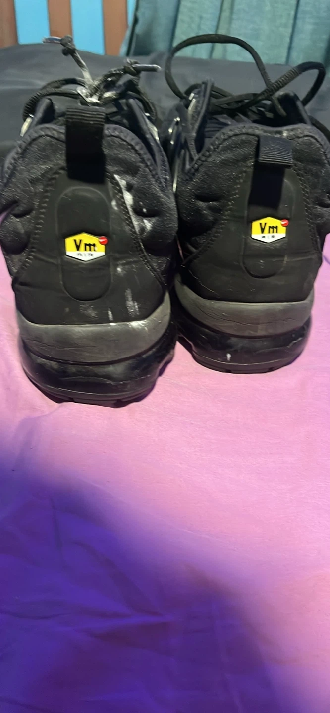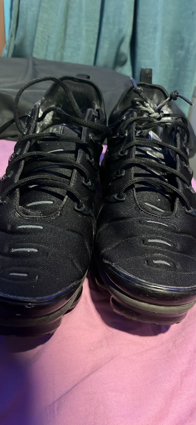Selling a pair of Nike Air Vapormax Plus in black! They show some signs of wear, as you can see in the photos, but still have lots of life left. Great for everyday wear or hitting the gym!