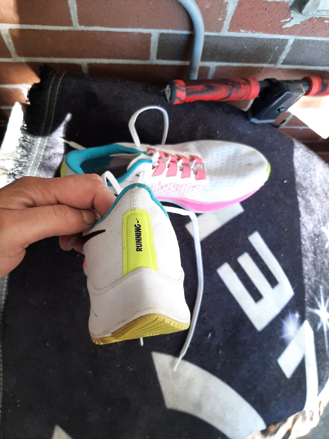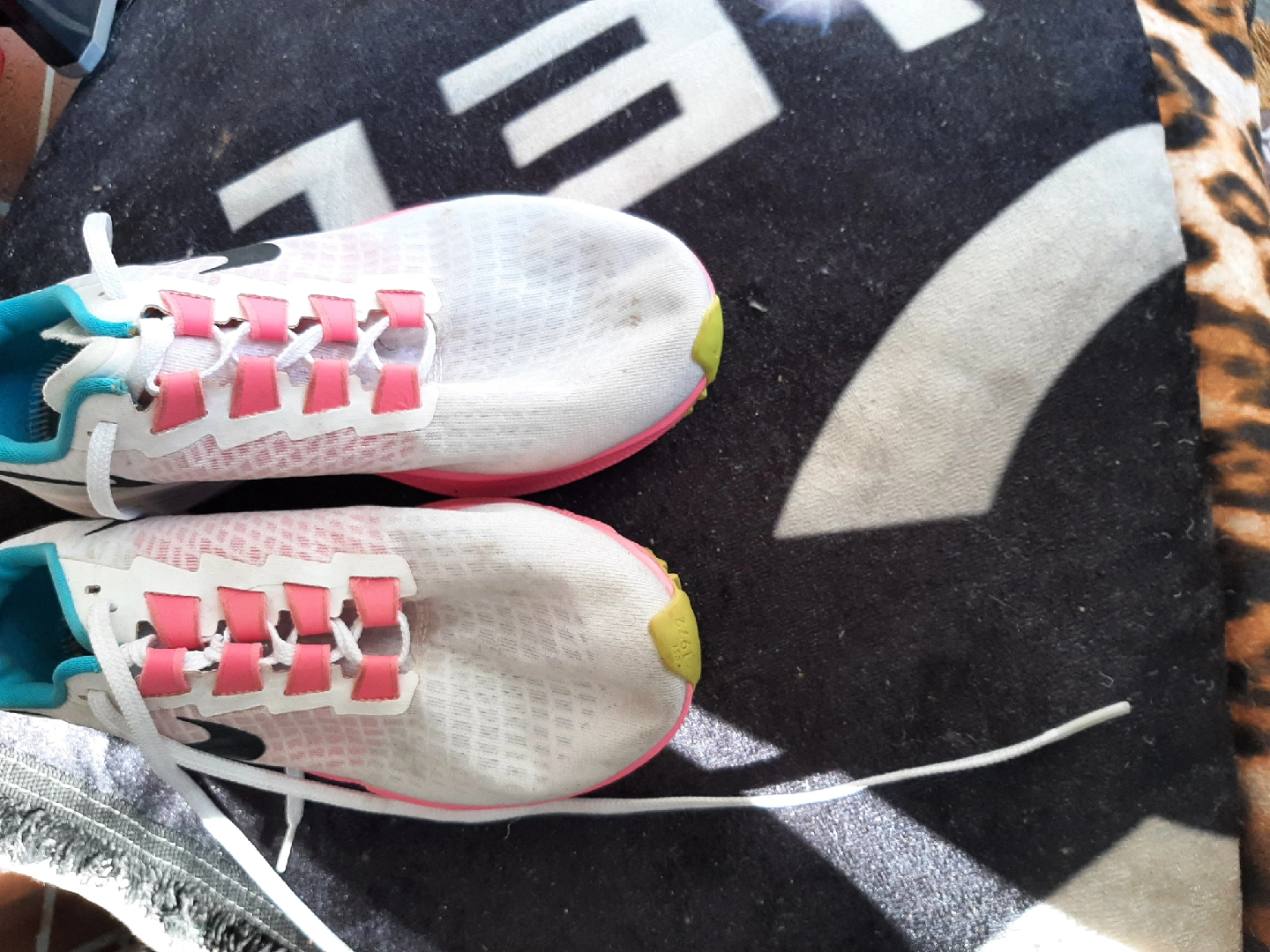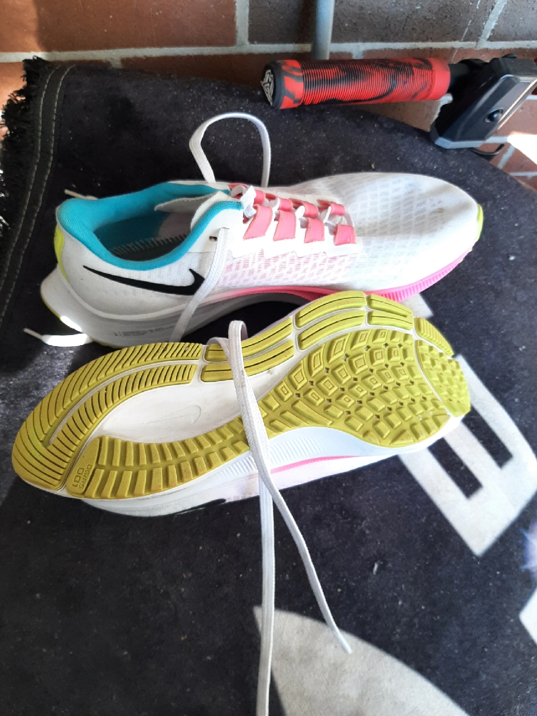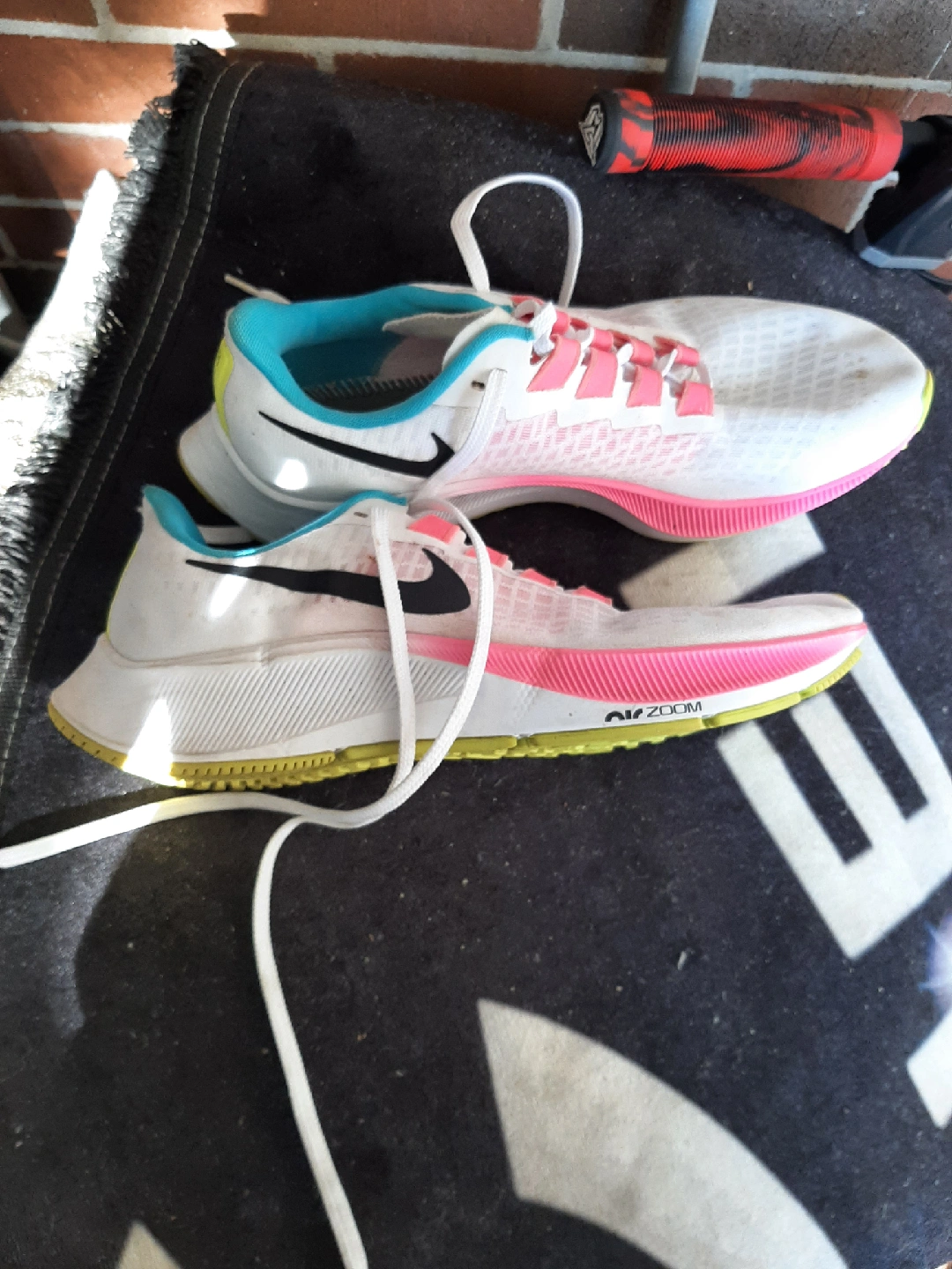 Selling a pair of Nike Air Zoom Pegasus 37 women's running shoes in size 9 US. They show some signs of wear, but are still in good condition for running or casual wear. The shoes feature a white, pink, and turquoise colour scheme with the iconic Nike swoosh. Great for jogging or everyday use!